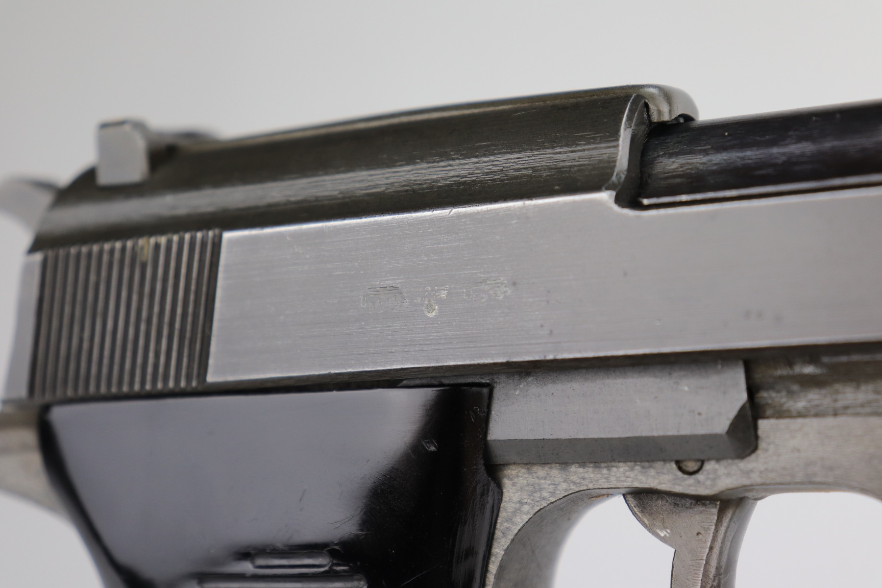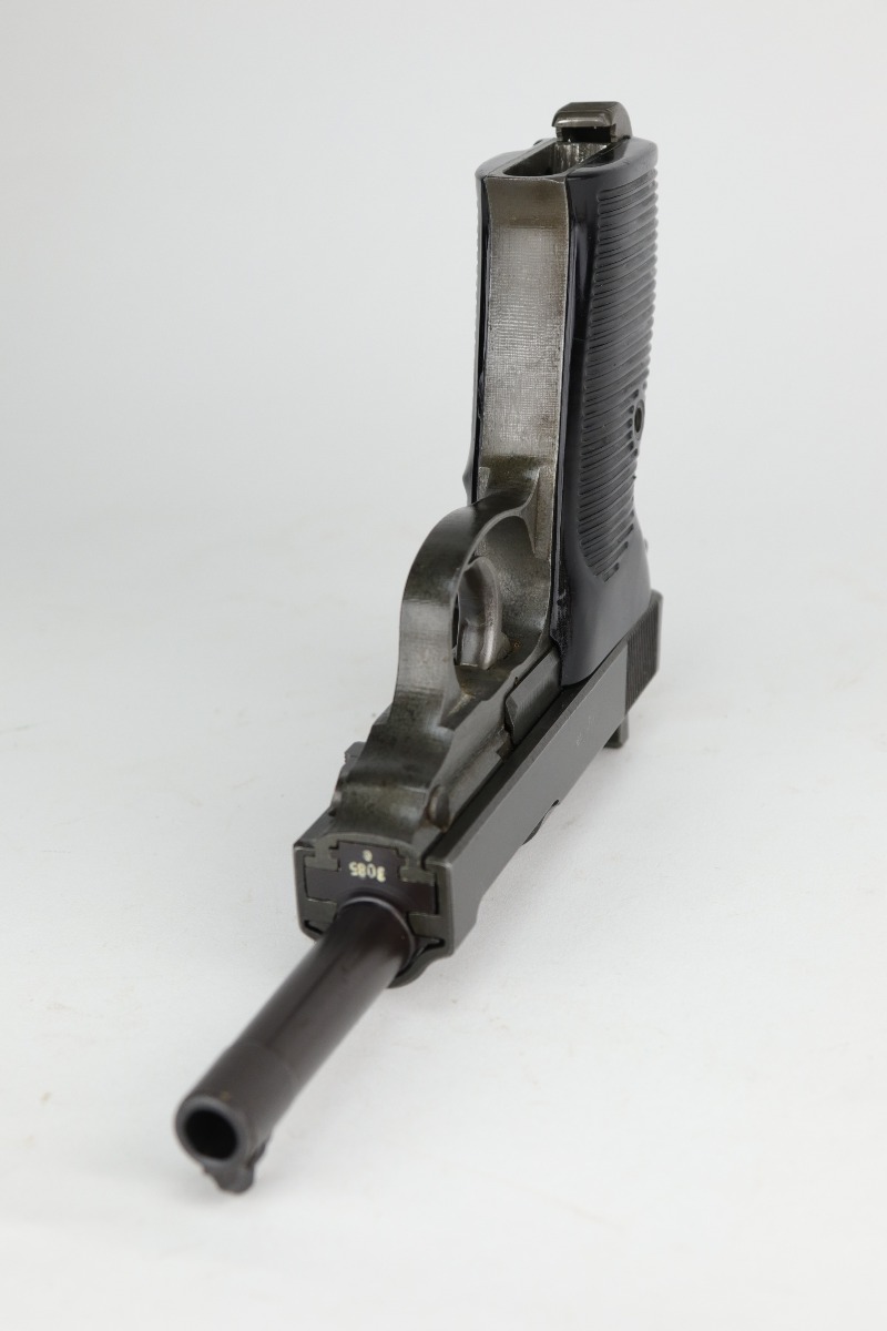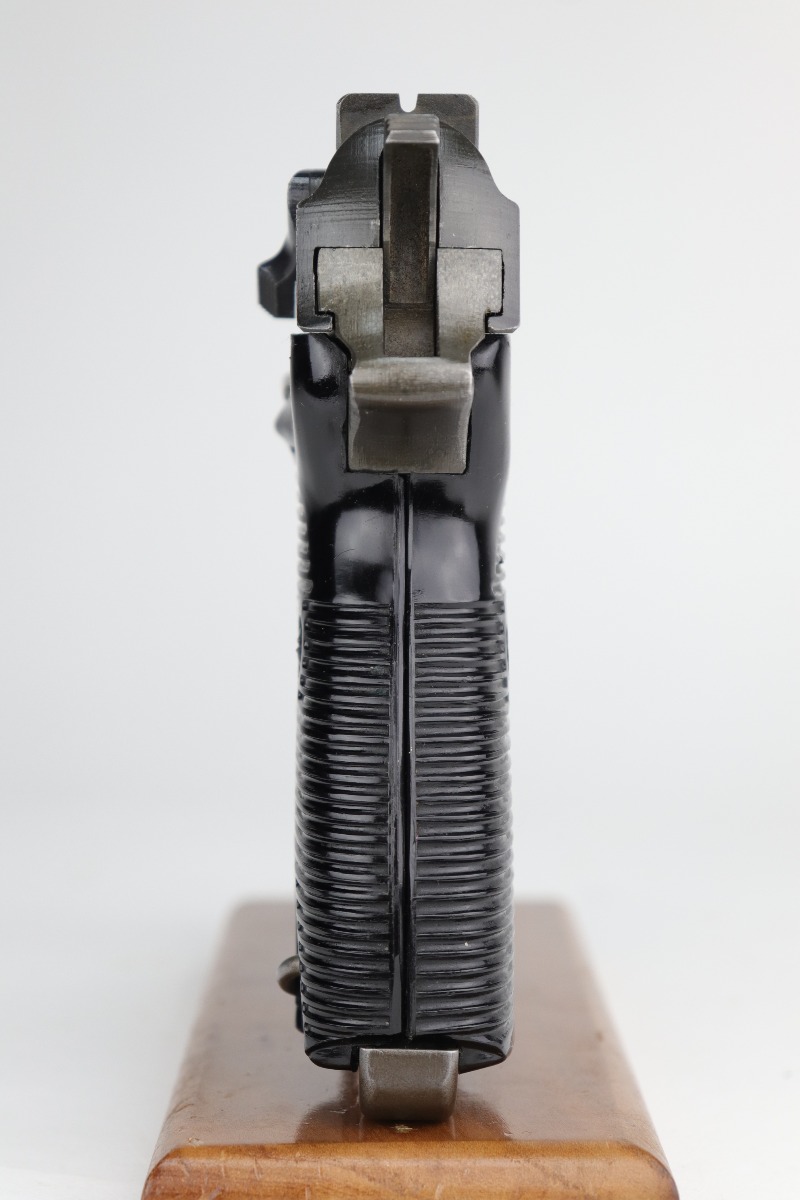 10/2/20 – This is a minty example of a Dual-tone Mauser P.38 issued to the Nazi military in 1944. The blued slide and barrel and phosphate frame give it that characteristic dual-tone appearance. The gun is all matching and has the proper “Waffen 135” Nazi military acceptance proofs. It is fully functional, including the de-cocker. The gun is in minty condition. It is a little difficult to rate given the nature of the phosphate frame, but we estimate it has retained 98-99% of its original finish. One could make an argument that there is almost no apparent wear at all. There is very minor high edge wear on the slide, maybe some thinning on the front strap, and spotty discoloration on the phosphate frame throughout. Excellent grips – just a few scuffs on the left panel. Comes with a period correct magazine – it has a dented and scratched base. The bore is absolutely mint.