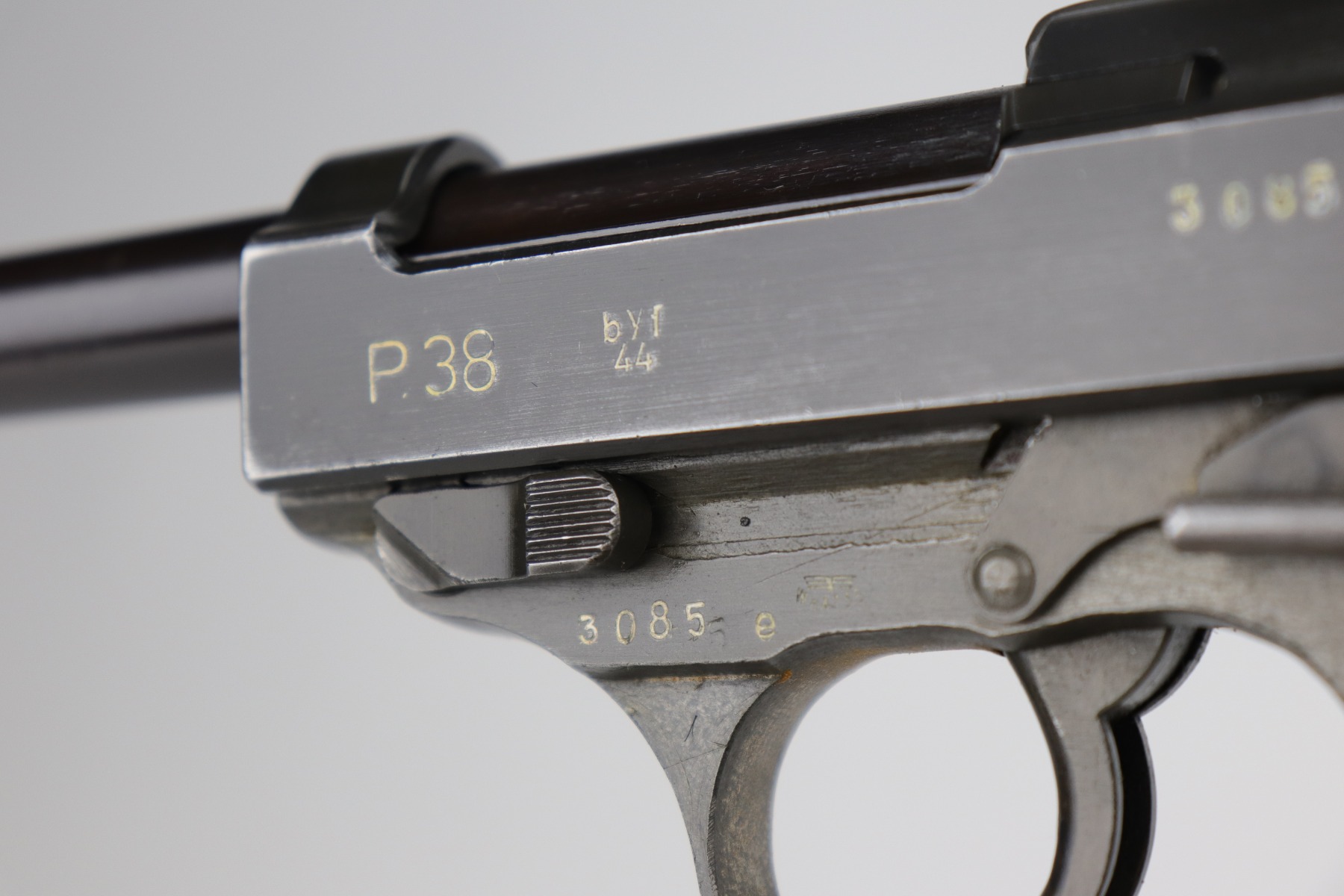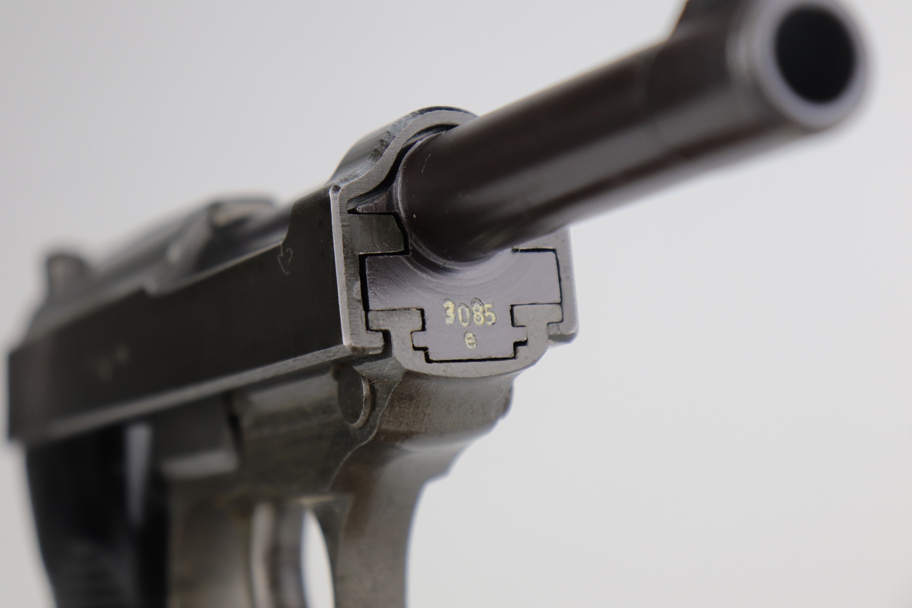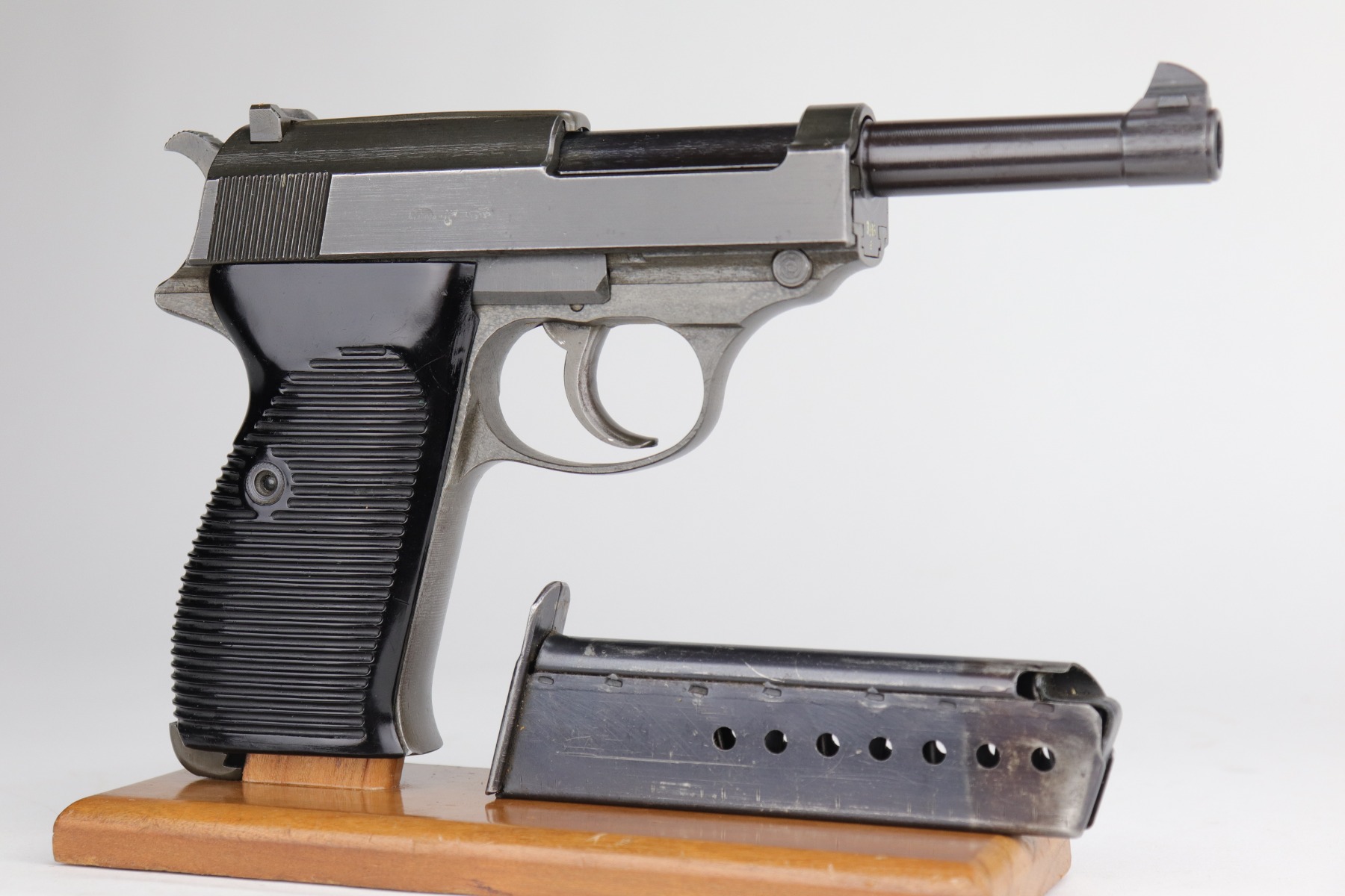 10/2/20 – This is a minty example of a Dual-tone Mauser P.38 issued to the Nazi military in 1944. The blued slide and barrel and phosphate frame give it that characteristic dual-tone appearance. The gun is all matching and has the proper “Waffen 135” Nazi military acceptance proofs. It is fully functional, including the de-cocker. The gun is in minty condition. It is a little difficult to rate given the nature of the phosphate frame, but we estimate it has retained 98-99% of its original finish. One could make an argument that there is almost no apparent wear at all. There is very minor high edge wear on the slide, maybe some thinning on the front strap, and spotty discoloration on the phosphate frame throughout. Excellent grips – just a few scuffs on the left panel. Comes with a period correct magazine – it has a dented and scratched base. The bore is absolutely mint.