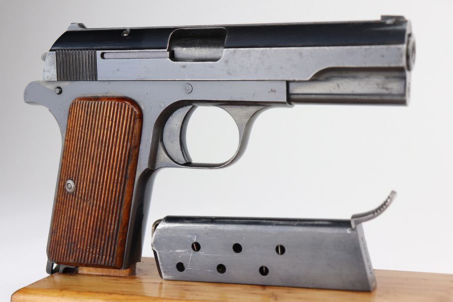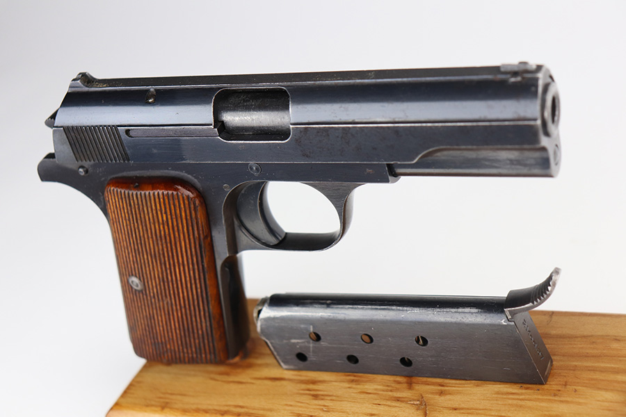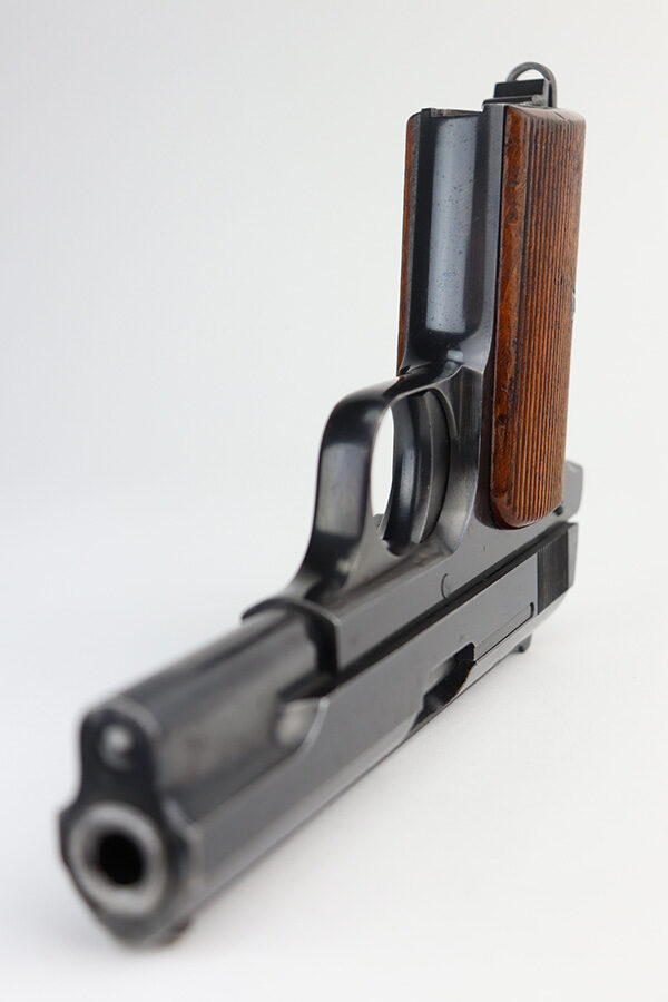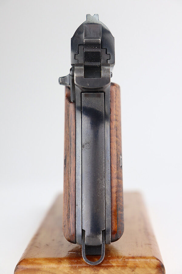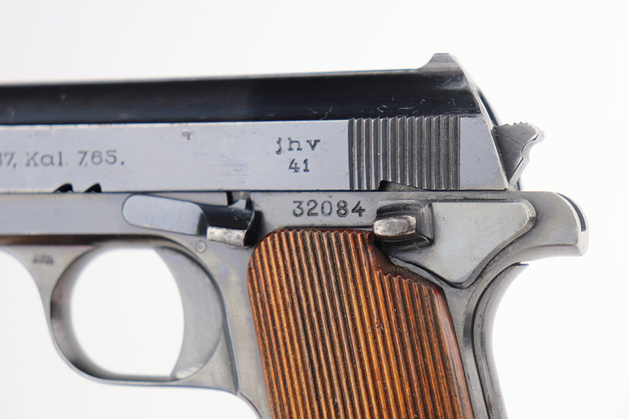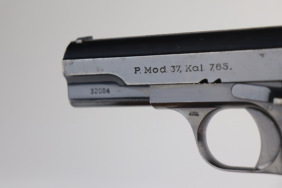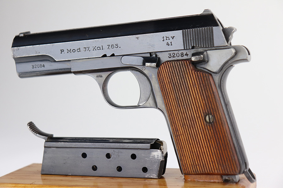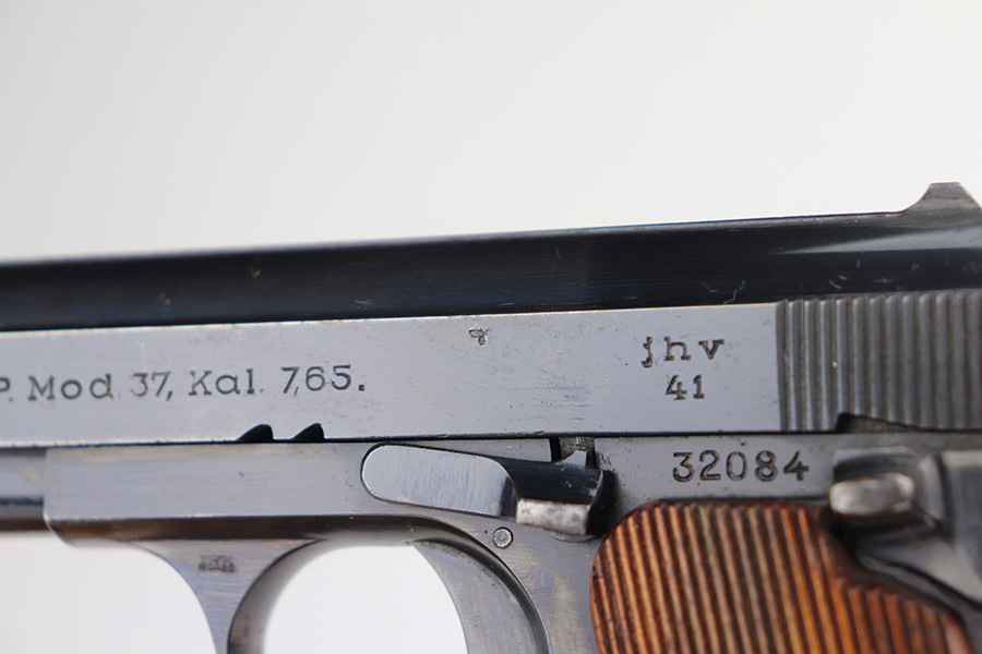 6/15/21 – This is a minty example of a Femaru M37 issued to the Luftwaffe in 1941. The gun is all matching and has the proper waffen military proof. It comes with one original matching magazine. It has retained more than 98% of its bluing with just hints of wear on the high edges of the slide and around the muzzle. While there is very little finish loss, there are tiny dots of oxidation throughout. Comes with excellent grips. Stone-mint bore.