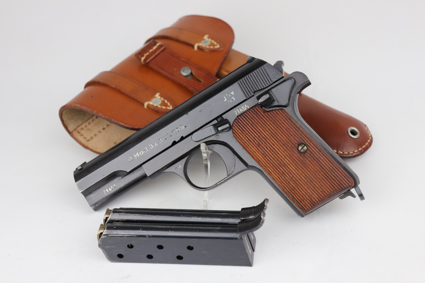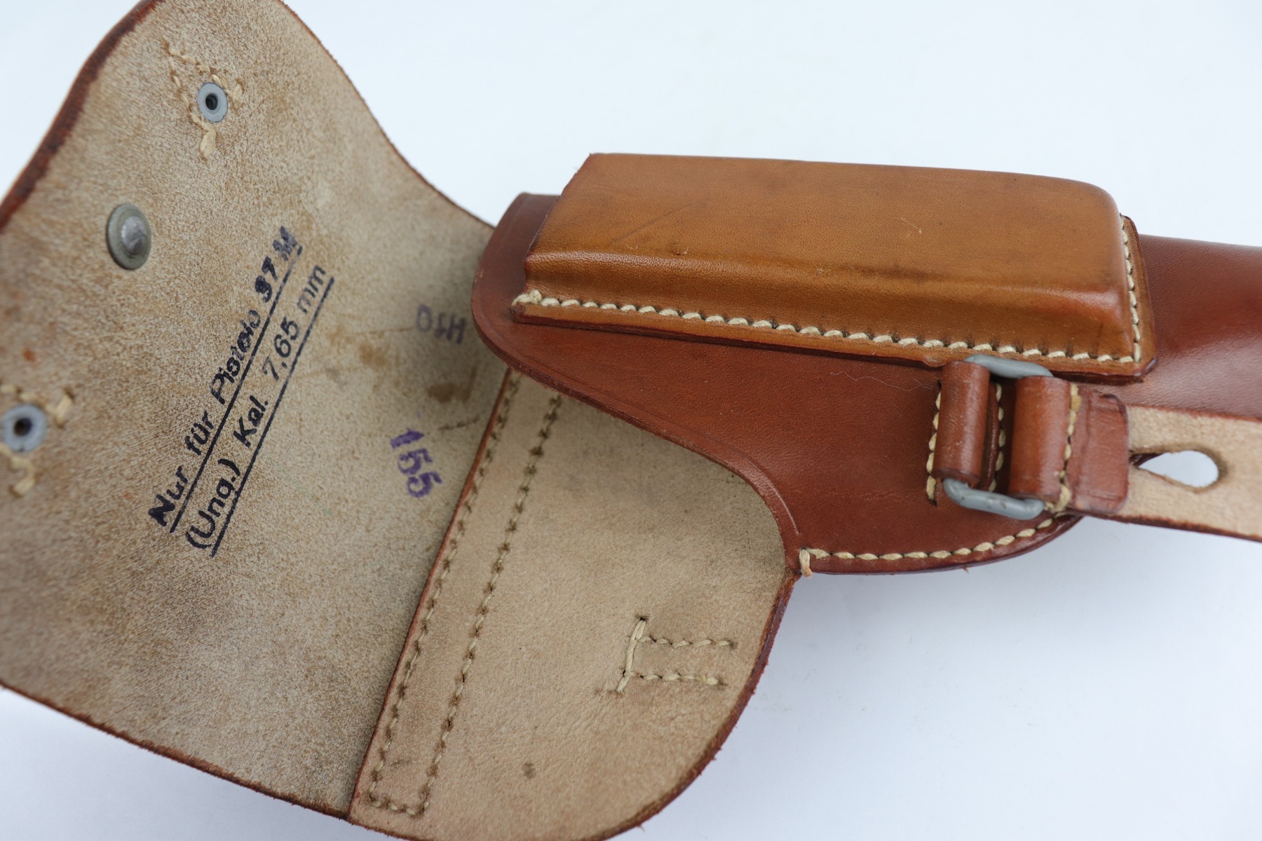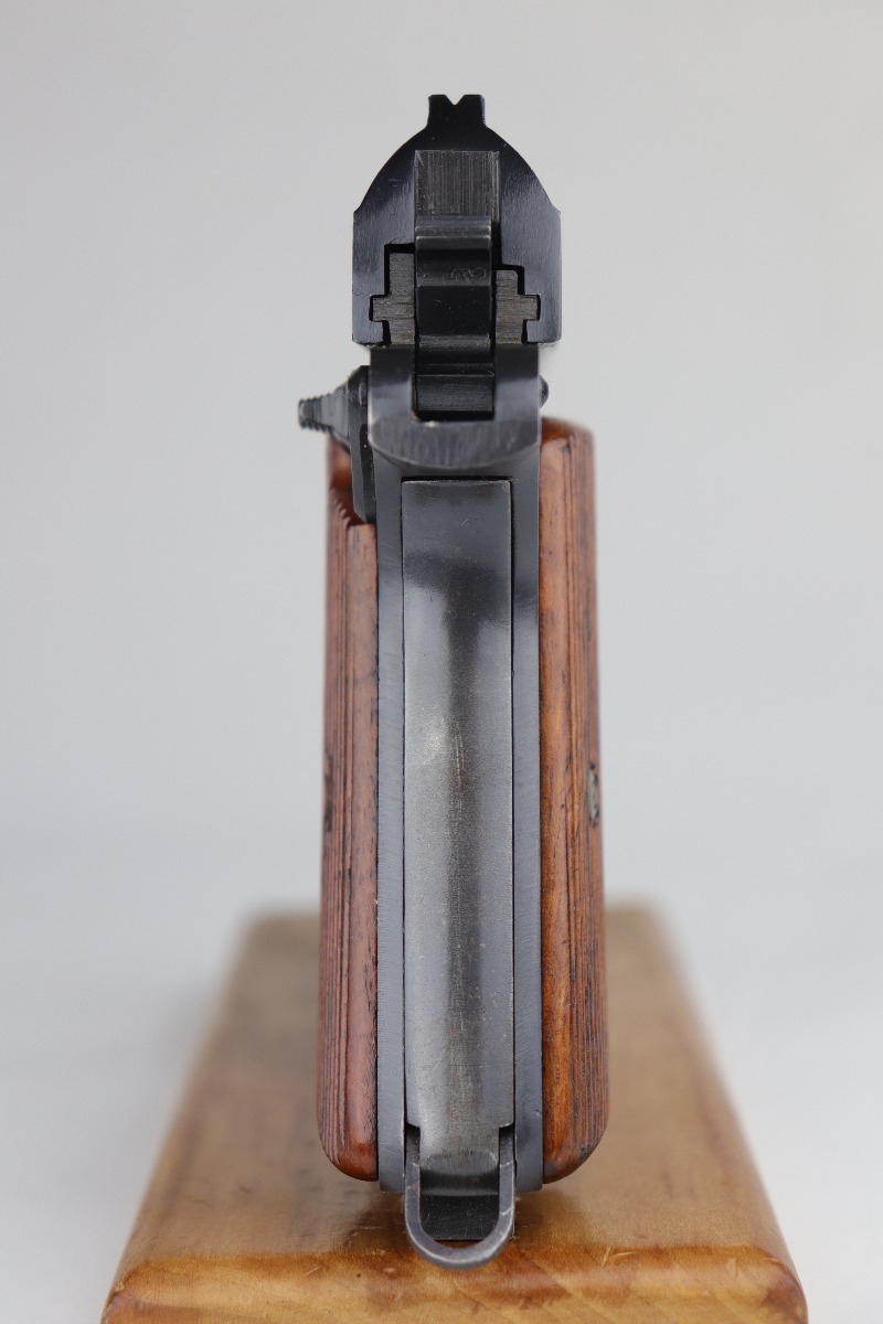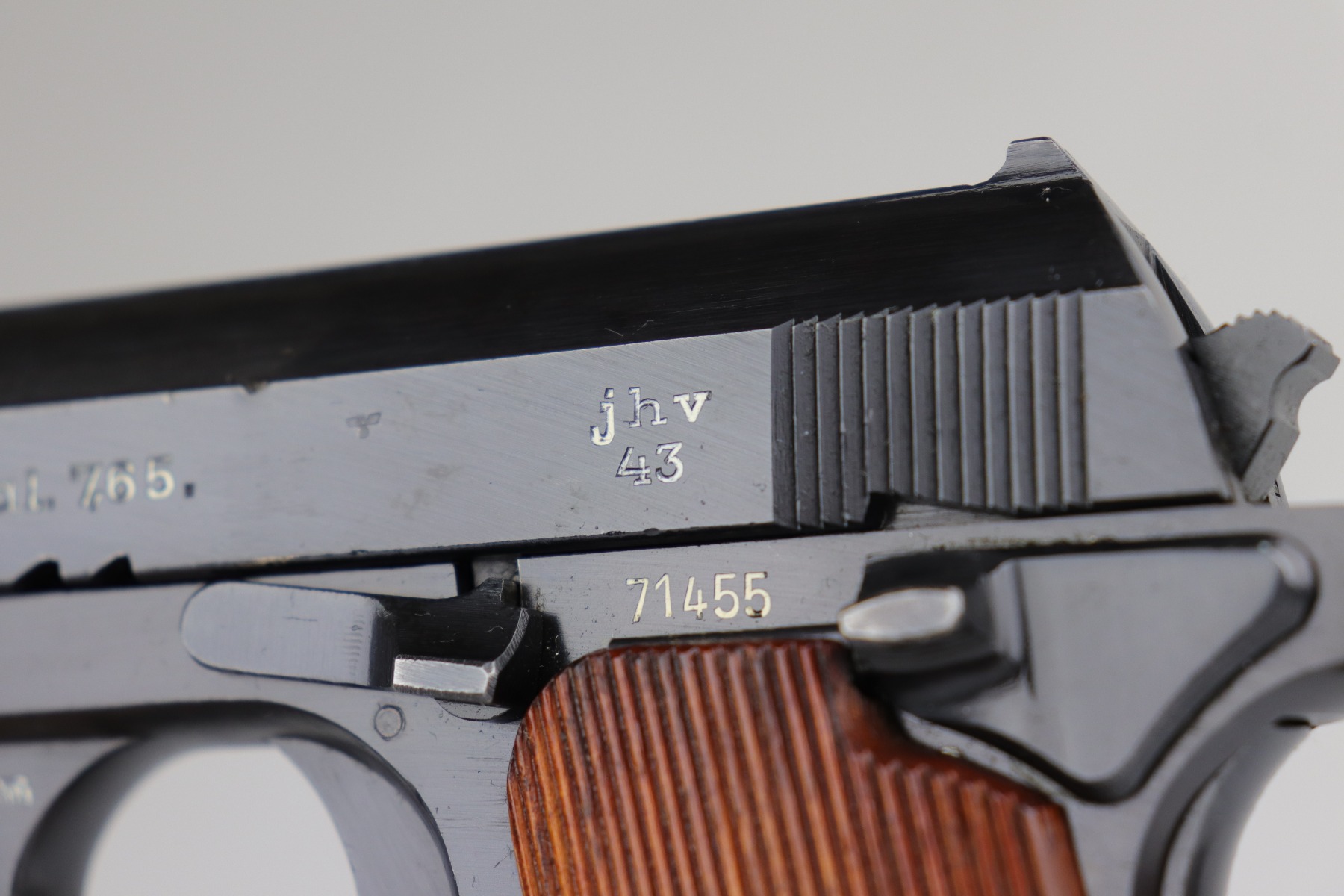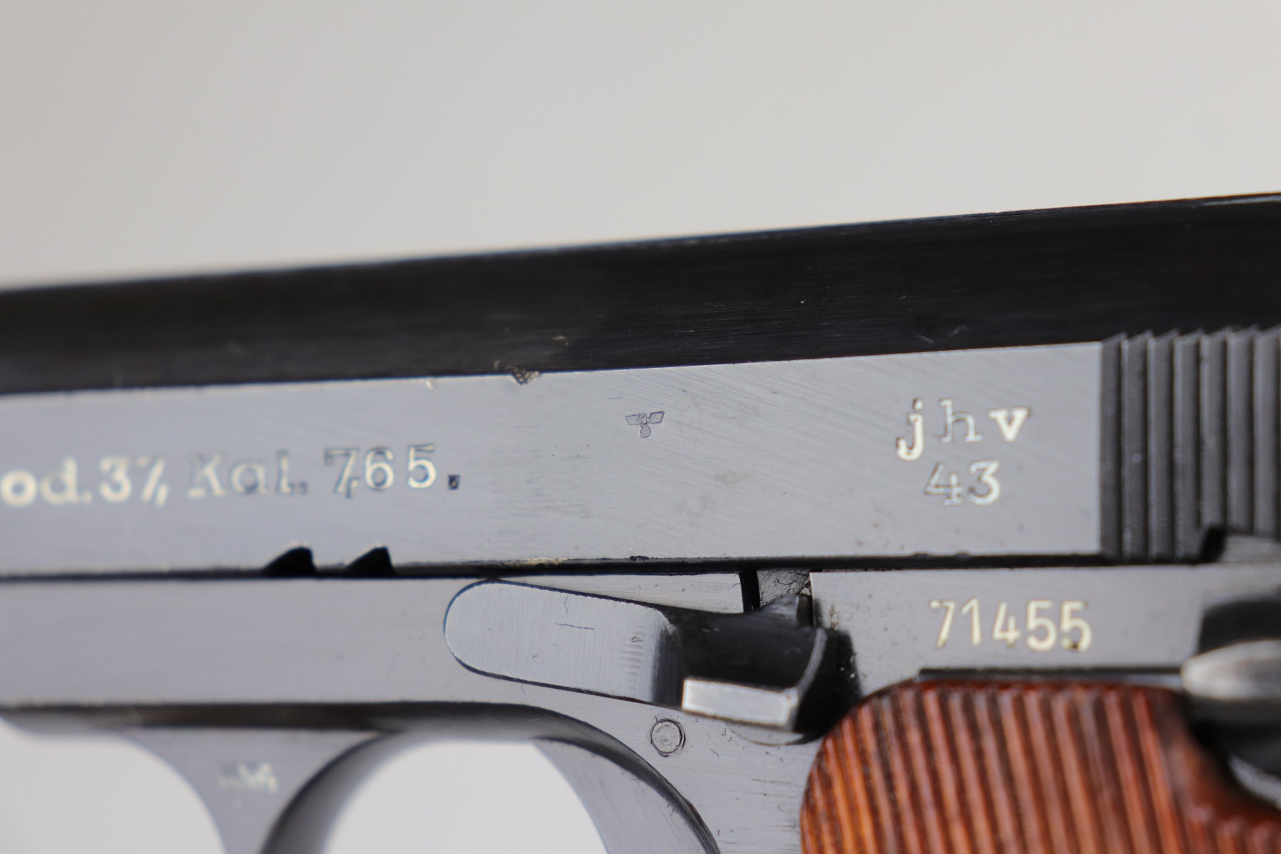 7/9/20 – This is a minty Femaru M37 rig, issued to the Nazi military in 1943. This particular gun is of the “jhv 43” variation and “Waffen 173”-proofed. There is very little finish loss – the gun has retained about 98%. There are a few dings on the high edges of the left side of the slide, very minor thinning/scratching on the back strap, and a few marks on the right side of the slide. There are also a few small areas of dark discoloration. The grips are excellent. The bore is mint. It comes with two excellent period-correct magazines. One of the magazines is matching to the gun. The gun comes with a mint, unissued holster. It is luftwaffe proofed and dated 1942.