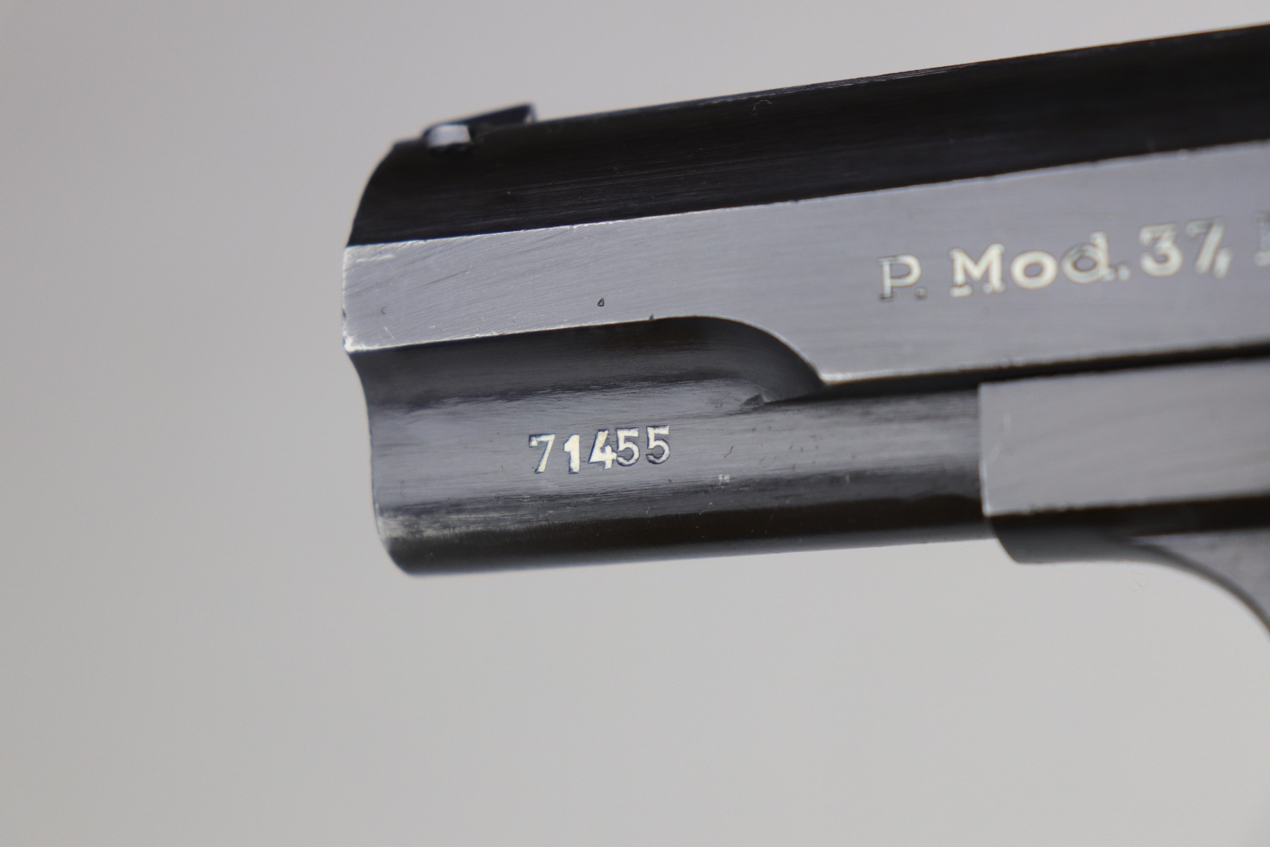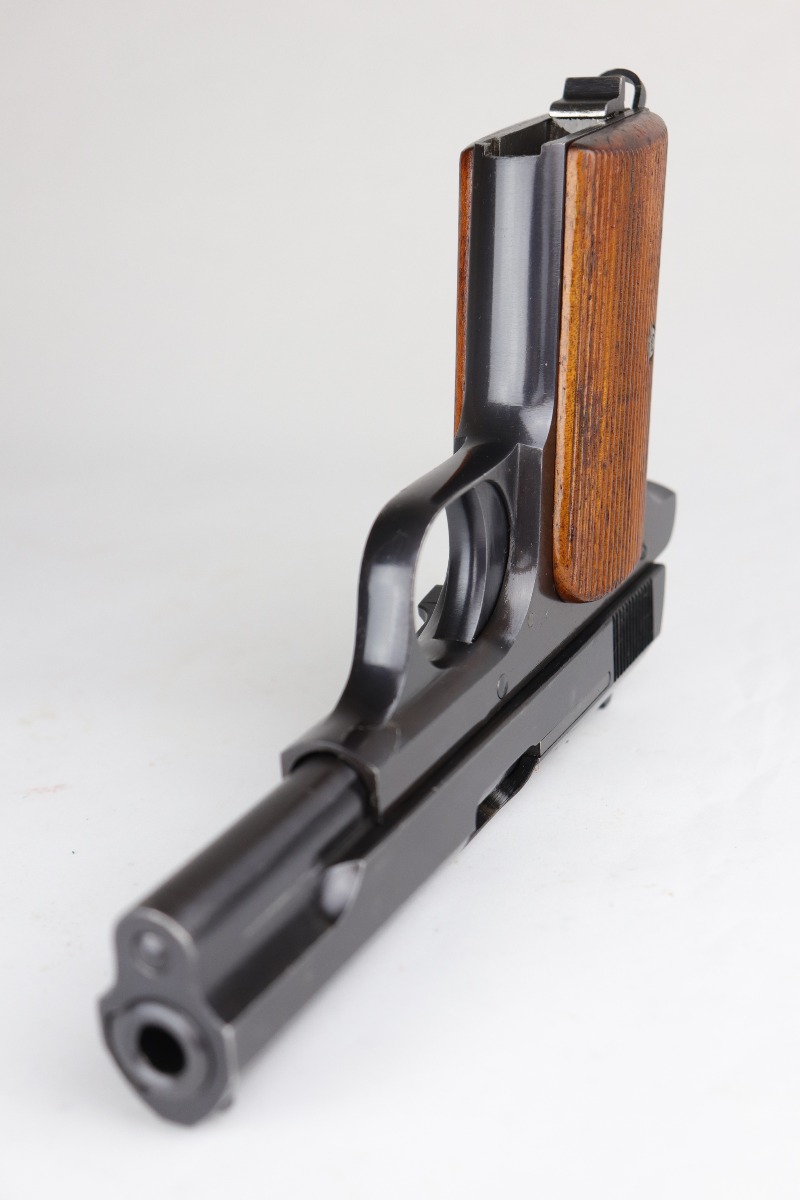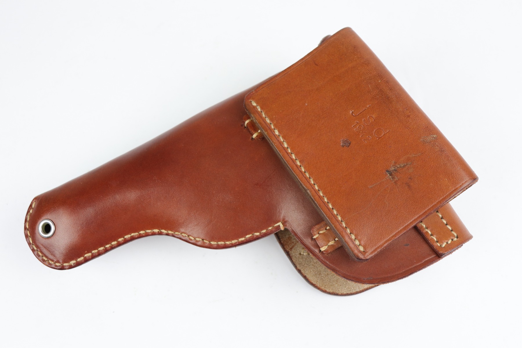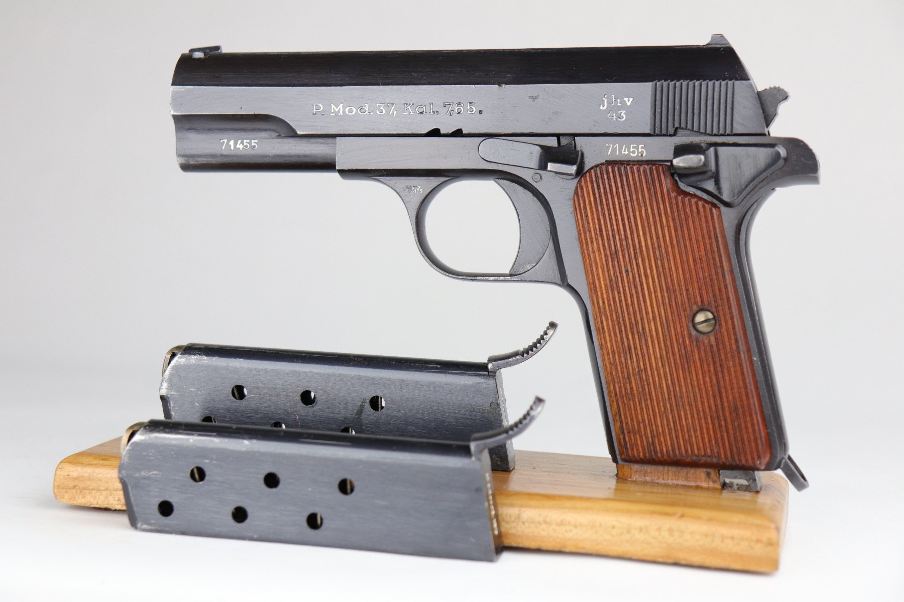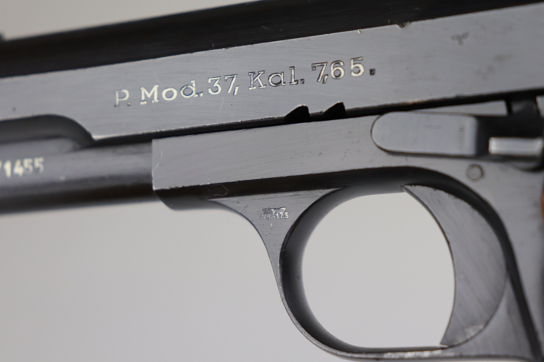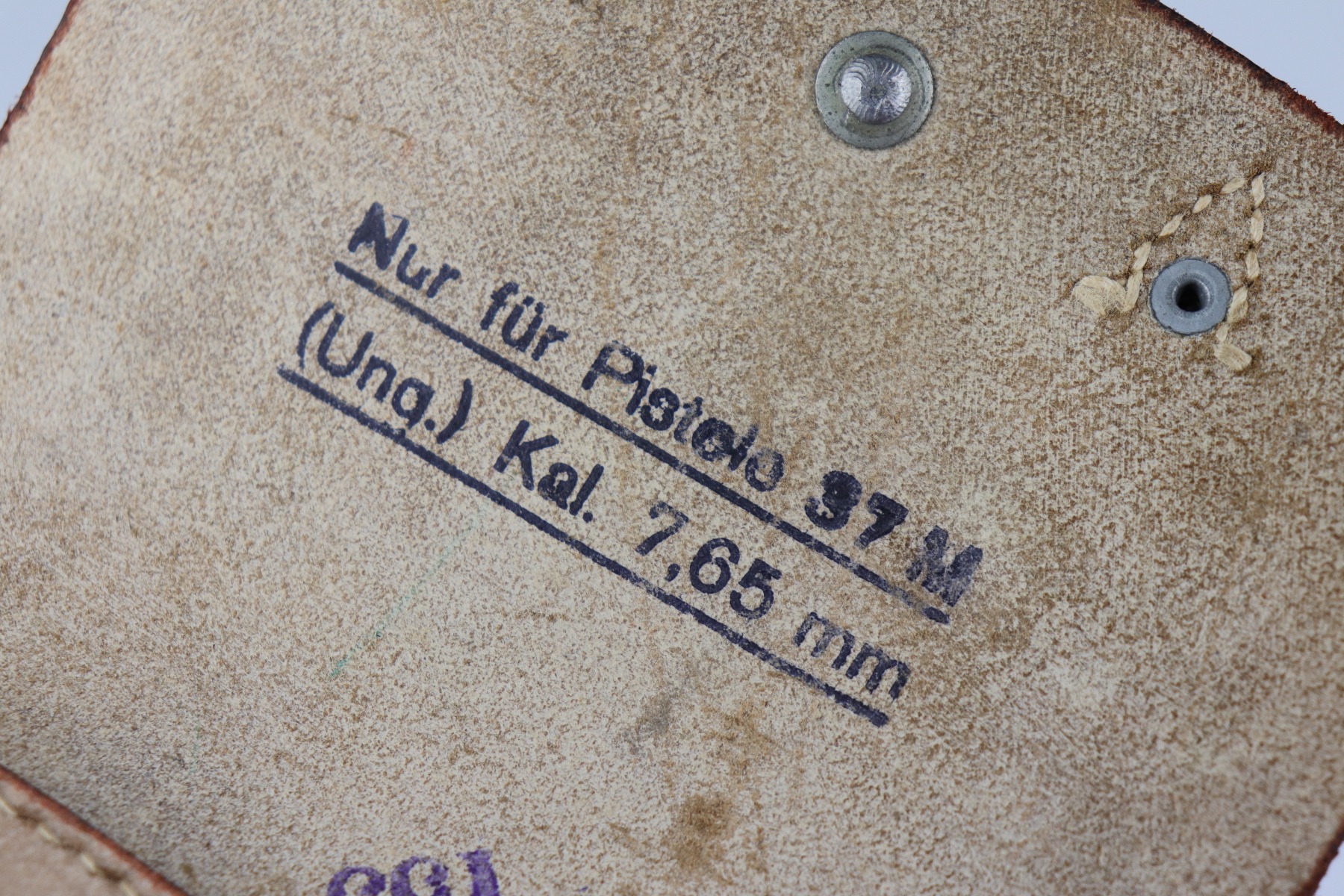 7/9/20 – This is a minty Femaru M37 rig, issued to the Nazi military in 1943. This particular gun is of the “jhv 43” variation and “Waffen 173”-proofed. There is very little finish loss – the gun has retained about 98%. There are a few dings on the high edges of the left side of the slide, very minor thinning/scratching on the back strap, and a few marks on the right side of the slide. There are also a few small areas of dark discoloration. The grips are excellent. The bore is mint. It comes with two excellent period-correct magazines. One of the magazines is matching to the gun. The gun comes with a mint, unissued holster. It is luftwaffe proofed and dated 1942.