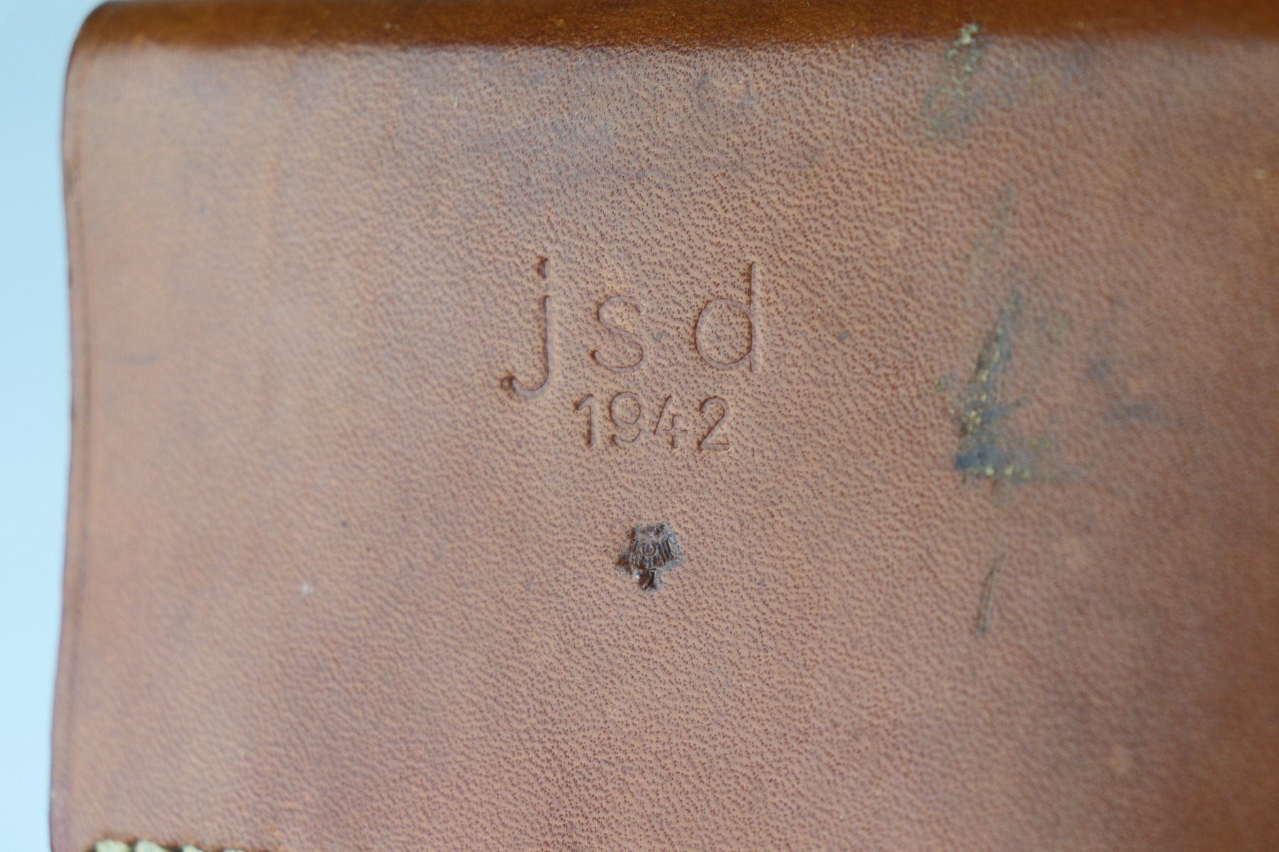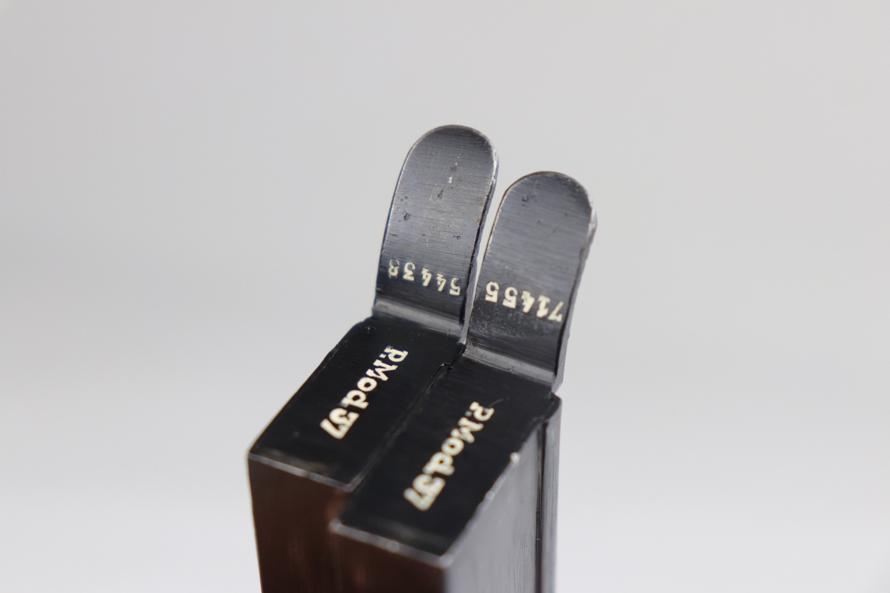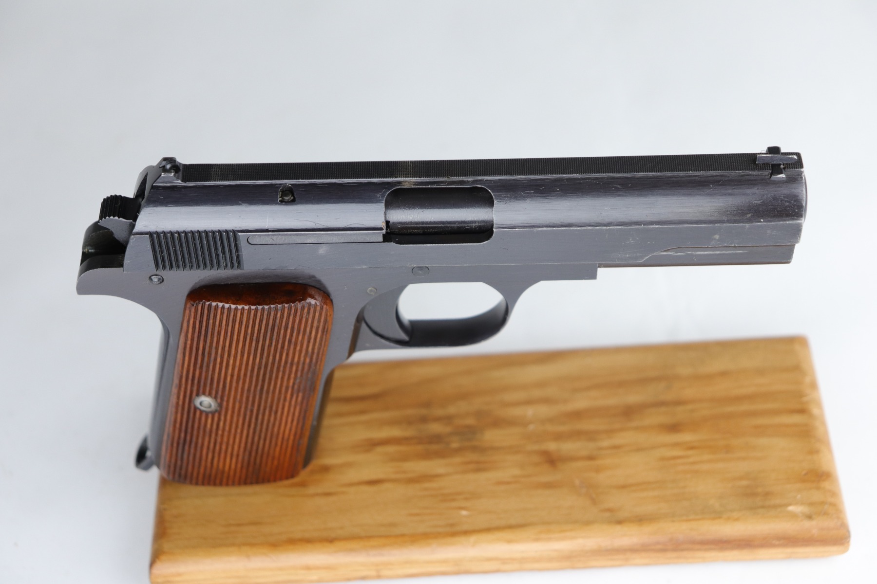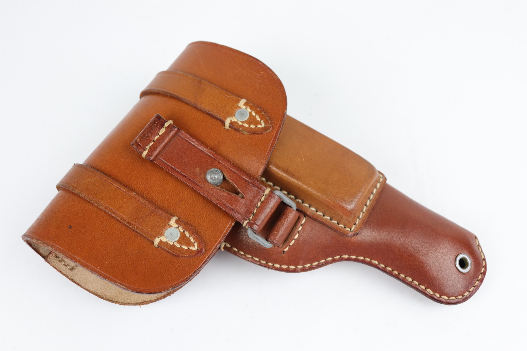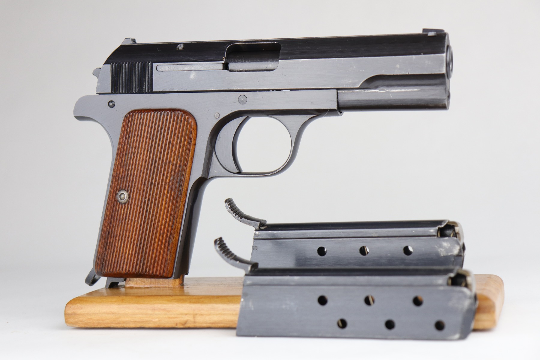 7/9/20 – This is a minty Femaru M37 rig, issued to the Nazi military in 1943. This particular gun is of the “jhv 43” variation and “Waffen 173”-proofed. There is very little finish loss – the gun has retained about 98%. There are a few dings on the high edges of the left side of the slide, very minor thinning/scratching on the back strap, and a few marks on the right side of the slide. There are also a few small areas of dark discoloration. The grips are excellent. The bore is mint. It comes with two excellent period-correct magazines. One of the magazines is matching to the gun. The gun comes with a mint, unissued holster. It is luftwaffe proofed and dated 1942.