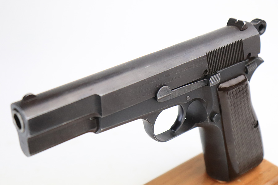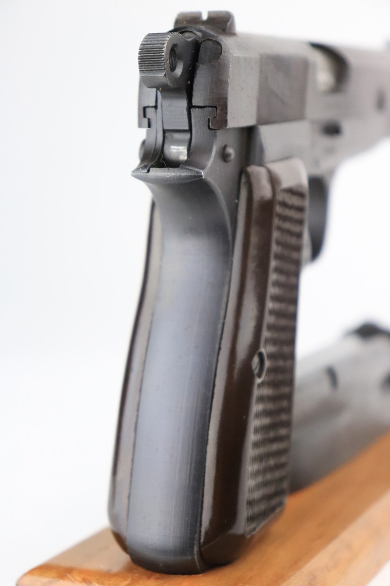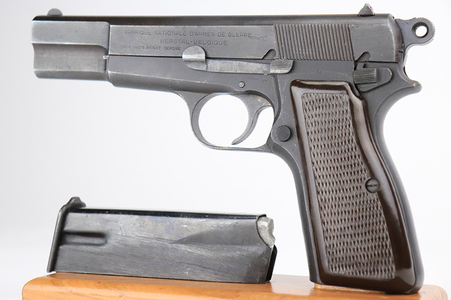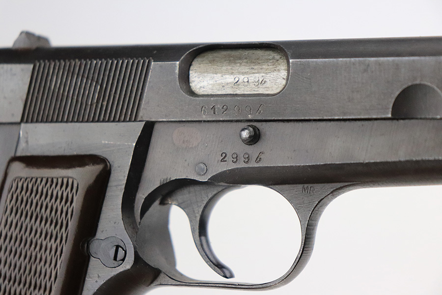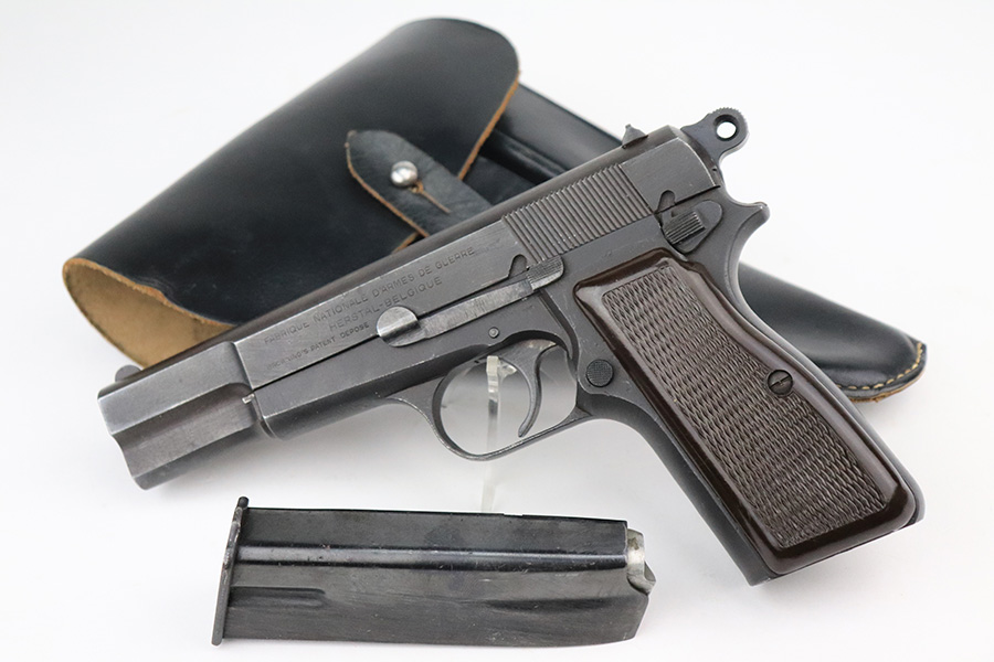 6/17/22 – This is a near-mint example of an FN Browning Hi Power issued to the Nazi military during WW2. It is all matching and has the proper “Waffen 140” military acceptance proofs throughout. It comes as a rig with a late-war black leather holster and an un-marked magazine. The holster is in un-issued condition. The gun has retained nearly all of its wartime finish with just hints of wear on some of the high edges and some areas of very minor freckling here and there. Comes with excellent period-correct brown plastic grips. Mint bore.
