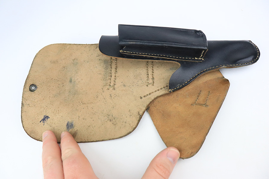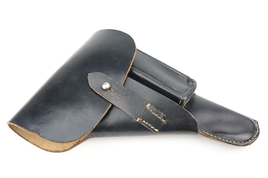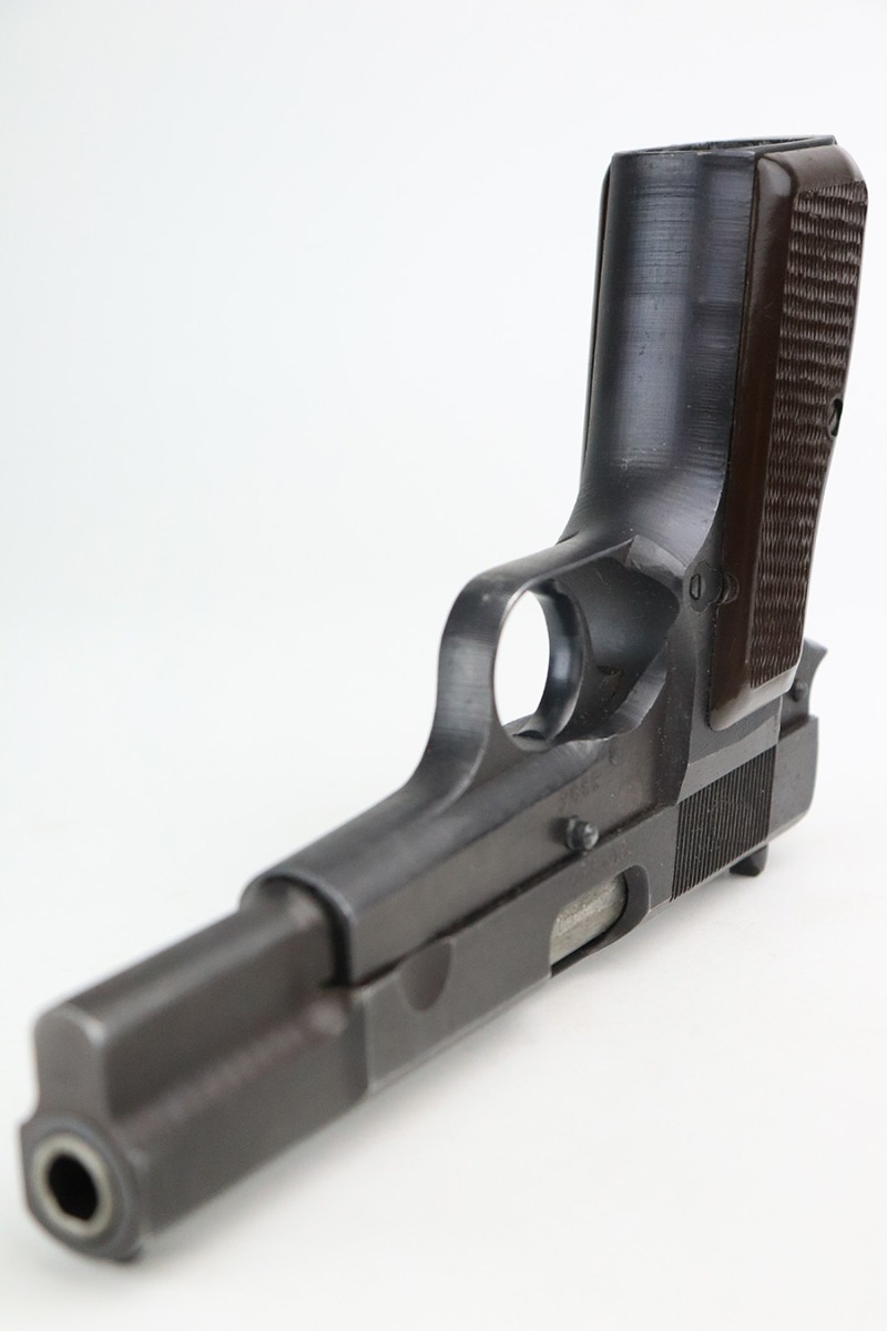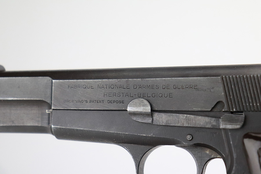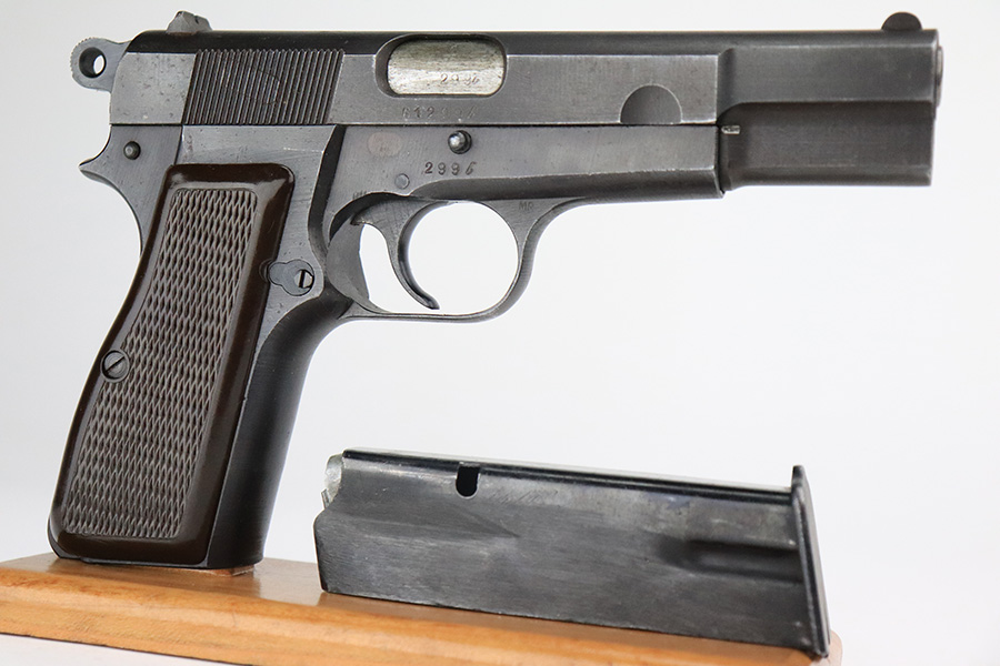 6/17/22 – This is a near-mint example of an FN Browning Hi Power issued to the Nazi military during WW2. It is all matching and has the proper “Waffen 140” military acceptance proofs throughout. It comes as a rig with a late-war black leather holster and an un-marked magazine. The holster is in un-issued condition. The gun has retained nearly all of its wartime finish with just hints of wear on some of the high edges and some areas of very minor freckling here and there. Comes with excellent period-correct brown plastic grips. Mint bore.