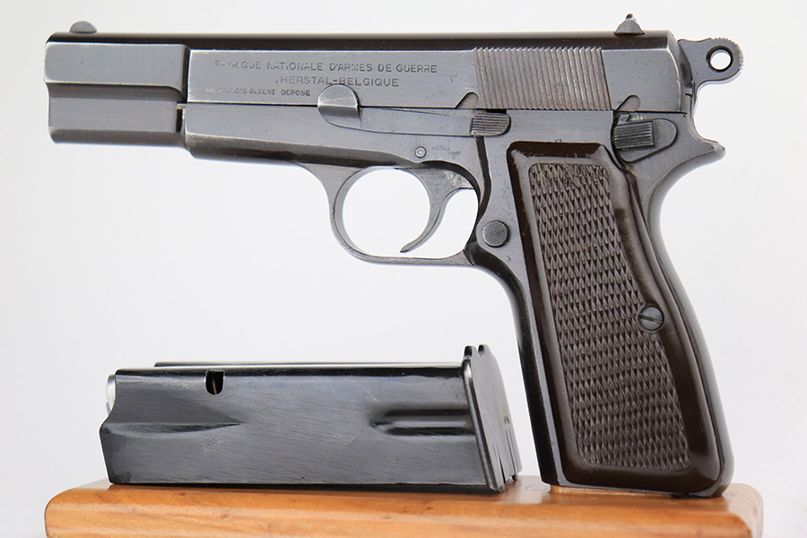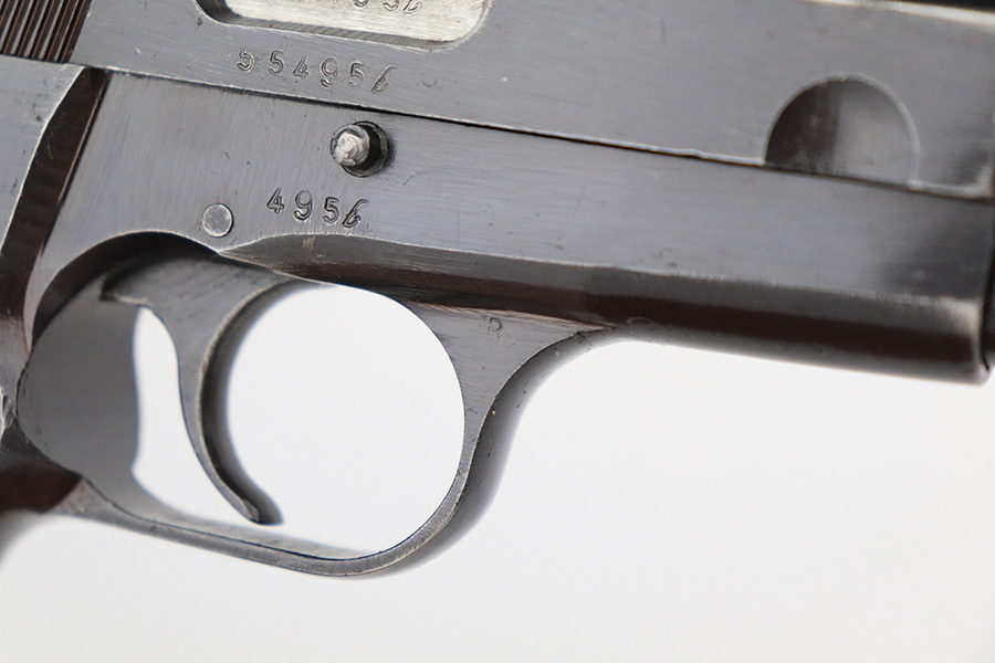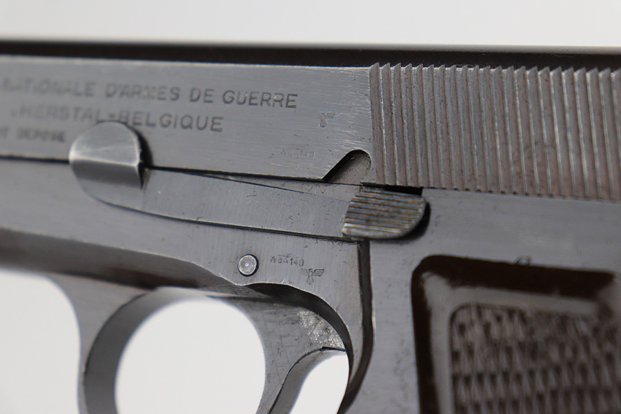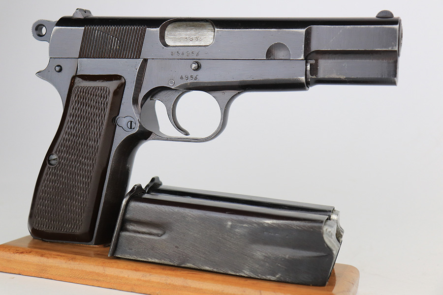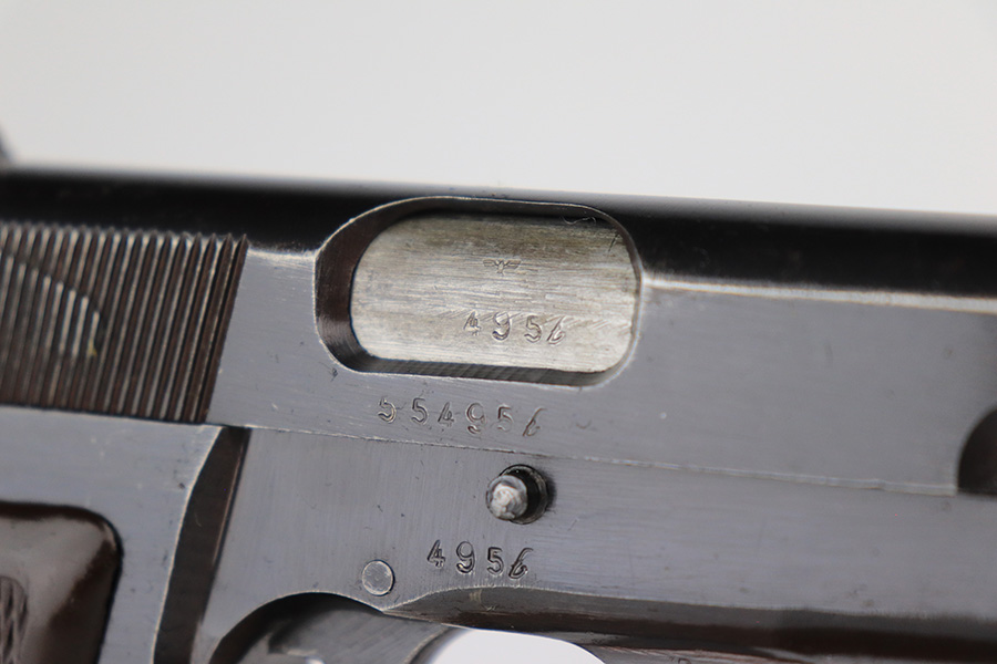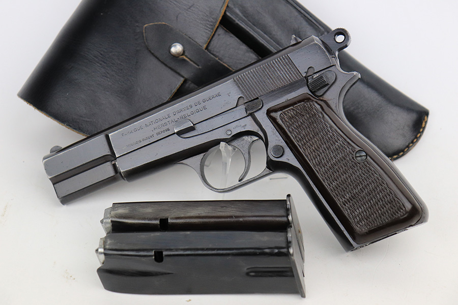 6/5/23 – This is a near-mint example of an FN Browning High Power issued to the Nazi military during WW2. It is all matching and has the proper “Waffen 140” military proofs throughout. It comes as a rig with a waffen-proofed holster in un-issued condition, a “Waffen 140” marked magazine, and one un-marked magazine. The gun itself has retained nearly all of its original finish with just very minor wear around the muzzle and on the high edges. Fitted with very nice period-correct brownish bakelite grips – a couple of light scuffs on the left side. Excellent bore with great rifling.