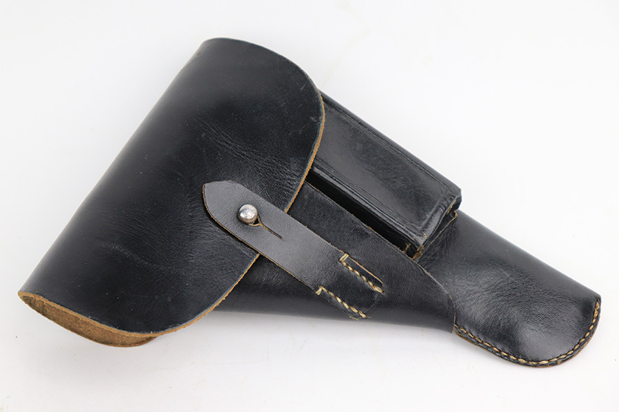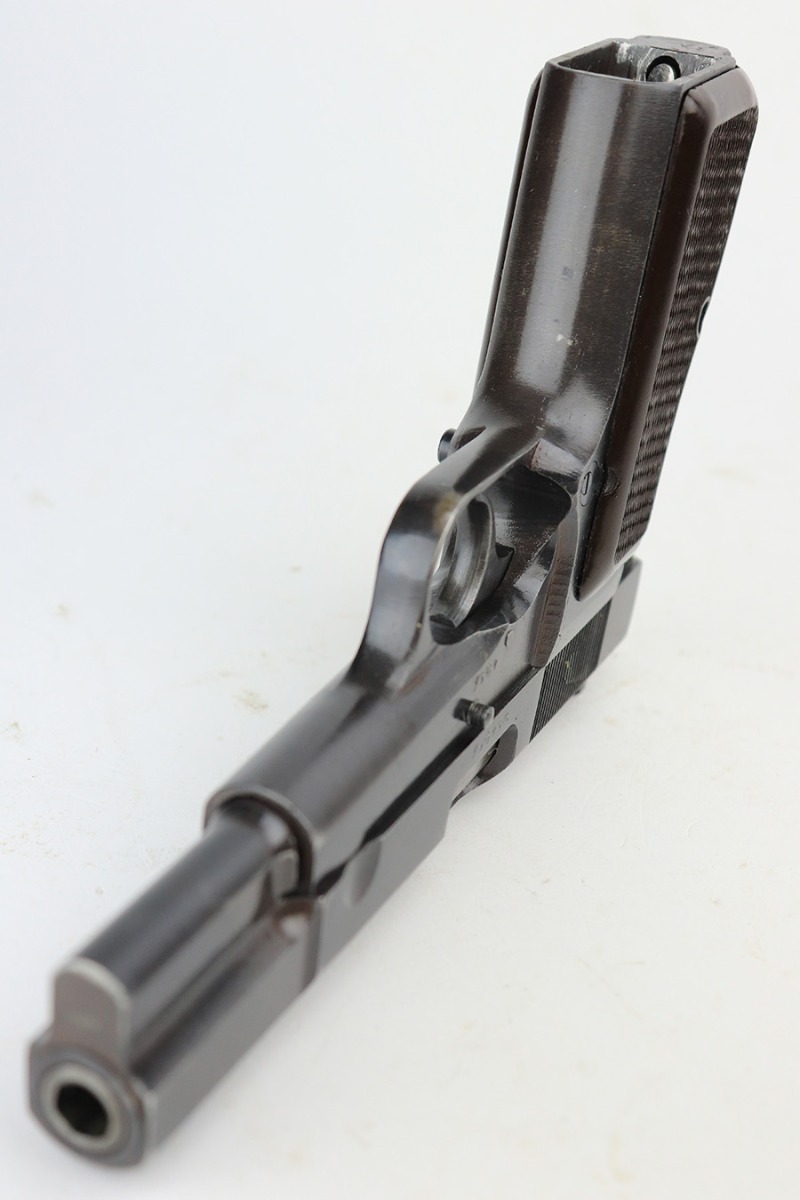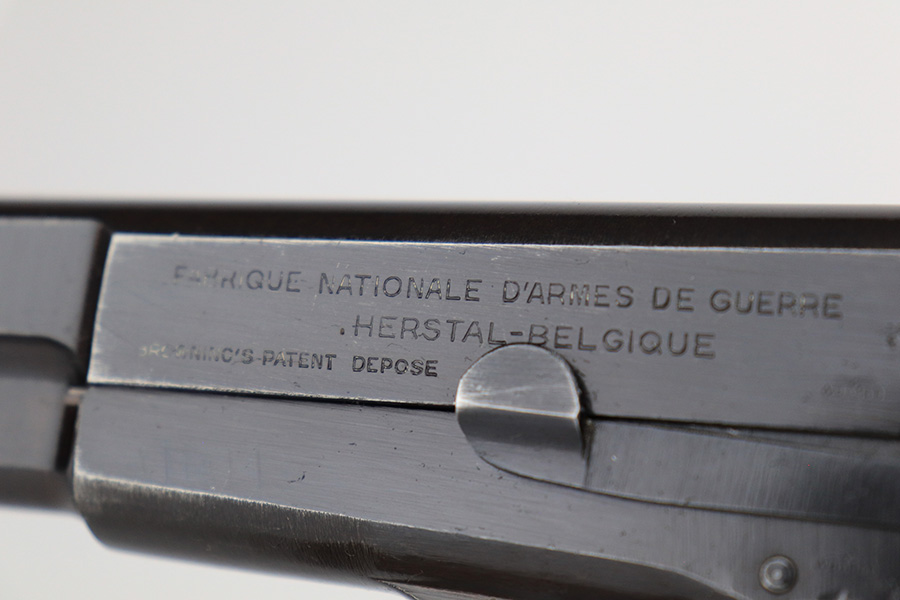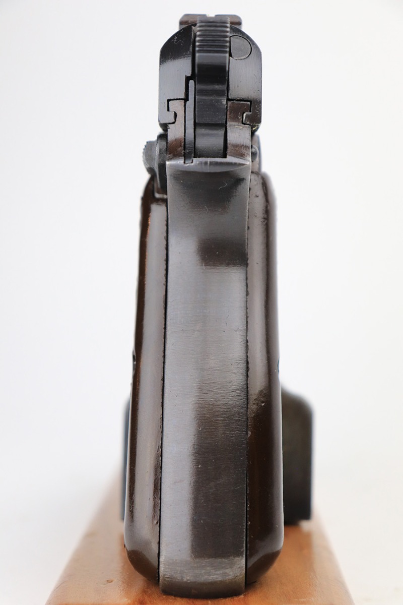 6/5/23 – This is a near-mint example of an FN Browning High Power issued to the Nazi military during WW2. It is all matching and has the proper “Waffen 140” military proofs throughout. It comes as a rig with a waffen-proofed holster in un-issued condition, a “Waffen 140” marked magazine, and one un-marked magazine. The gun itself has retained nearly all of its original finish with just very minor wear around the muzzle and on the high edges. Fitted with very nice period-correct brownish bakelite grips – a couple of light scuffs on the left side. Excellent bore with great rifling.