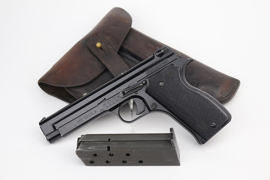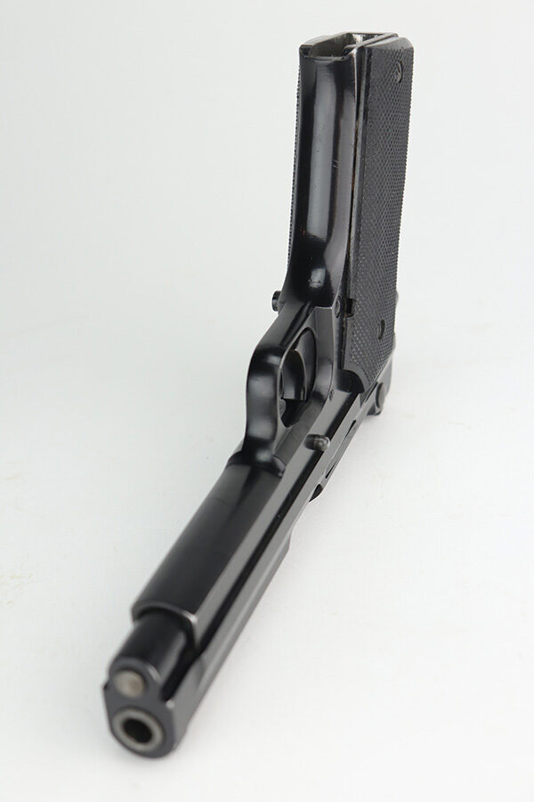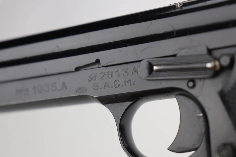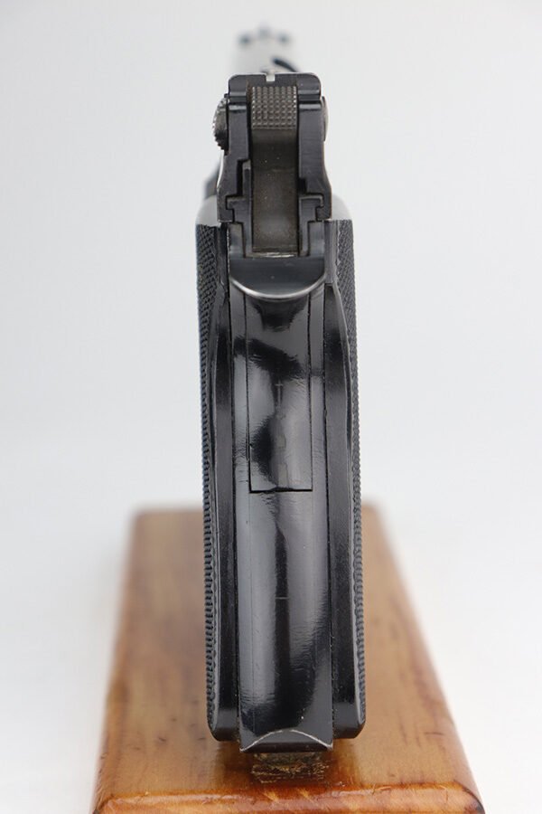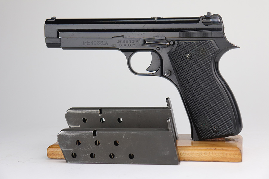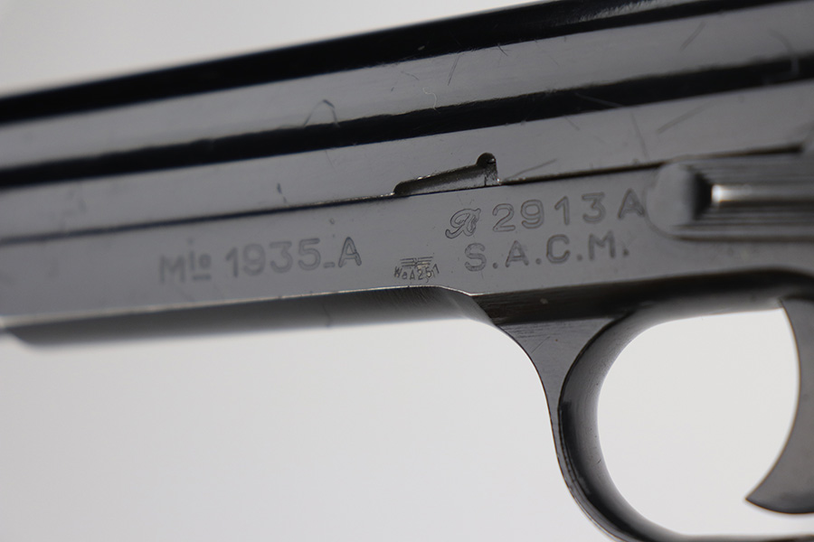 10/28/21 – This is a minty example of a French SACM Model 1935 issued to the Nazi military during WW2. It is all matching and has the proper “Waffen 251” Nazi military acceptance proof on the left side of the frame. It comes as a rig with two un-marked period-correct phosphate magazines and a generic un-marked brown leather holster (the closure knob is loose in the leather). The gun has retained about 98% of its black painted finish. There are light scratches here and there, most noticeable on the left side of the slide and underside of the frame. Some tiny handling marks on the front strap and a light streak of wear on the back strap. Comes with excellent black bakelite grips – a couple of small areas of wear on the left grip panel. The bore is poor – the rifling is fairly worn with noticeable pitting throughout.