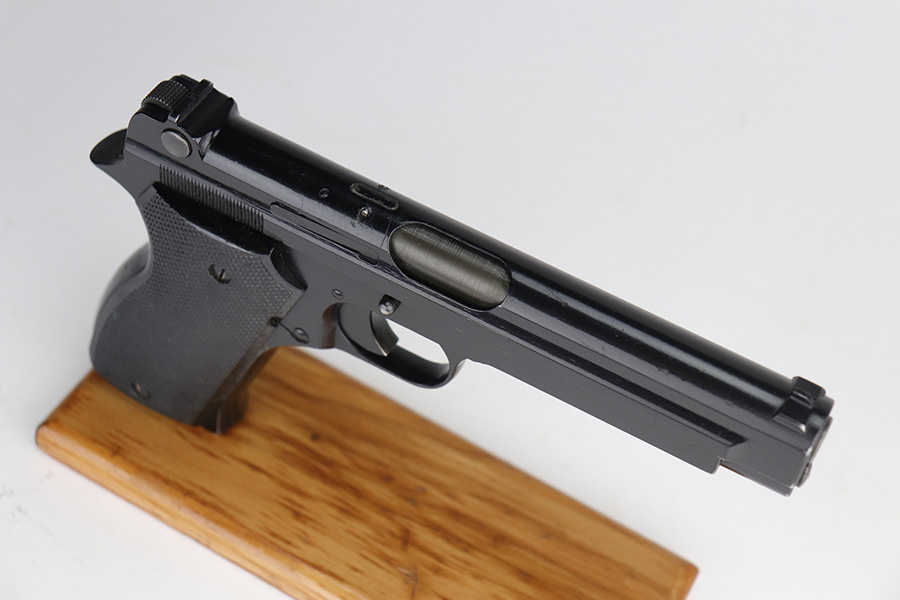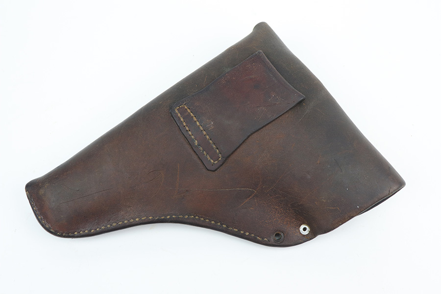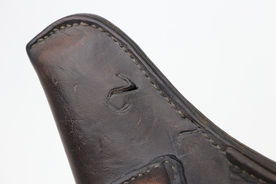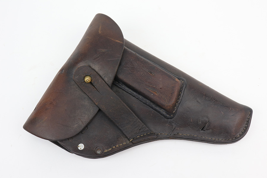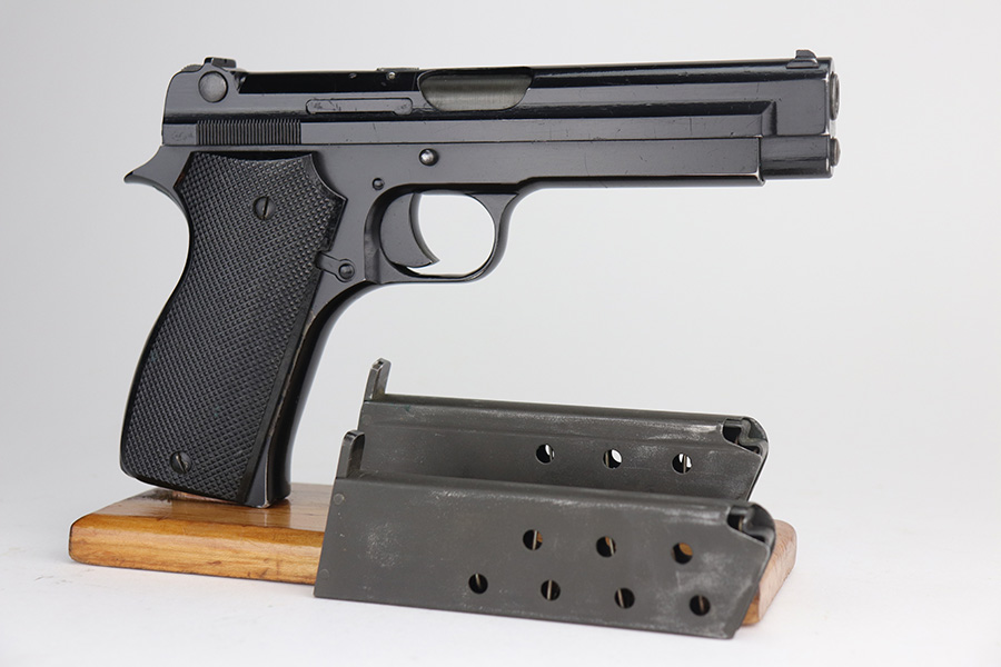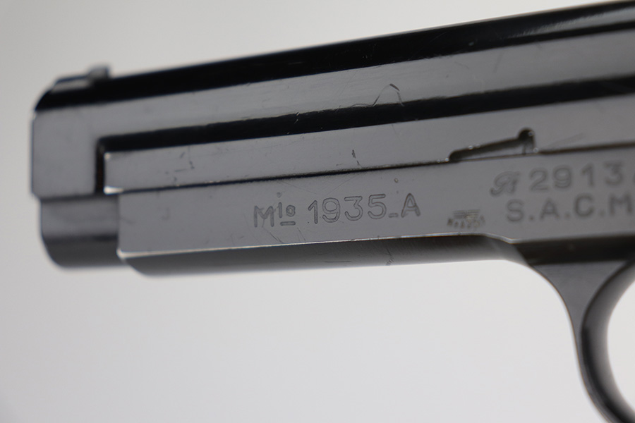 10/28/21 – This is a minty example of a French SACM Model 1935 issued to the Nazi military during WW2. It is all matching and has the proper “Waffen 251” Nazi military acceptance proof on the left side of the frame. It comes as a rig with two un-marked period-correct phosphate magazines and a generic un-marked brown leather holster (the closure knob is loose in the leather). The gun has retained about 98% of its black painted finish. There are light scratches here and there, most noticeable on the left side of the slide and underside of the frame. Some tiny handling marks on the front strap and a light streak of wear on the back strap. Comes with excellent black bakelite grips – a couple of small areas of wear on the left grip panel. The bore is poor – the rifling is fairly worn with noticeable pitting throughout.