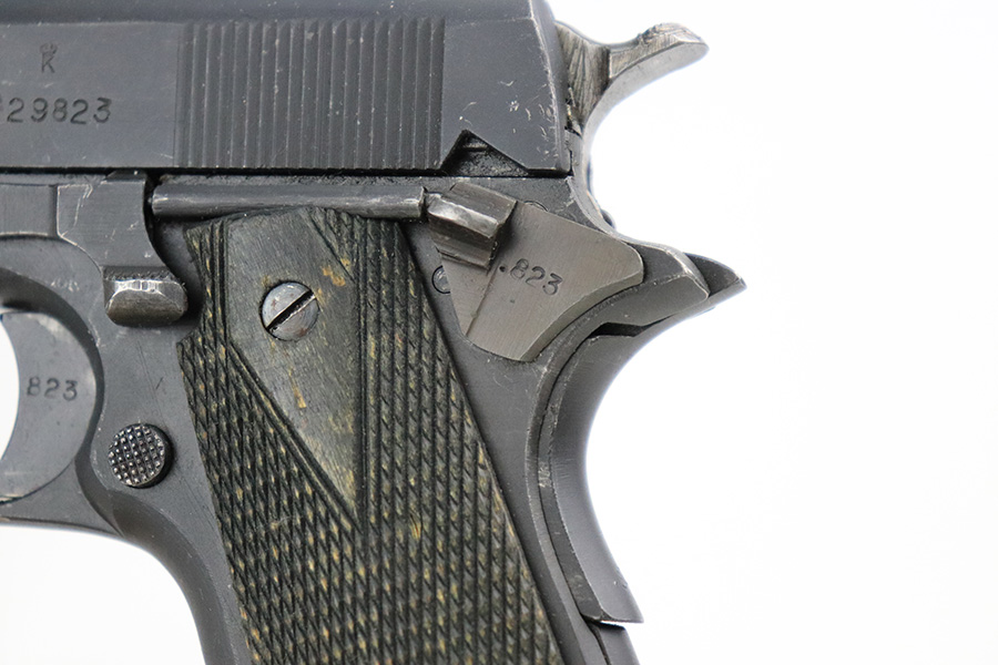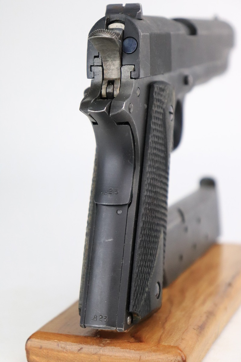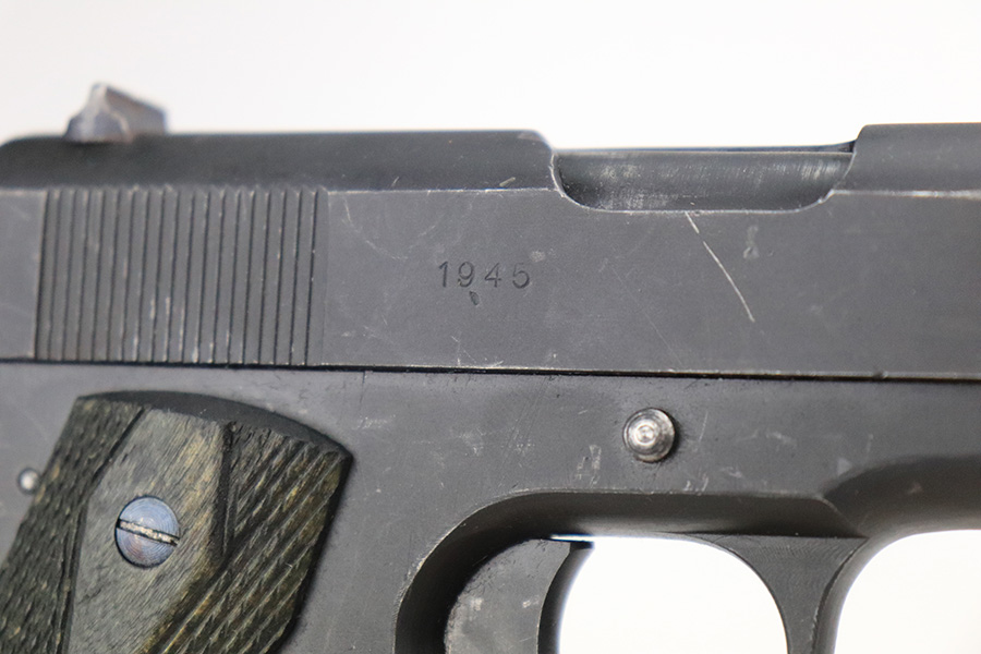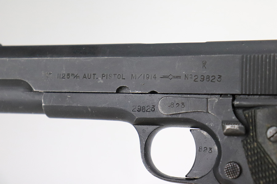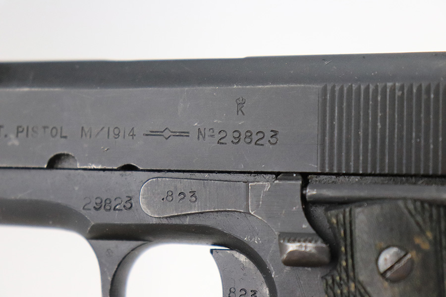 3/15/24 – This is a terrific Kongsberg Colt model 1914, manufactured in 1945 and issued to the Nazi Army. These are rare pistols, and this one is all original and correct. The finish rates at about 98% with minor scuff marks on the slide and frame, but no major finish loss to mention. Colt licensed out production of the 1911 to Kongsberg Vaapenfabrik in Norway, who in 1945 produced less than 1,000 of this waffen variation according to Jan Still’s book. This particular piece falls in the documented serial range of 29261-30523, where only 75-100 have been reported. It has the original matte blue finish and stained birch grips, which have retained the vast majority of the dark stain finish. The gun is 1945 dated, and it is stamped along the left side of the slide “11.25m/m AUT. PISTOL M/1914” followed by the serial number, above which is a crown/K inspector proof. To the left of this stamp is an E/WaA84 nazi proof, showing this gun was delivered to the German occupying forces in Norway. The barrel is numbered to the pistol, and has the Nazi test eagle on the lug. The bore has strong rifling but a little frost in the grooves.