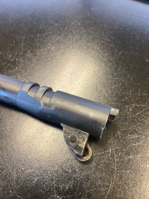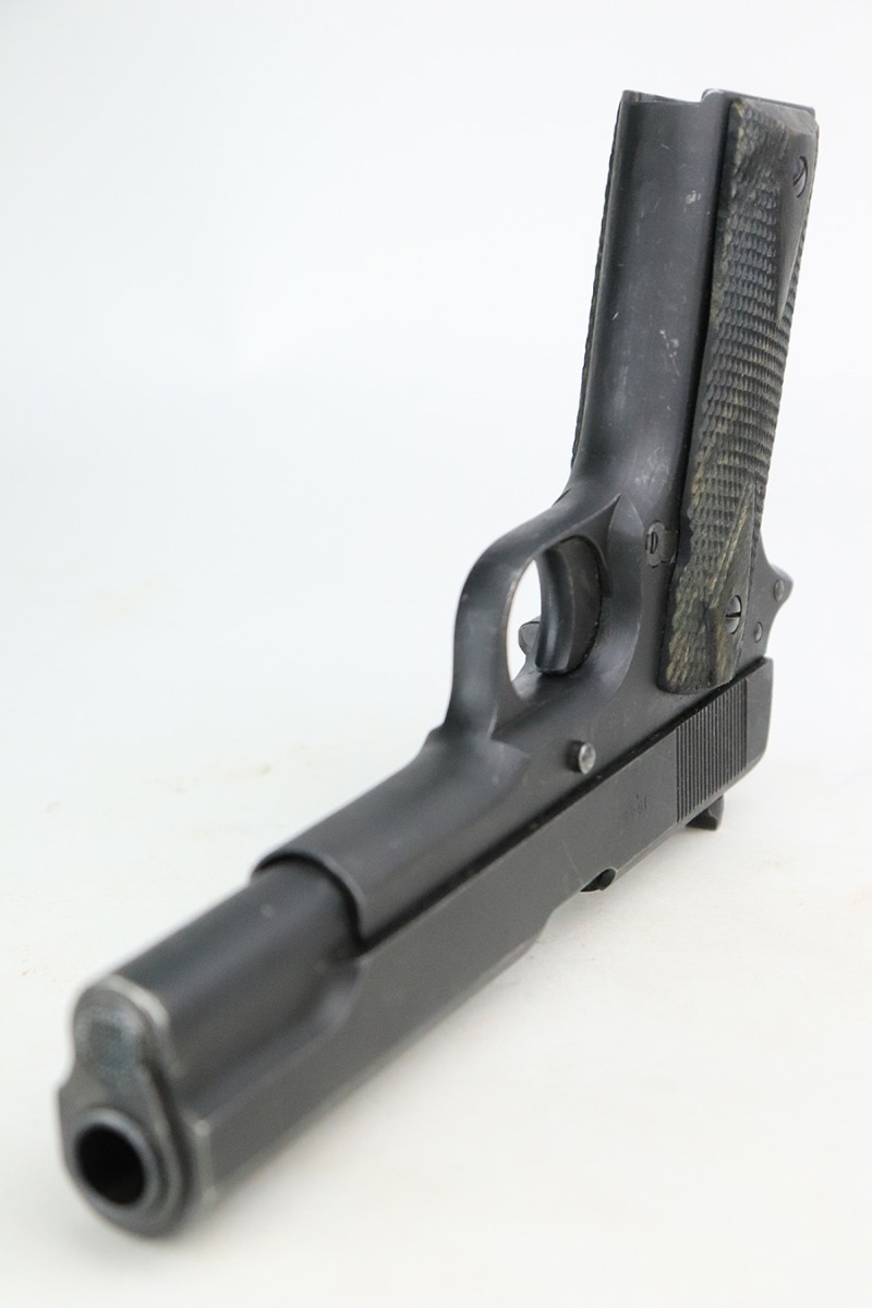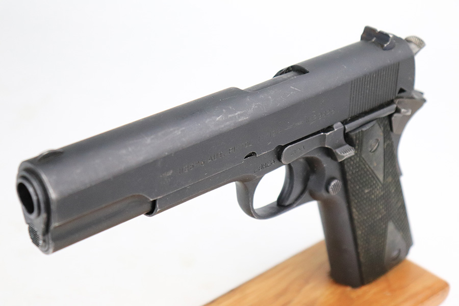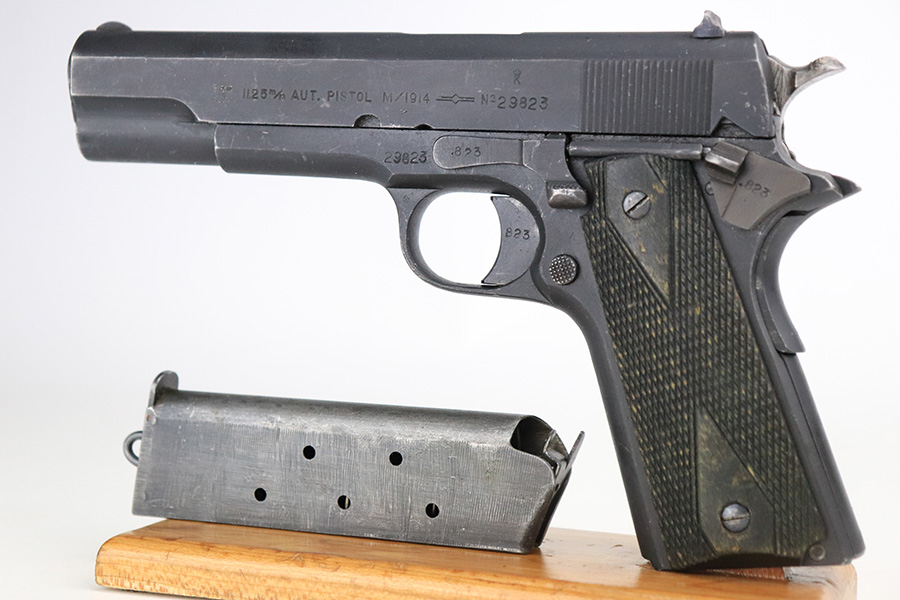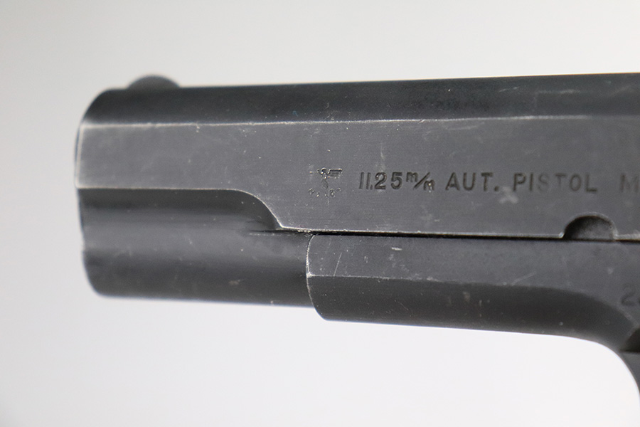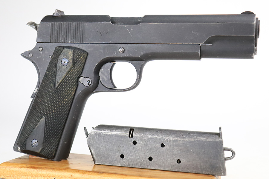 3/15/24 – This is a terrific Kongsberg Colt model 1914, manufactured in 1945 and issued to the Nazi Army. These are rare pistols, and this one is all original and correct. The finish rates at about 98% with minor scuff marks on the slide and frame, but no major finish loss to mention. Colt licensed out production of the 1911 to Kongsberg Vaapenfabrik in Norway, who in 1945 produced less than 1,000 of this waffen variation according to Jan Still’s book. This particular piece falls in the documented serial range of 29261-30523, where only 75-100 have been reported. It has the original matte blue finish and stained birch grips, which have retained the vast majority of the dark stain finish. The gun is 1945 dated, and it is stamped along the left side of the slide “11.25m/m AUT. PISTOL M/1914” followed by the serial number, above which is a crown/K inspector proof. To the left of this stamp is an E/WaA84 nazi proof, showing this gun was delivered to the German occupying forces in Norway. The barrel is numbered to the pistol, and has the Nazi test eagle on the lug. The bore has strong rifling but a little frost in the grooves.