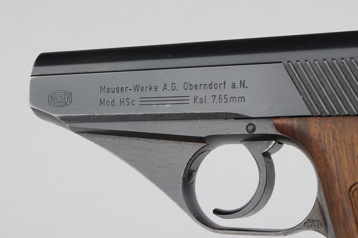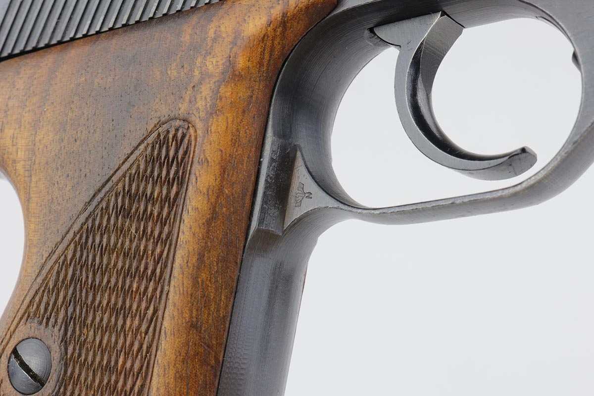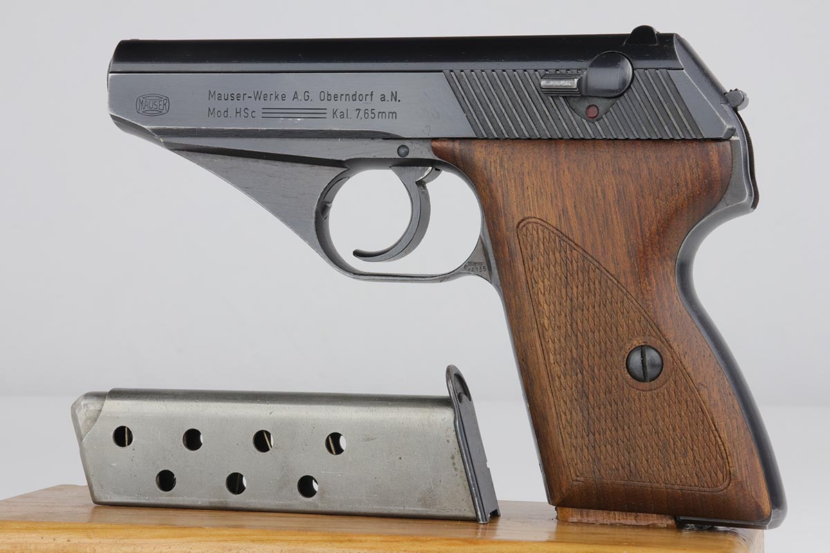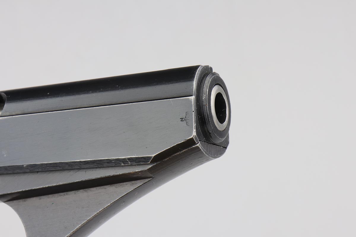 6/27/23 – This is a near-mint Mauser HSc from the end of the war. It has a sharp waffenamt on the frame, denoting Army issue. The serial dates it to very early in 1945, where only ~8,000+ were produced. The finish rates at 98-99% with minor high point thinning, and a bit of thinning on the bottom of the back strap. Mint bore and excellent grips. Half-moon magazine.