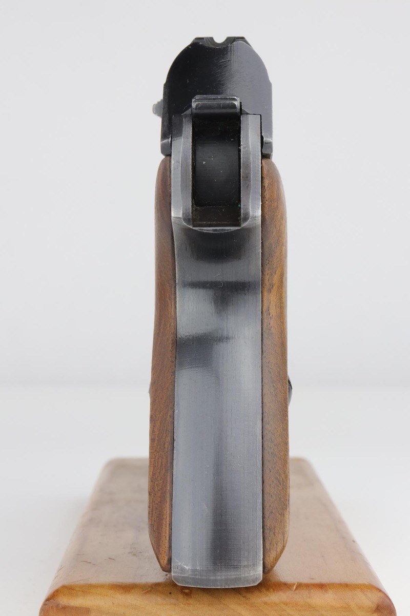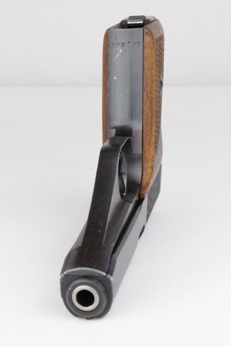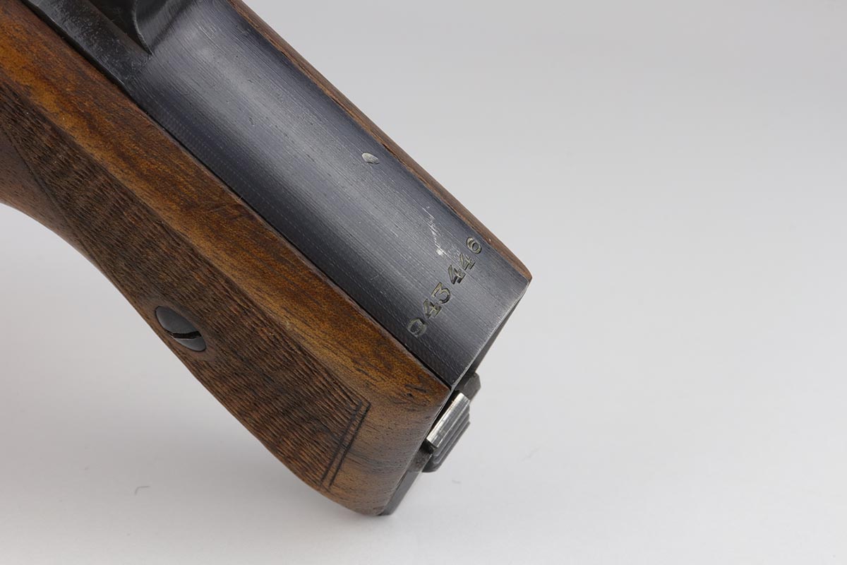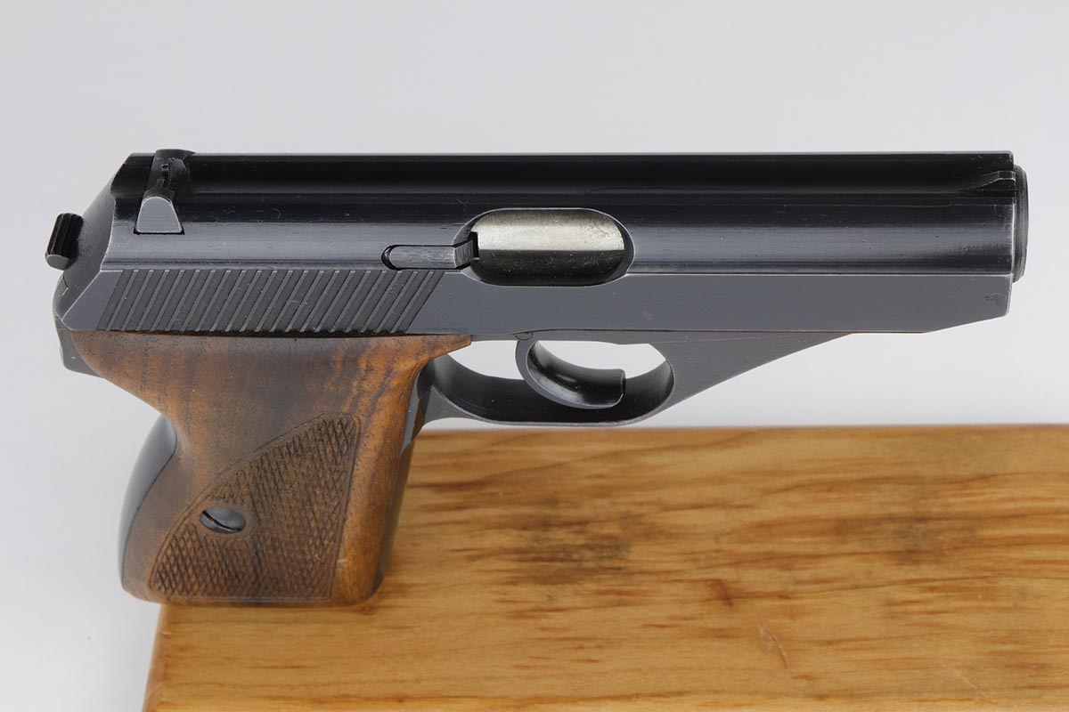 6/27/23 – This is a near-mint Mauser HSc from the end of the war. It has a sharp waffenamt on the frame, denoting Army issue. The serial dates it to very early in 1945, where only ~8,000+ were produced. The finish rates at 98-99% with minor high point thinning, and a bit of thinning on the bottom of the back strap. Mint bore and excellent grips. Half-moon magazine.