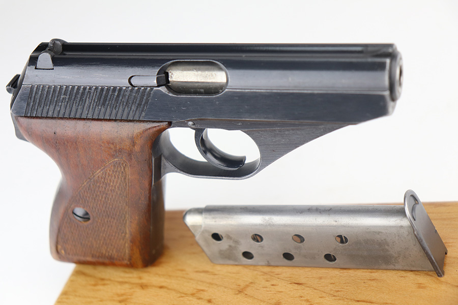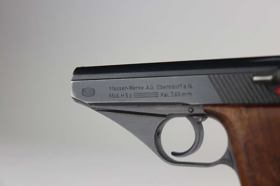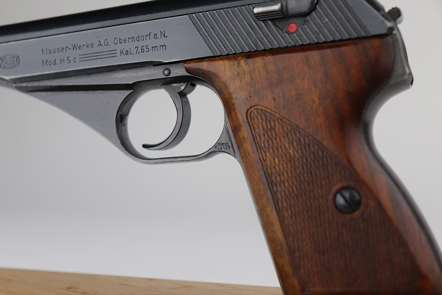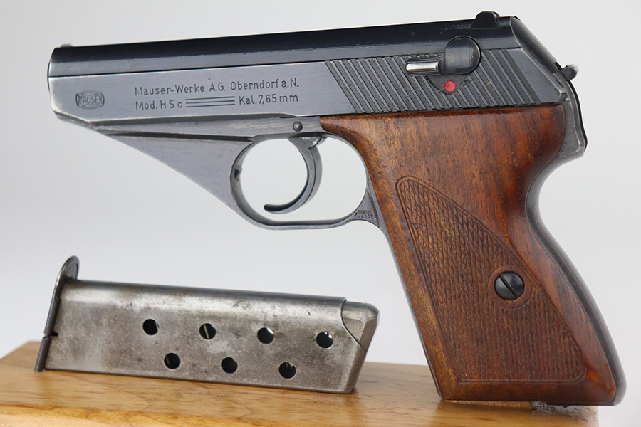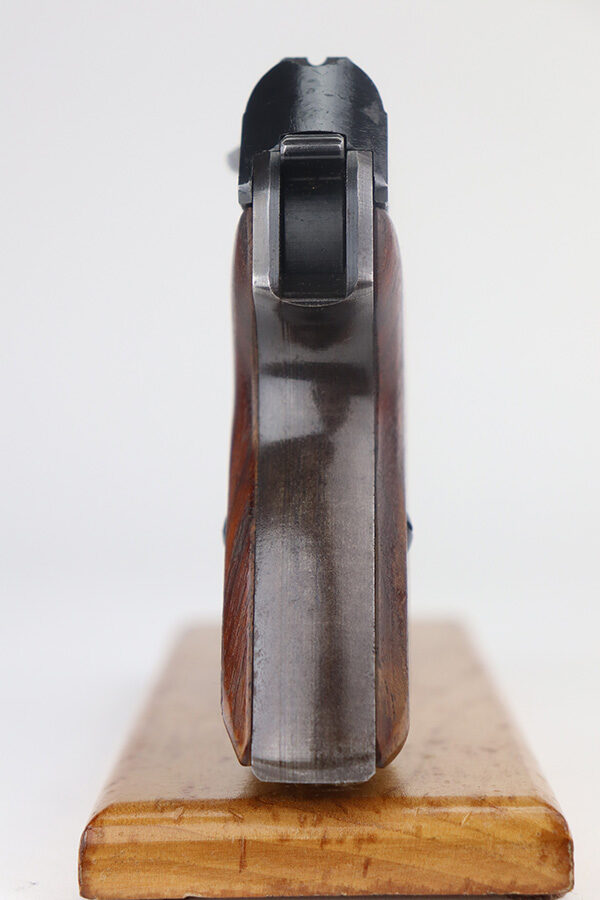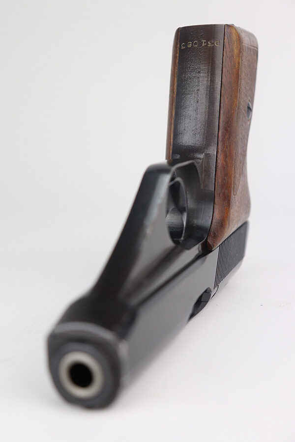 5/20/21 – This is a minty example of Mauser HSC issued to the Nazi military in 1944. The gun is matching and has the proper “waffen 135” military proof. It has retained about 98% of its original bluing. There is just a hint of wear on the straps and around the muzzle. A little bit of minor patina on the straps. Comes with excellent wood grips and a proper magazine. The bore is mint.