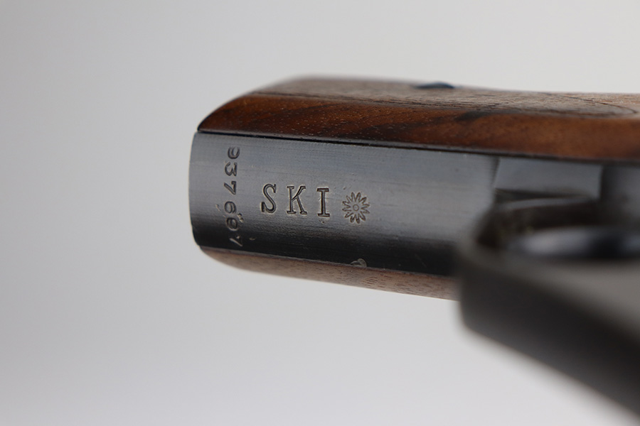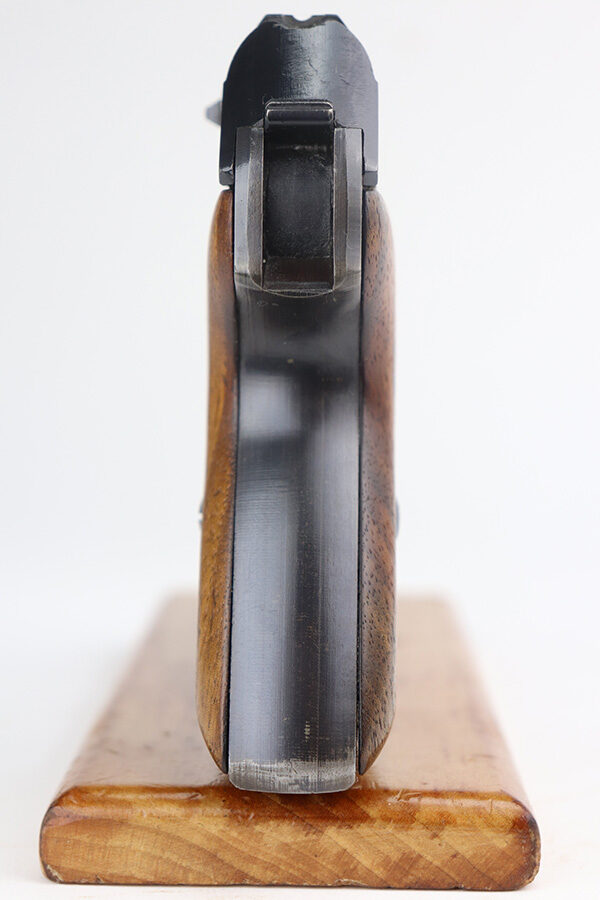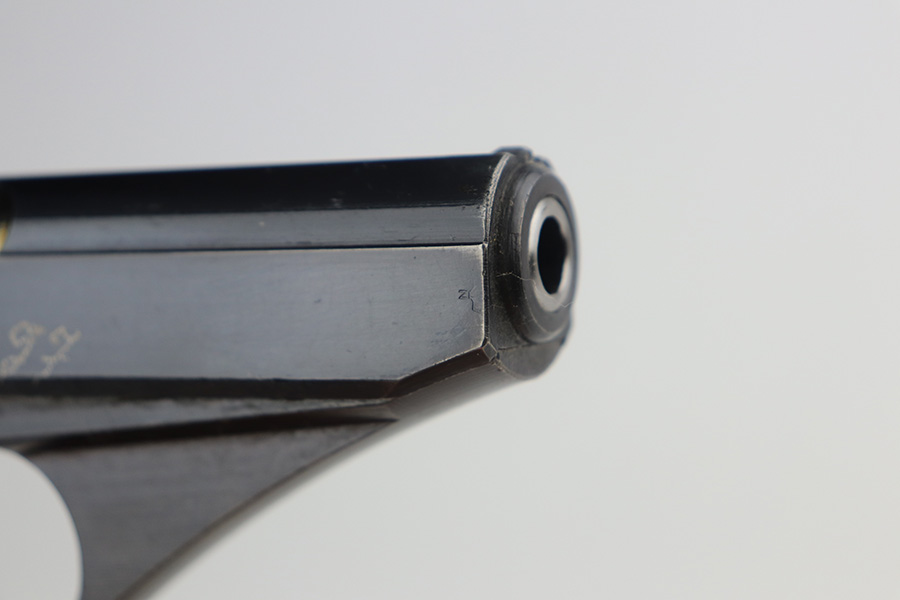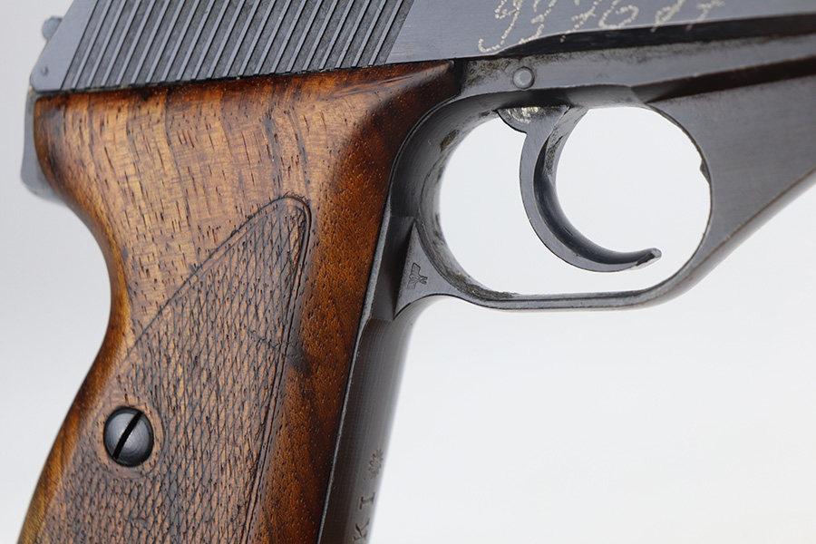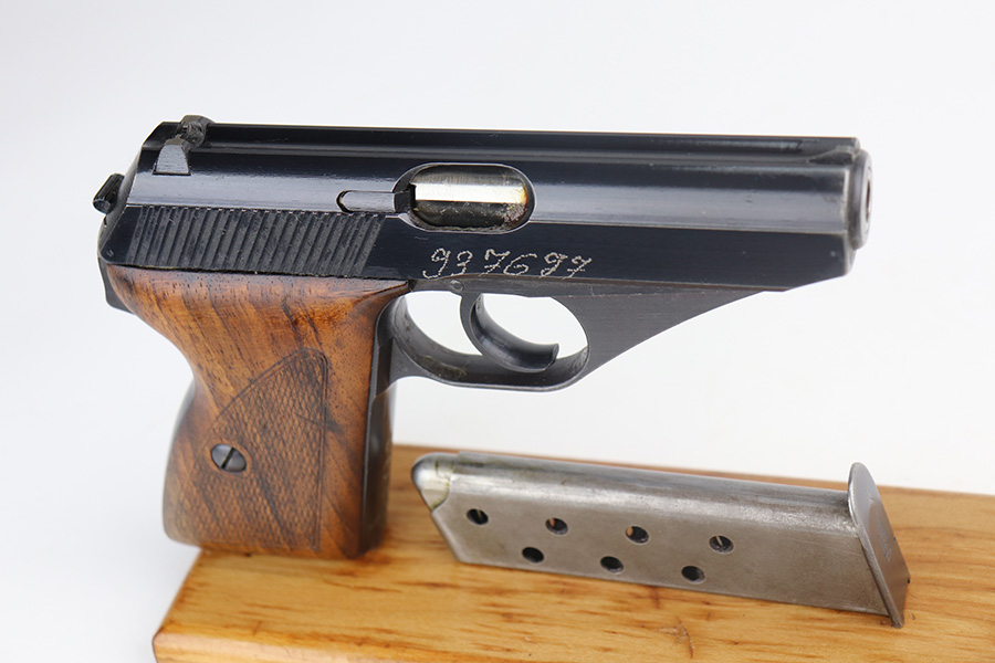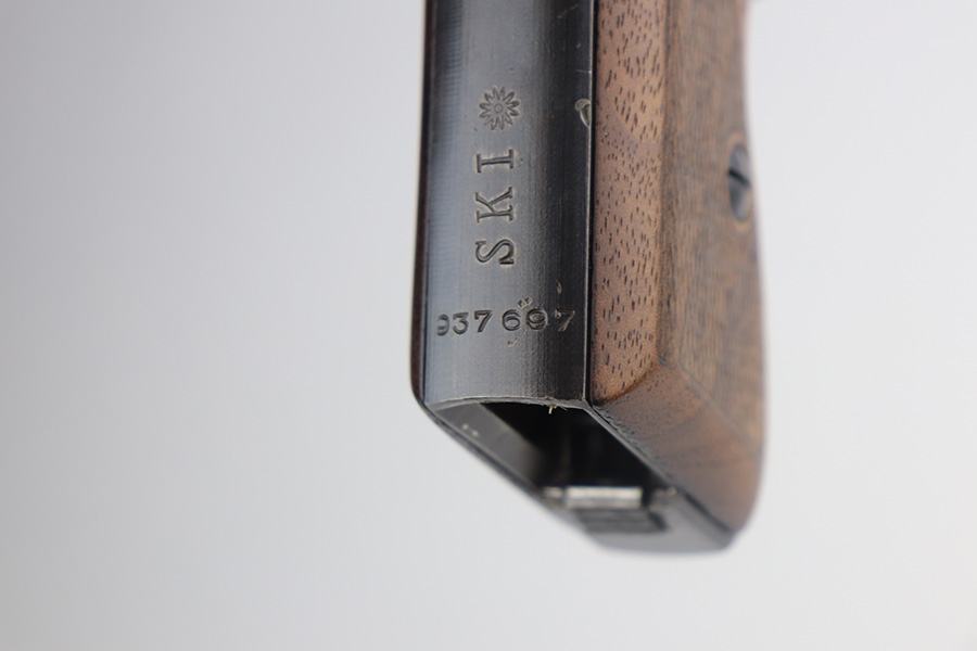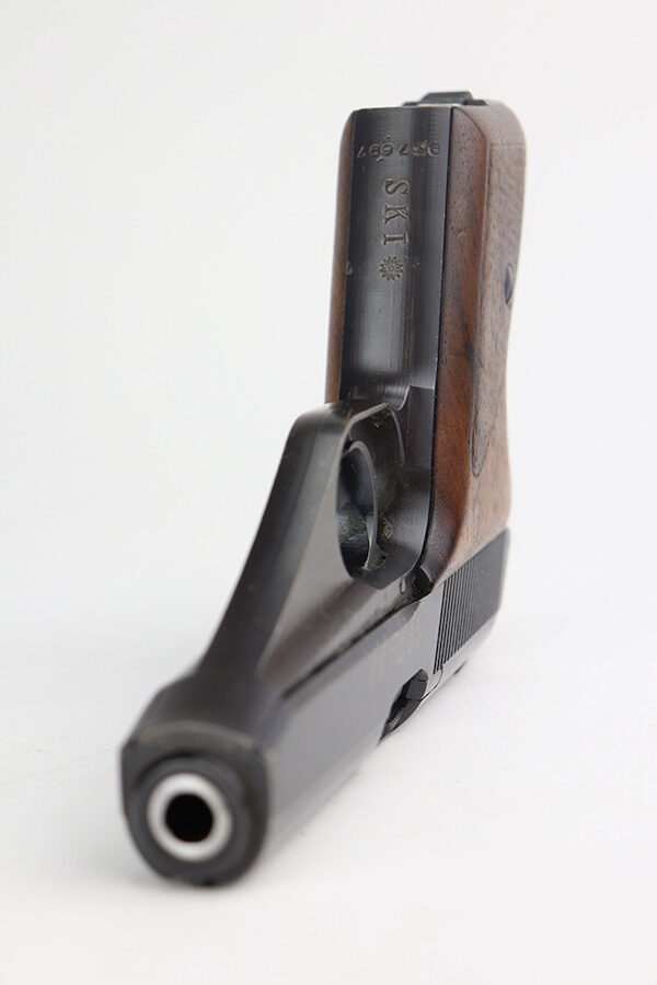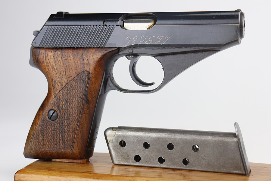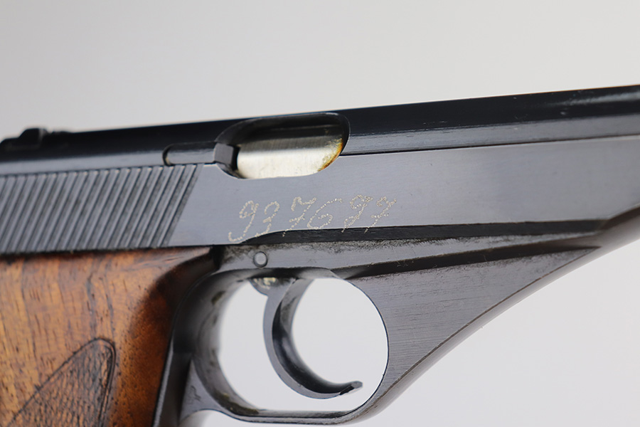 6/8/21 – This is a minty example of a Mauser HSC issued to the Nazi military in 1944. It was then reworked, likely by the East German police force. The gun is all matching, the original Nazi military proof on the trigger guard has been peened, the serial number was electro-penciled onto the slide, and a police “SKI sunburst” marking was added to the front strap. The gun has retained about 98% of its finish. Just some minor wear around the muzzle and base of the back strap. A few very small handling marks on the front strap. Comes with excellent grips and a WW2-era magazine. Mint bore.