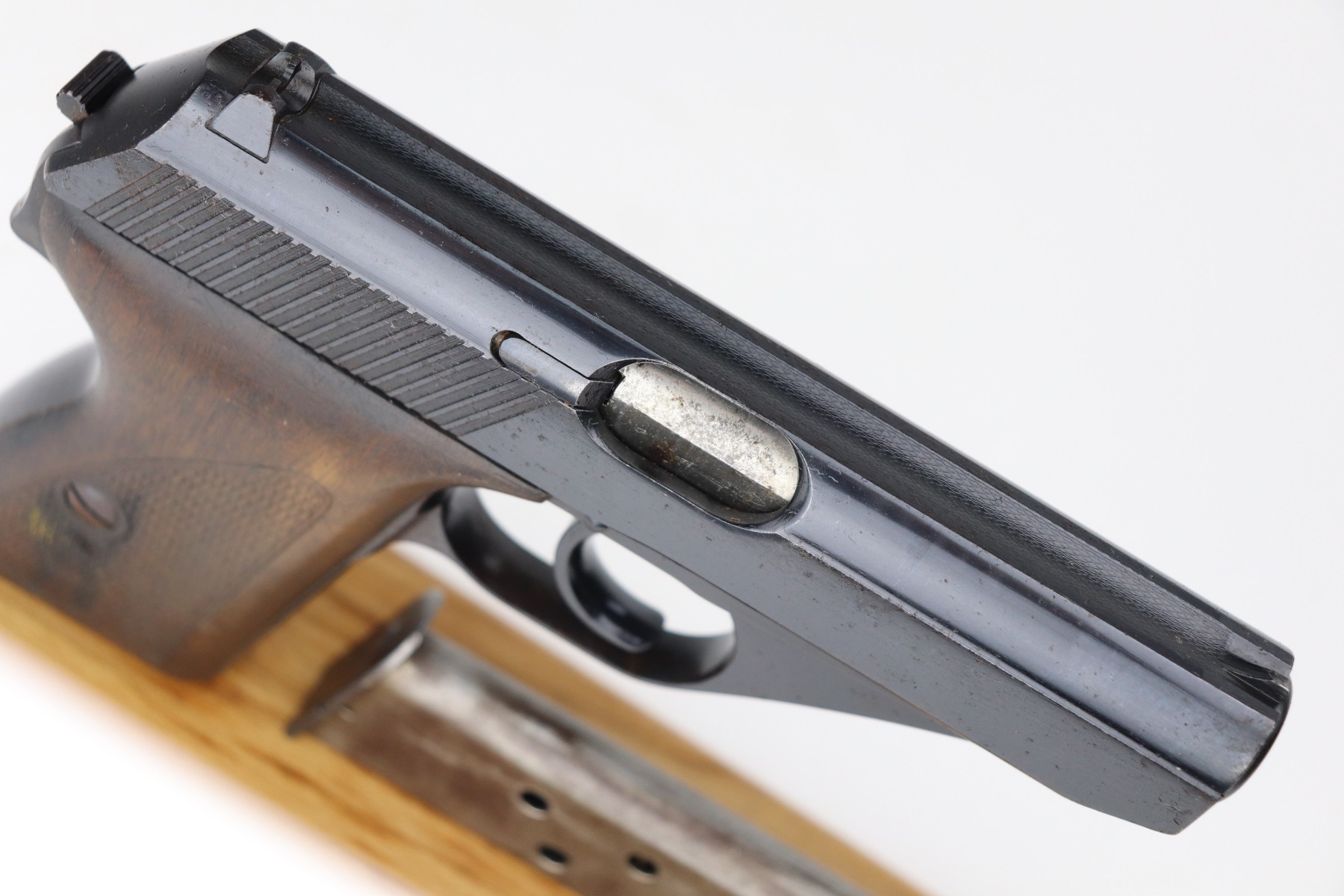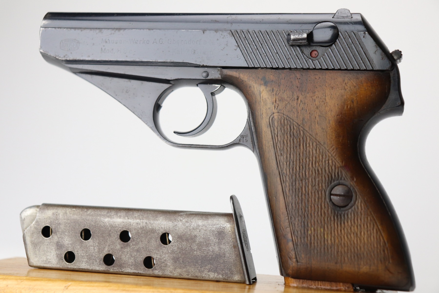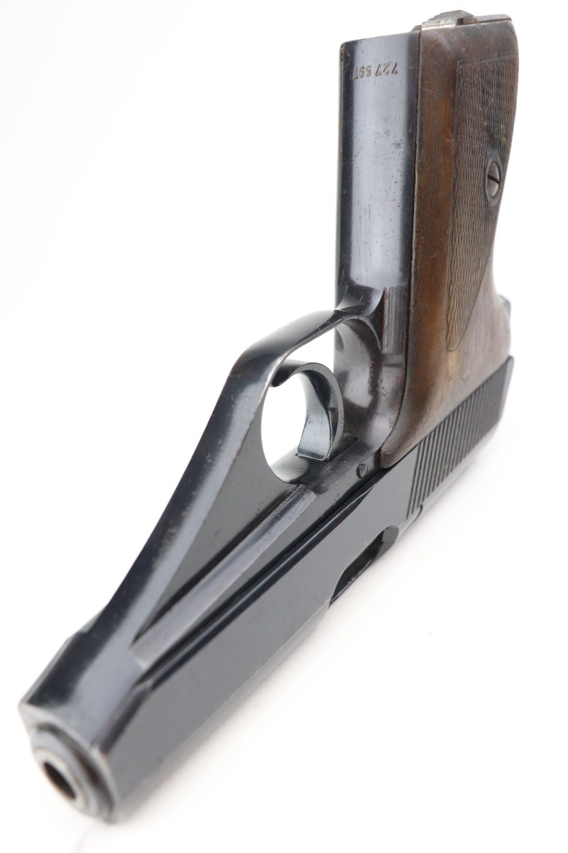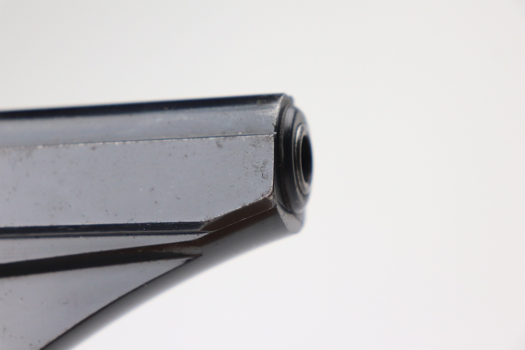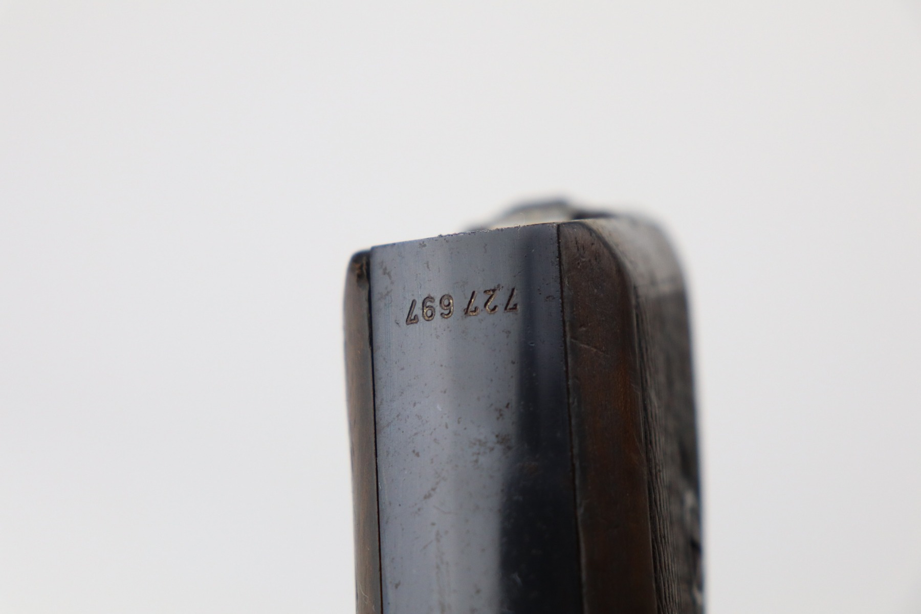 2/9/21 – This is a minty example of a Mauser HSC rig issued to the Nazi military in 1941. It is all matching and has the proper “Eagle 655” military proof. I comes with one un-makred leather holster and a period-correct magazine. The gun has retained 99% of its original bluing – just a hint of wear around the muzzle. Even though there is next to no finish loss, there is spotty freckling throughout. The bore is excellent – shiny with strong rifling and just a bit of frosting in the grooves.