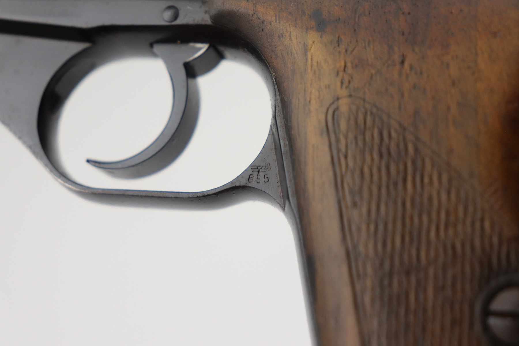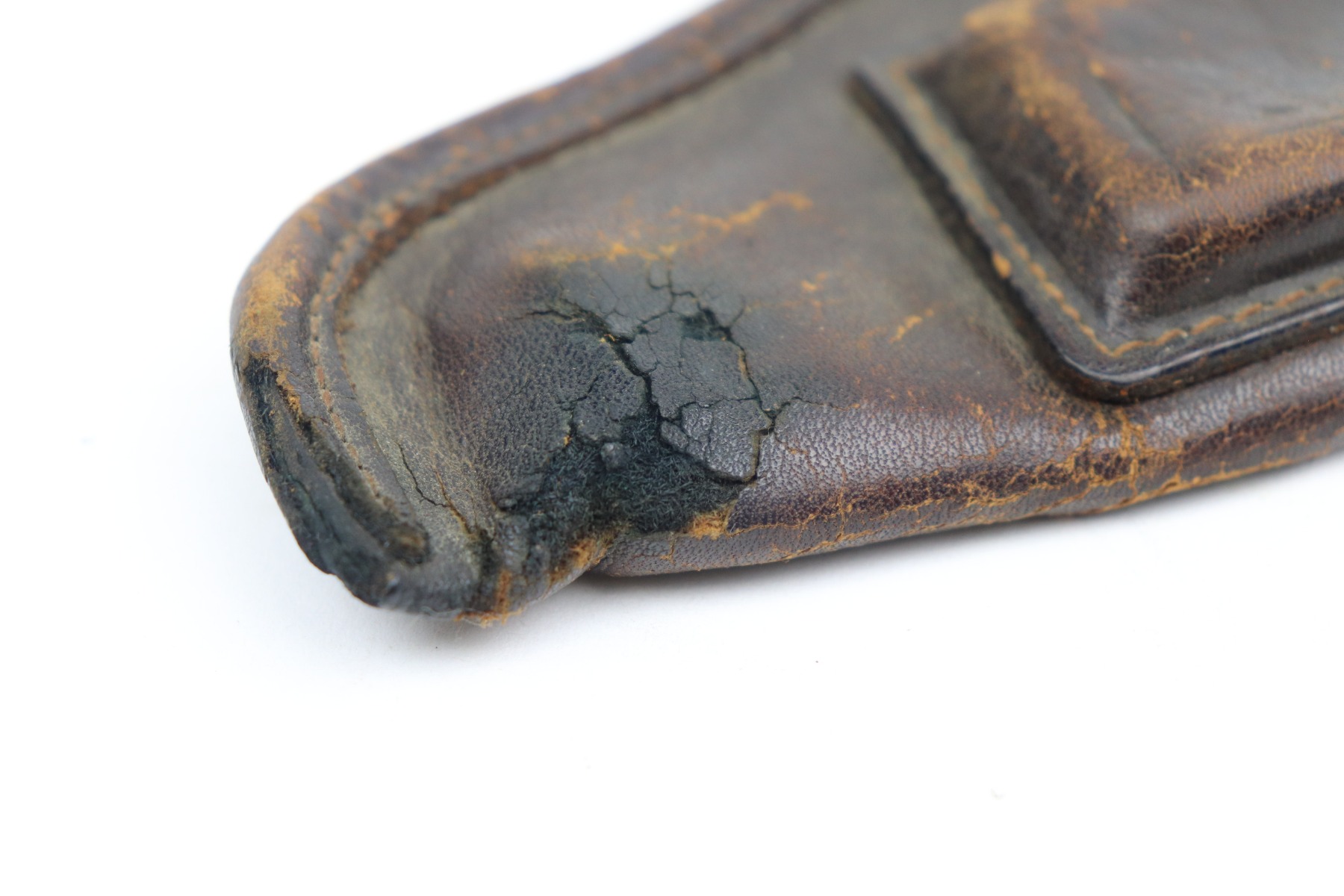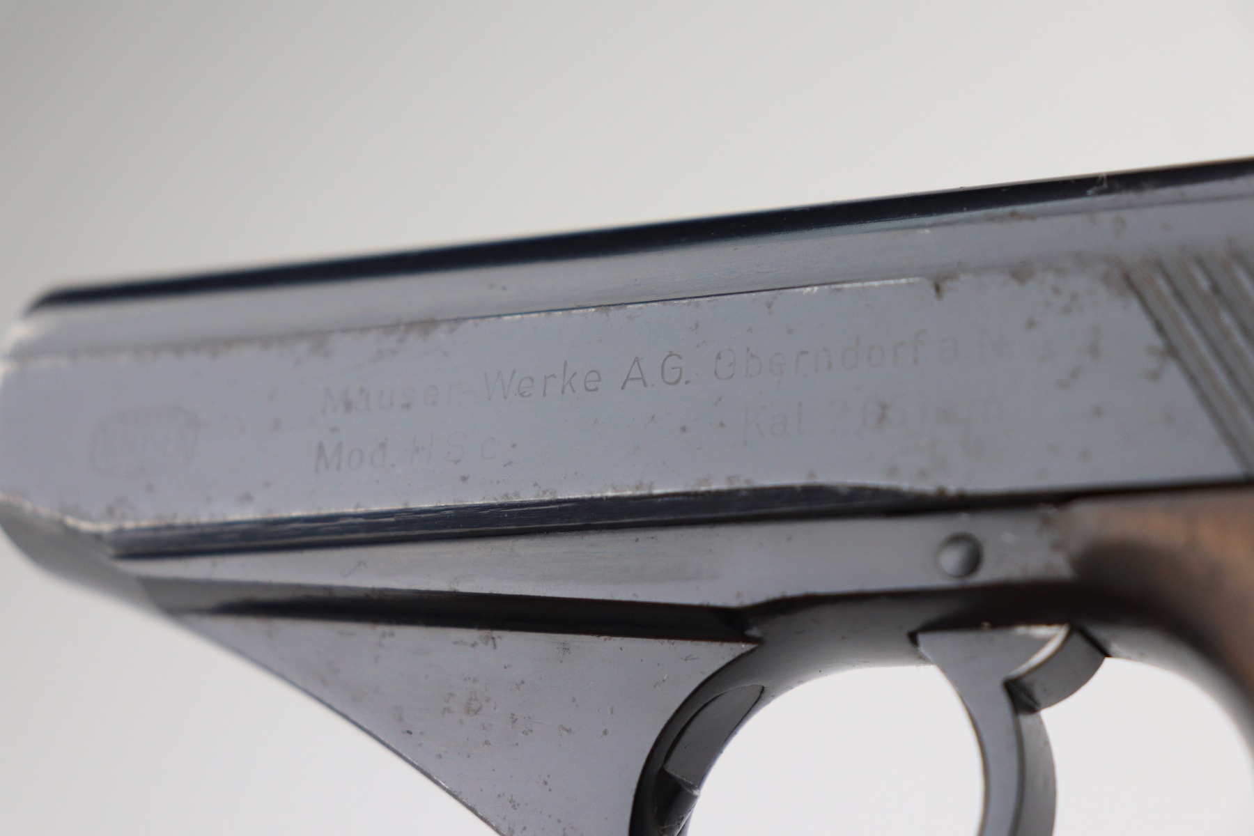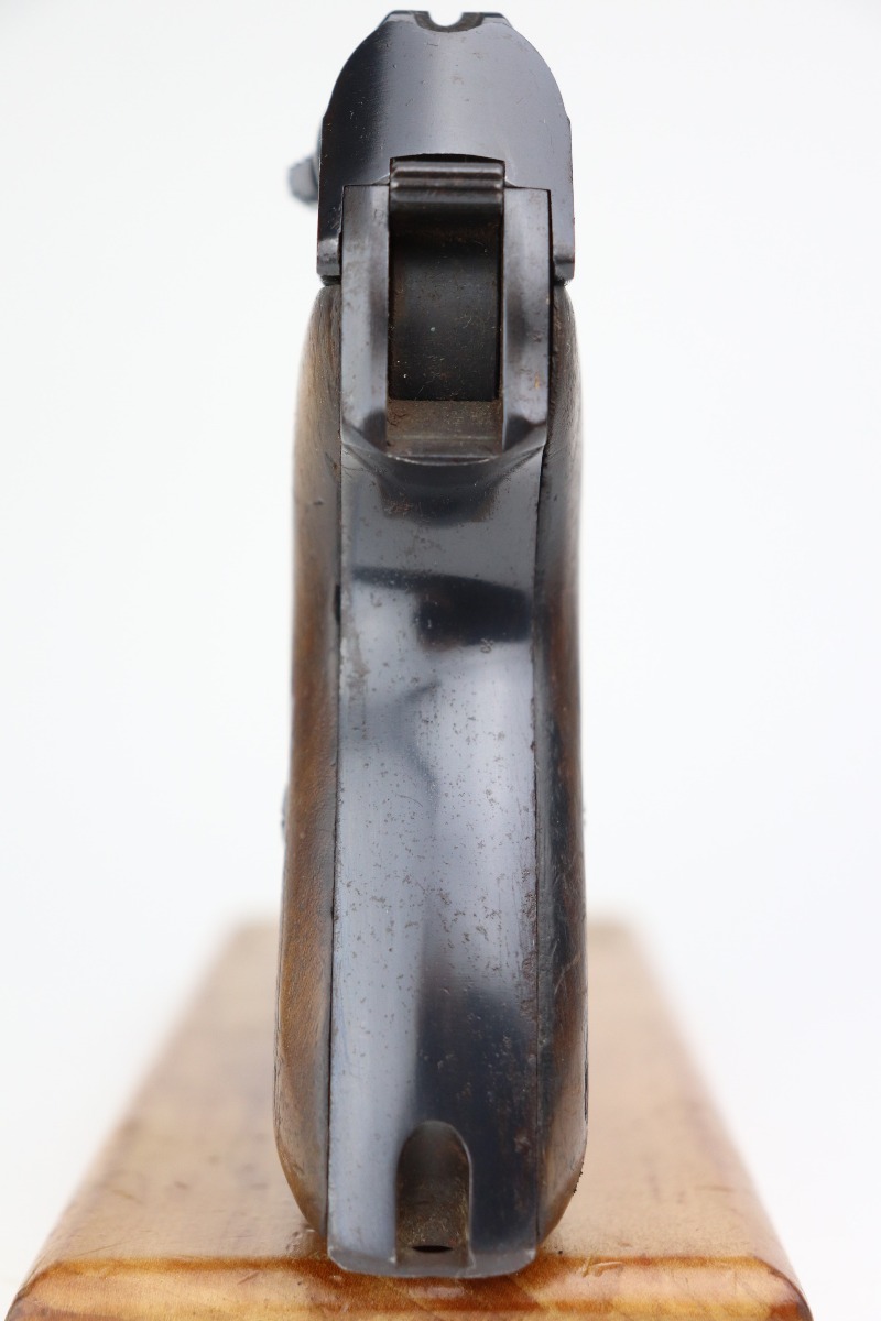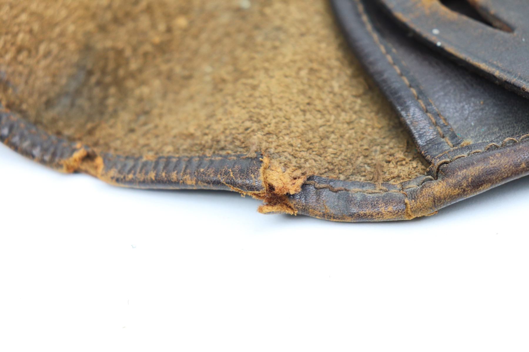 2/9/21 – This is a minty example of a Mauser HSC rig issued to the Nazi military in 1941. It is all matching and has the proper “Eagle 655” military proof. I comes with one un-makred leather holster and a period-correct magazine. The gun has retained 99% of its original bluing – just a hint of wear around the muzzle. Even though there is next to no finish loss, there is spotty freckling throughout. The bore is excellent – shiny with strong rifling and just a bit of frosting in the grooves.
