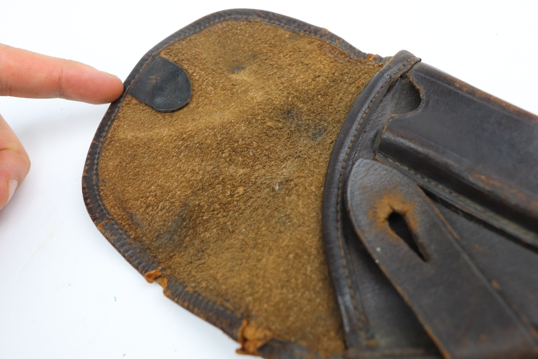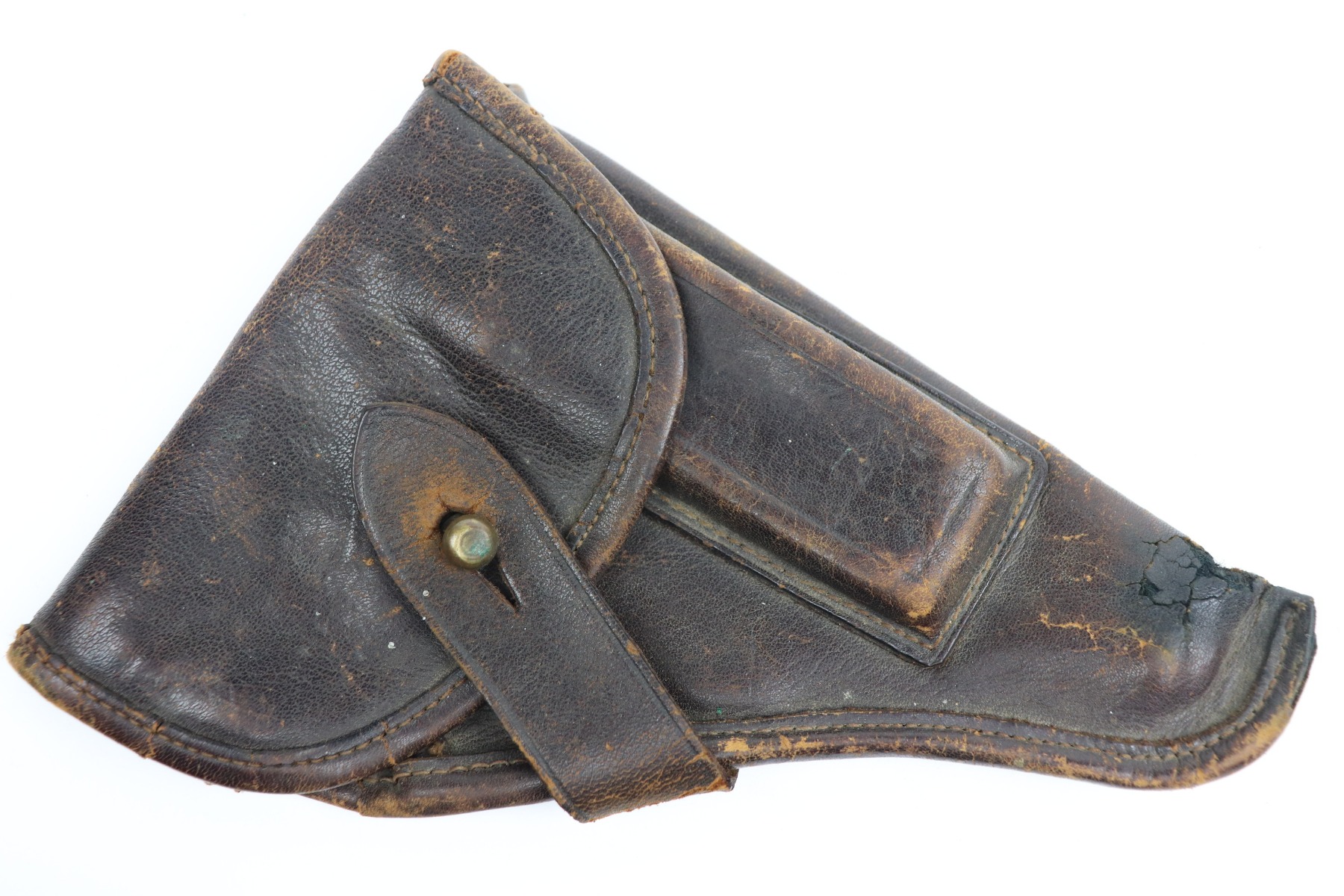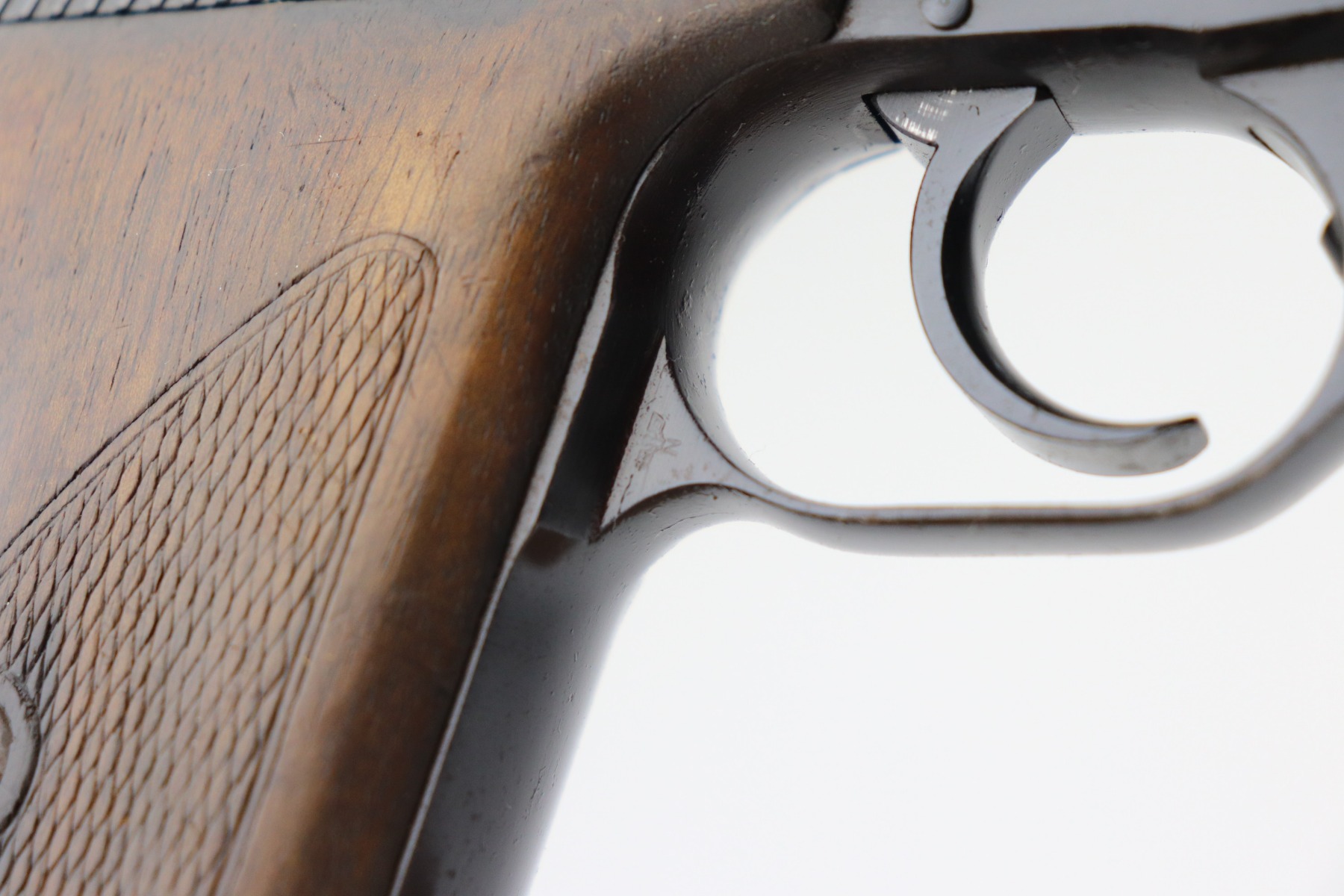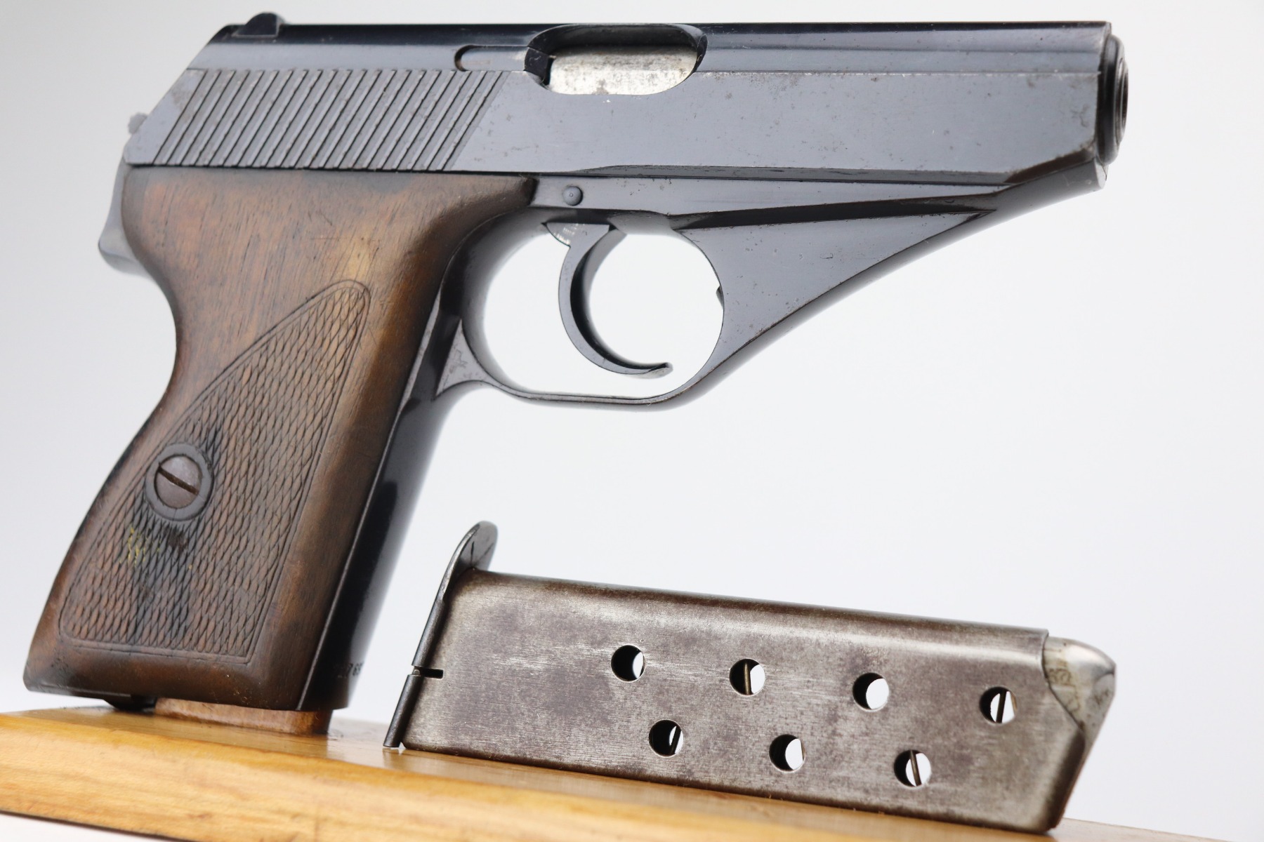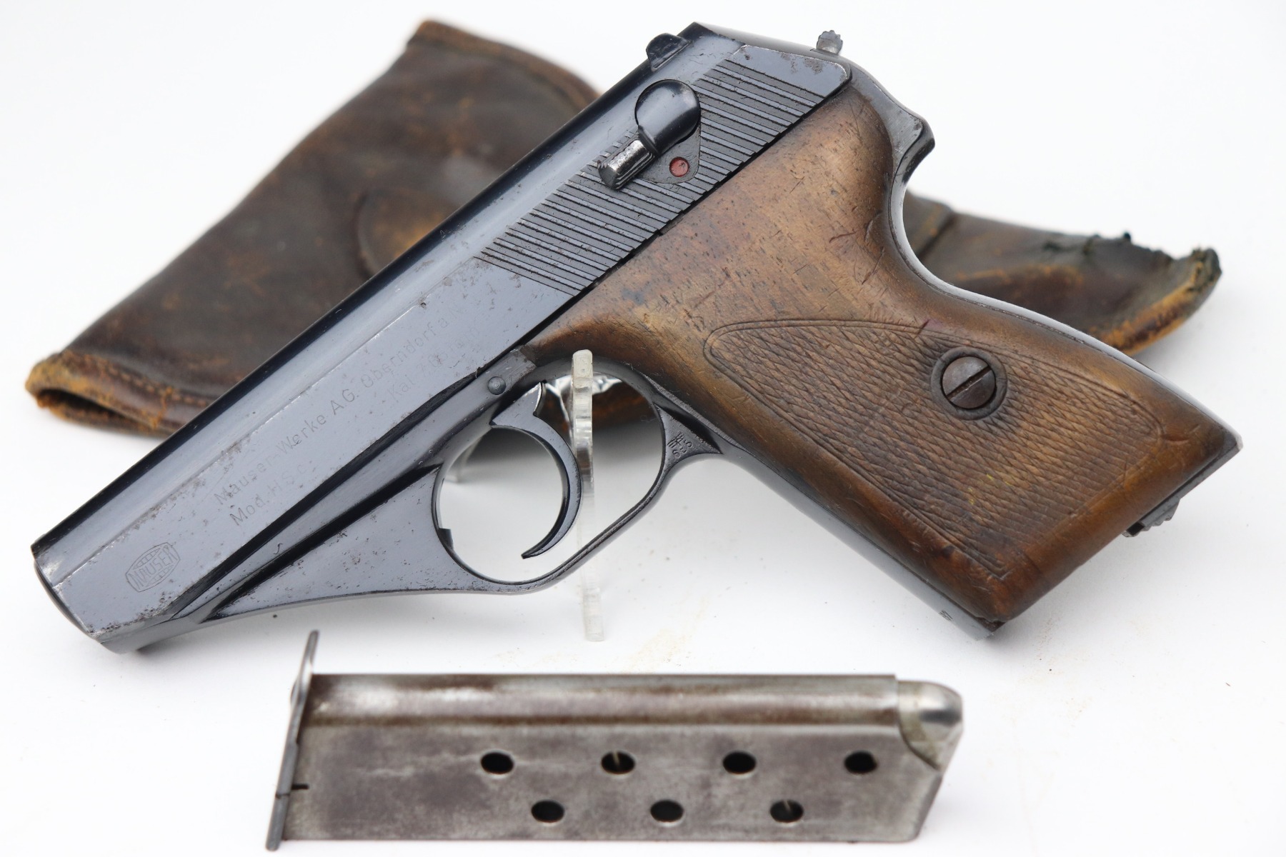 2/9/21 – This is a minty example of a Mauser HSC rig issued to the Nazi military in 1941. It is all matching and has the proper “Eagle 655” military proof. I comes with one un-makred leather holster and a period-correct magazine. The gun has retained 99% of its original bluing – just a hint of wear around the muzzle. Even though there is next to no finish loss, there is spotty freckling throughout. The bore is excellent – shiny with strong rifling and just a bit of frosting in the grooves.