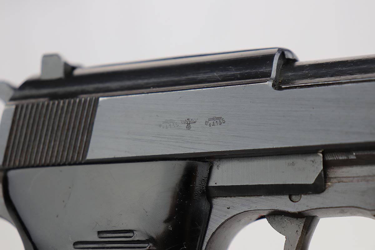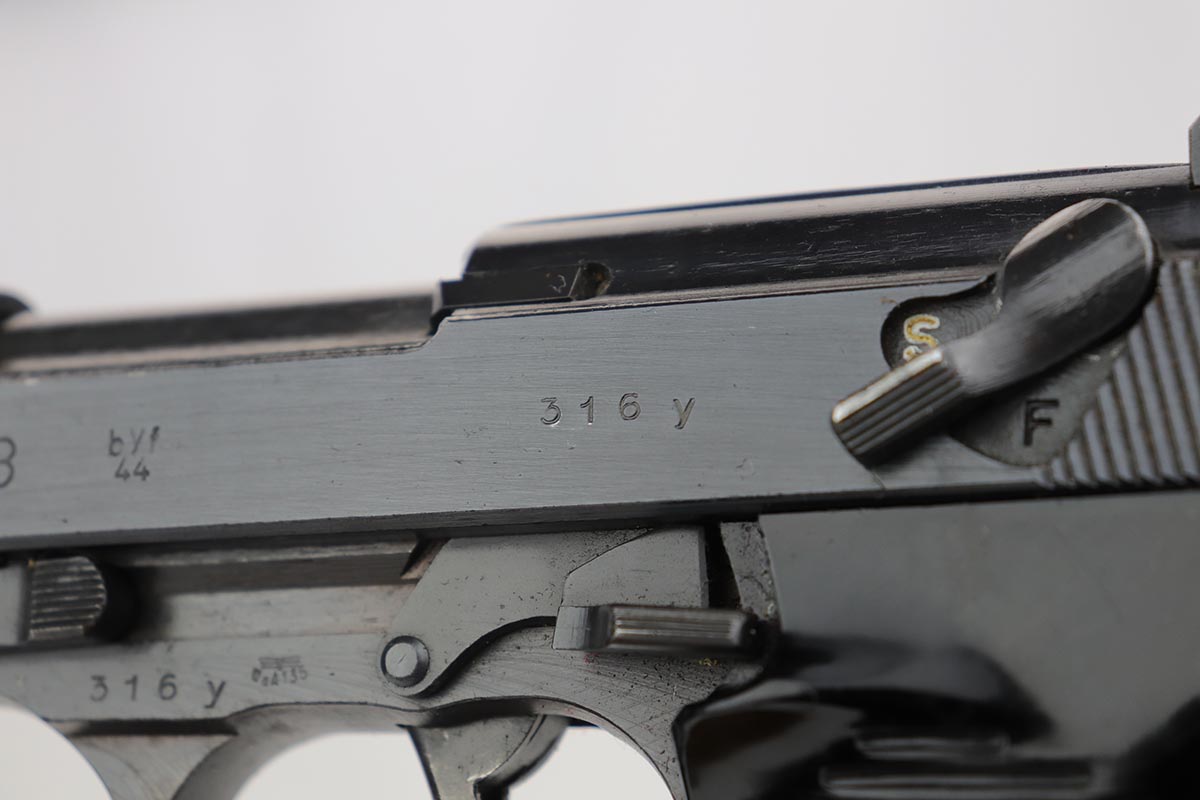9/19/19 – This is a minty Mauser P.38 Rig, made in September of 1944. The gun is in minty condition with just a hint of high-edge and muzzle wear and very minor patina on the front strap. The gun has an excellent profile. The gun is properly E/135 Waffenamt. The grips are excellent. It comes with two period-correct P.38 magazines. The holster is in fair condition. There is significant wear throughout and chunks of leather missing from the left side. It is “jwa” maker marked, Waffenamt (although very faint), and we cannot make out a date. C&R eligible.