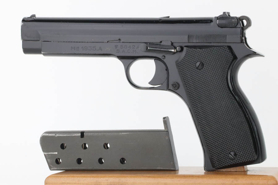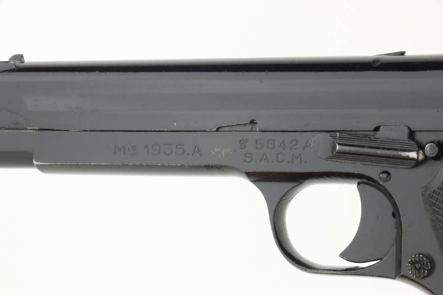 8/13/24 – This is a minty example of a French SACM Model 1935A issued to the Nazi military during WW2. It is all matching with the proper “Waffen 251” military acceptance proof. It has retained about 97% of its original black enamel finish with just some tiny chipping and light handling marks here and there. Fitted with excellent period-correct black bakelite grips. Comes with one proper magazine. The bore is mint.