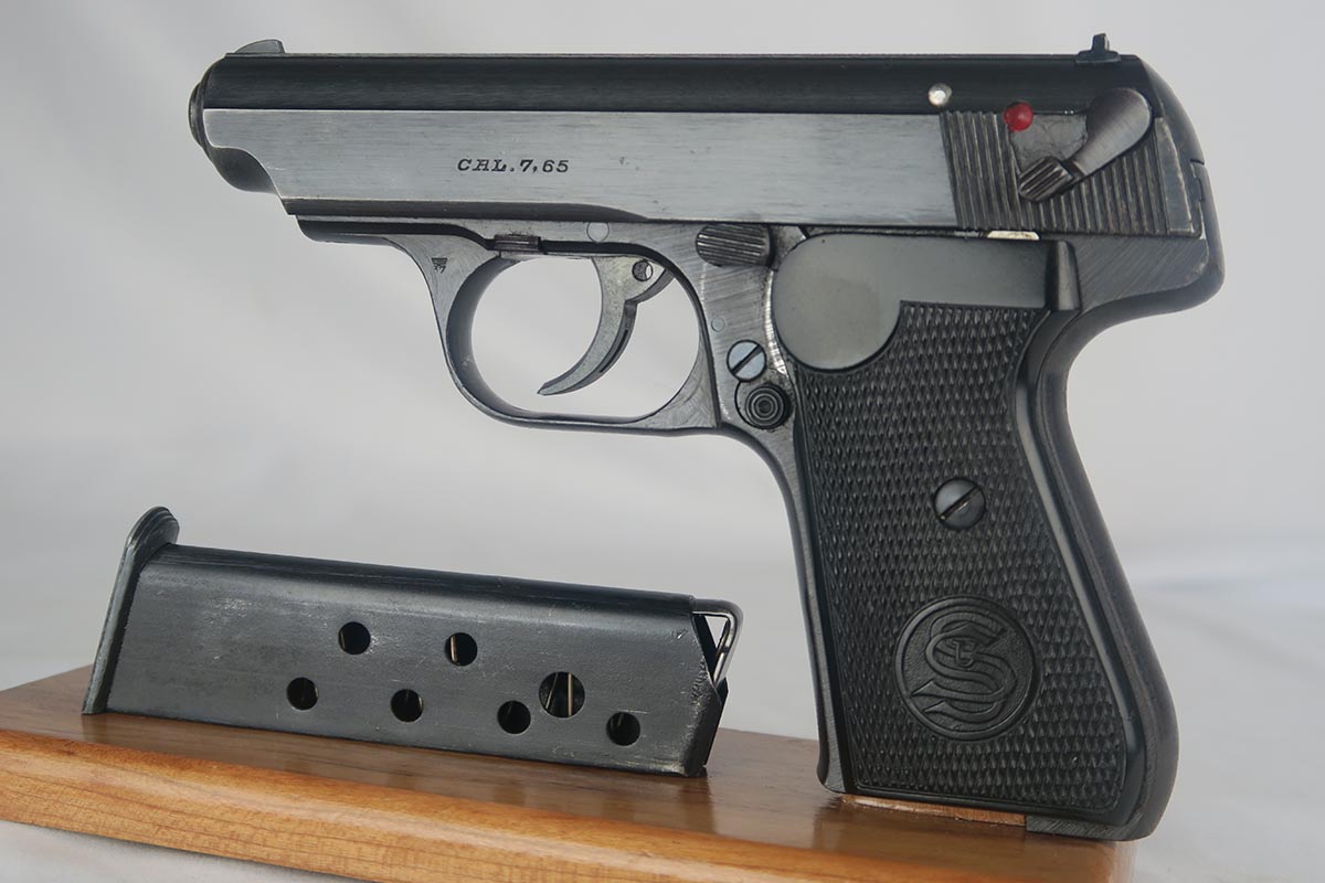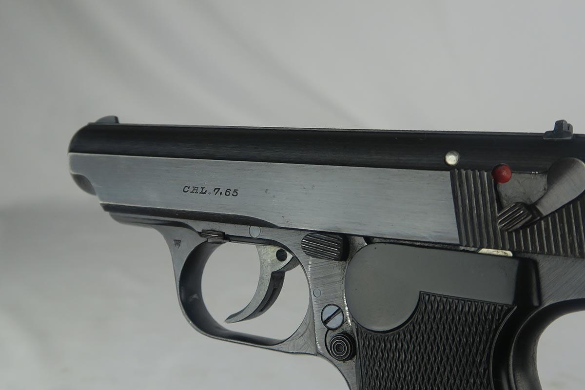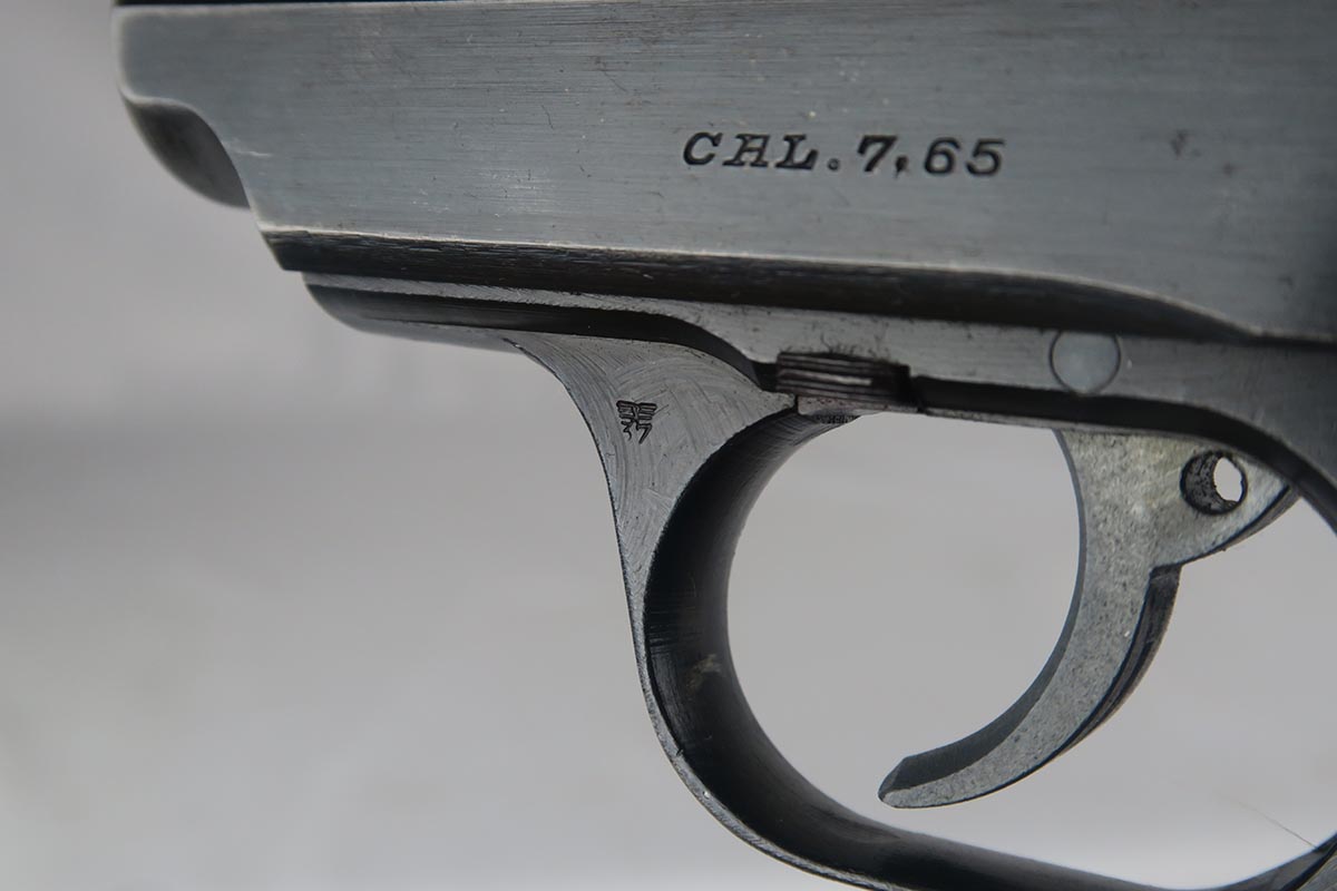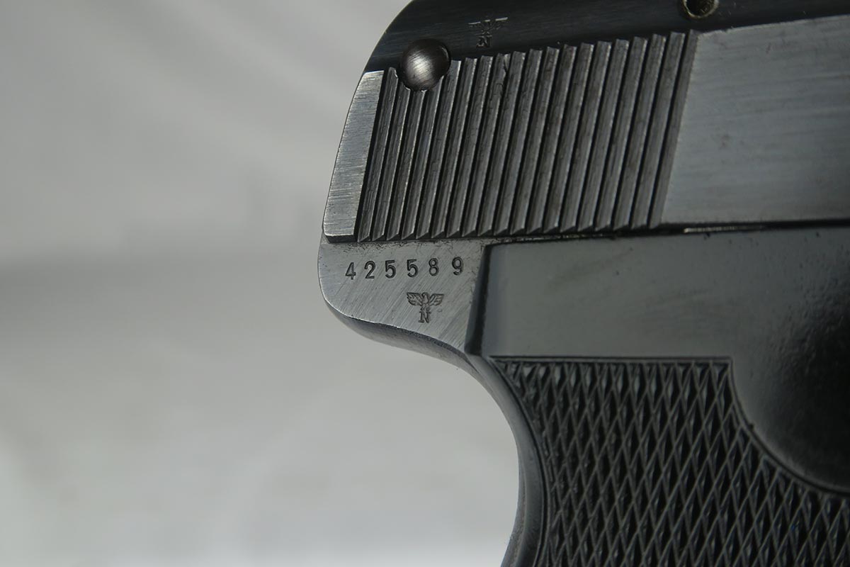 7/26/17 – This is a near-mint Sauer 38h from WW2. It is Nazi issued and waffen proofed (E/77) on the trigger guard. All original and correct, the finish rates at about 99% with minor thinning but a beautiful front strap. Back strap does show some minor patina. Excellent original grips. Minty bore. Double ‘S’ mag.