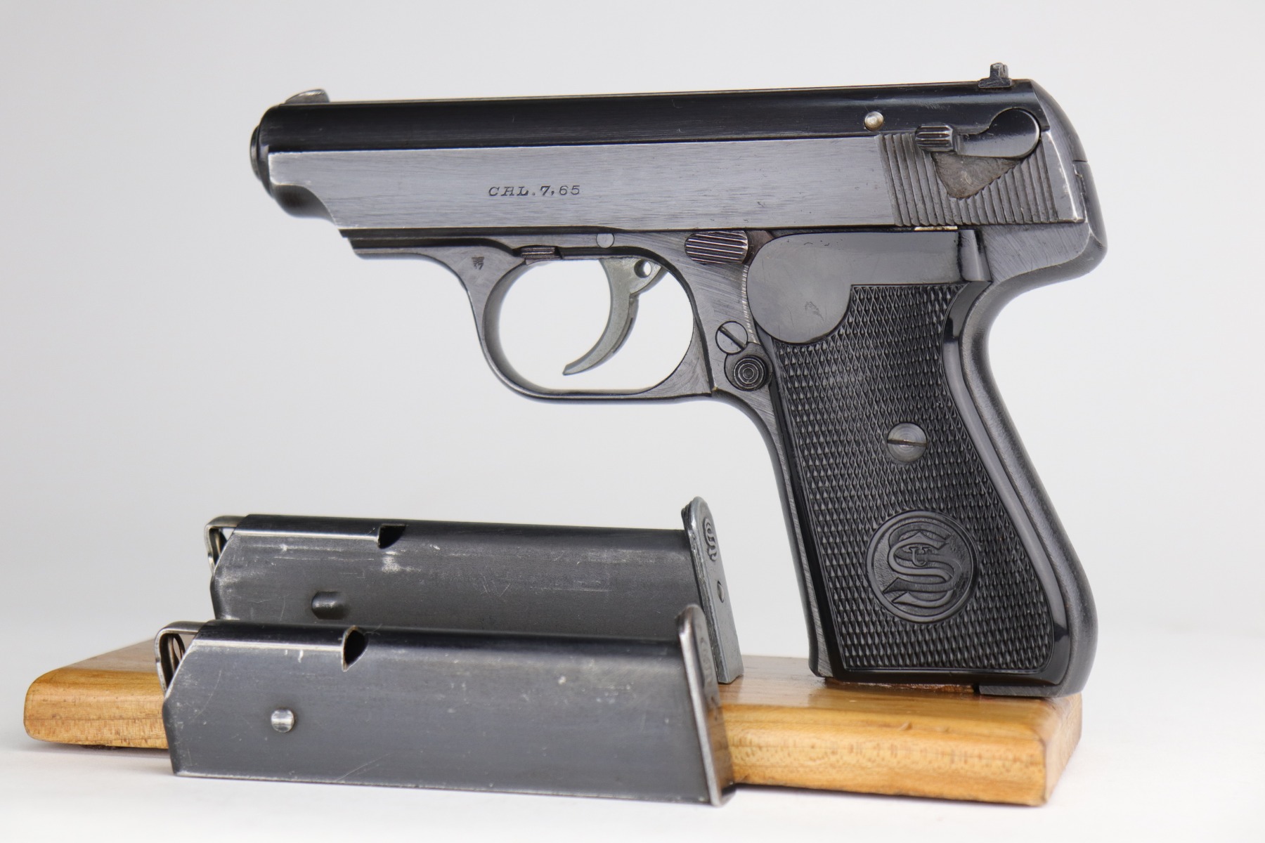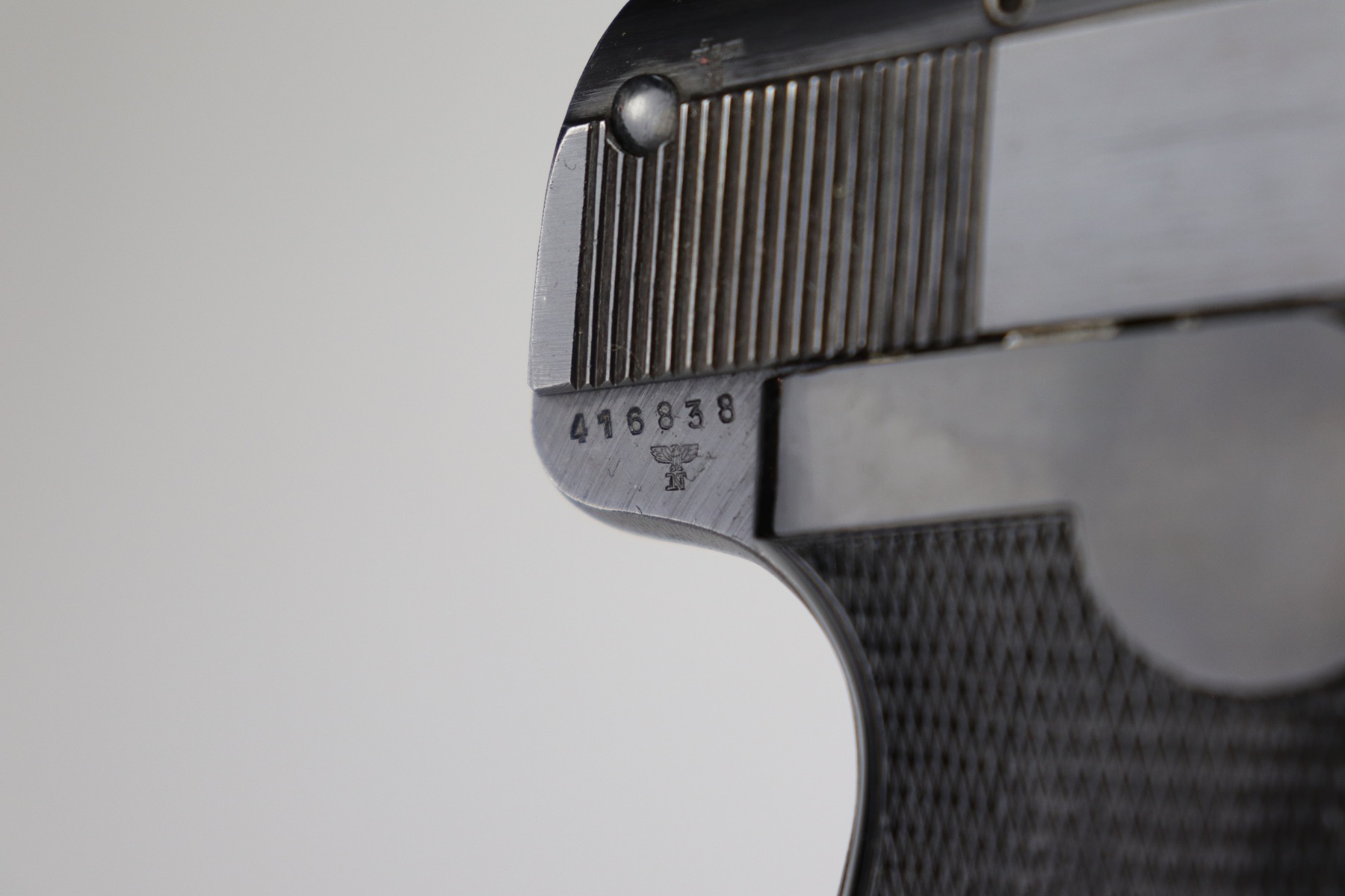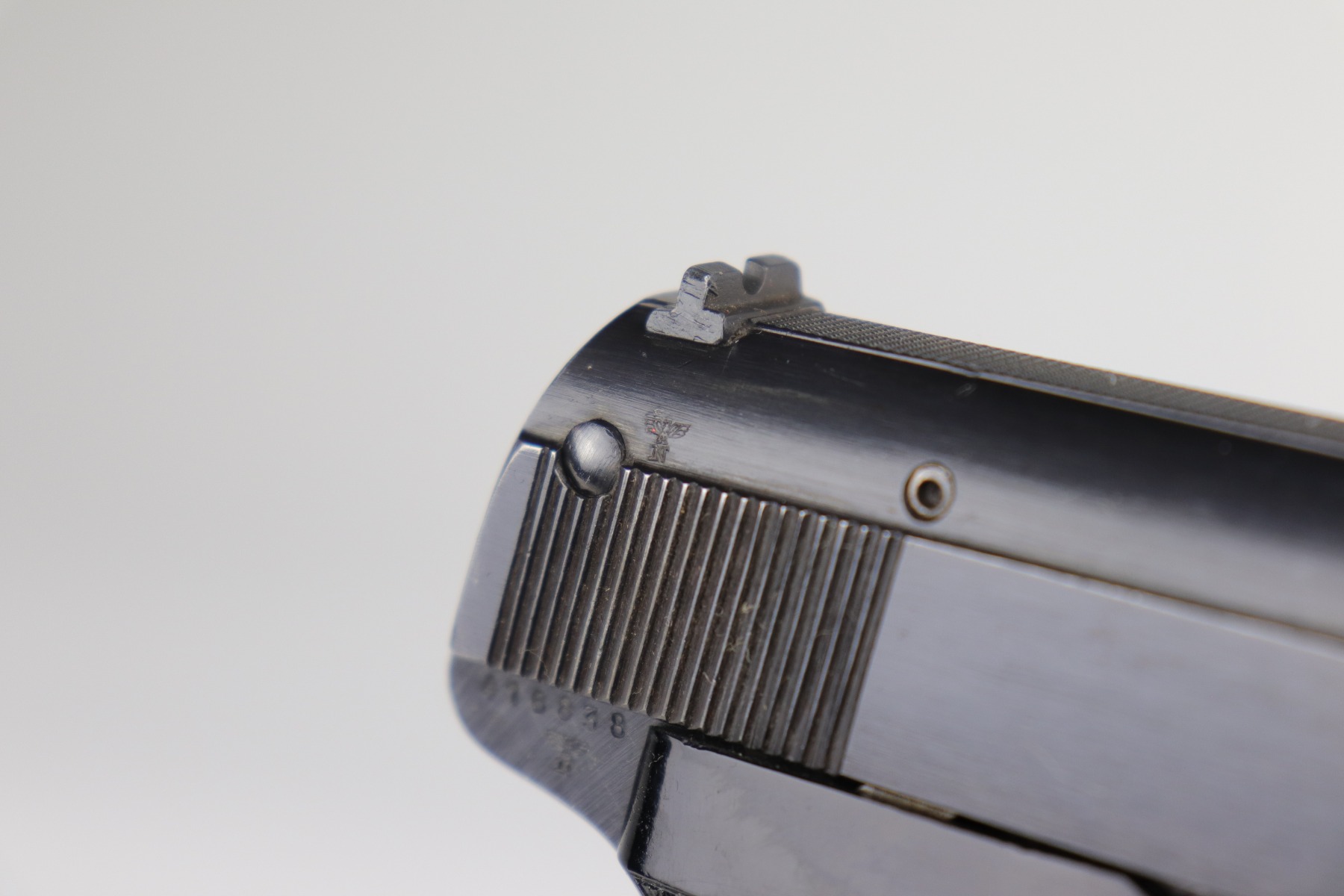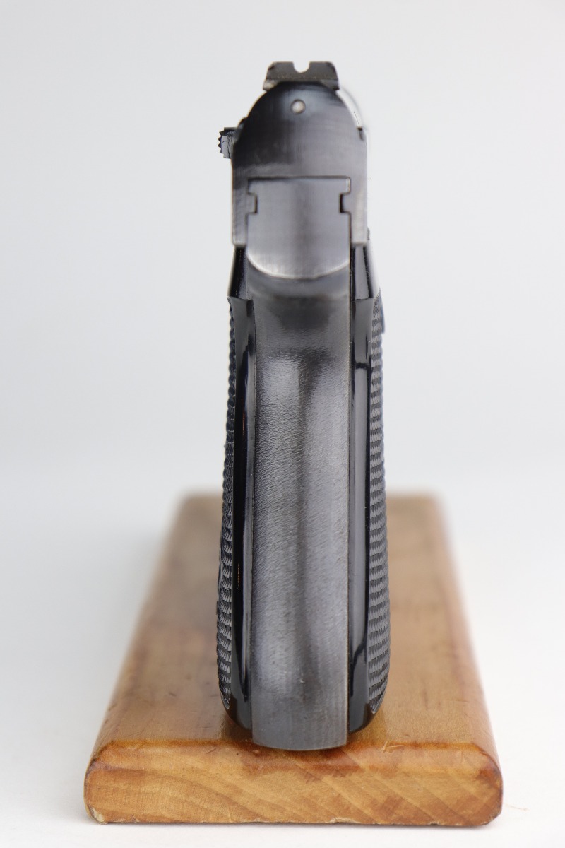12/21/20 – This is a minty example of a Sauer 38h rig issued to the Nazi military during WW2. It is all correct and has the proper “Eagle 37” Nazi military acceptance proof on the trigger guard. The rig comes with two period-correct magazines and a nice un-marked brown leather holster. The gun has retained about 98% of its original bluing. There is a hint of wear around the muzzle, a few very small spots on the right side of the slide, and one small spot on the front strap. Excellent period-correct grips. The bore is near-mint.