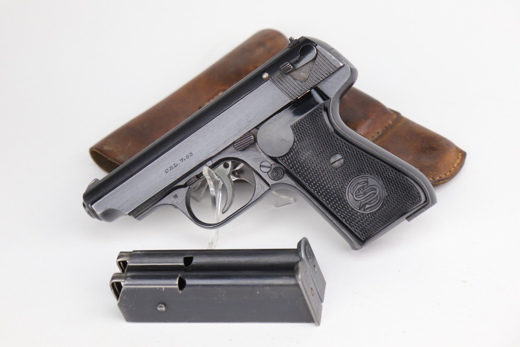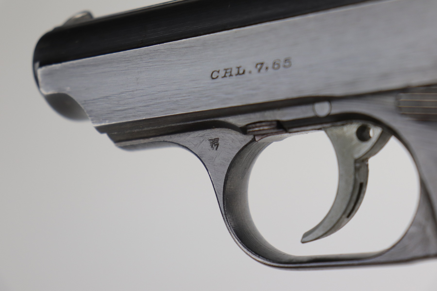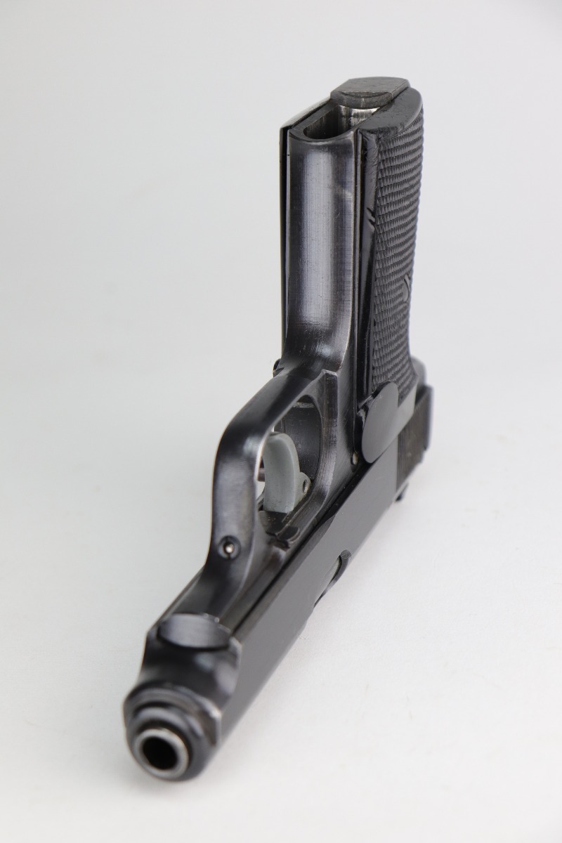12/21/20 – This is a minty example of a Sauer 38h rig issued to the Nazi military during WW2. It is all correct and has the proper “Eagle 37” Nazi military acceptance proof on the trigger guard. The rig comes with two period-correct magazines and a nice un-marked brown leather holster. The gun has retained about 98% of its original bluing. There is a hint of wear around the muzzle, a few very small spots on the right side of the slide, and one small spot on the front strap. Excellent period-correct grips. The bore is near-mint.