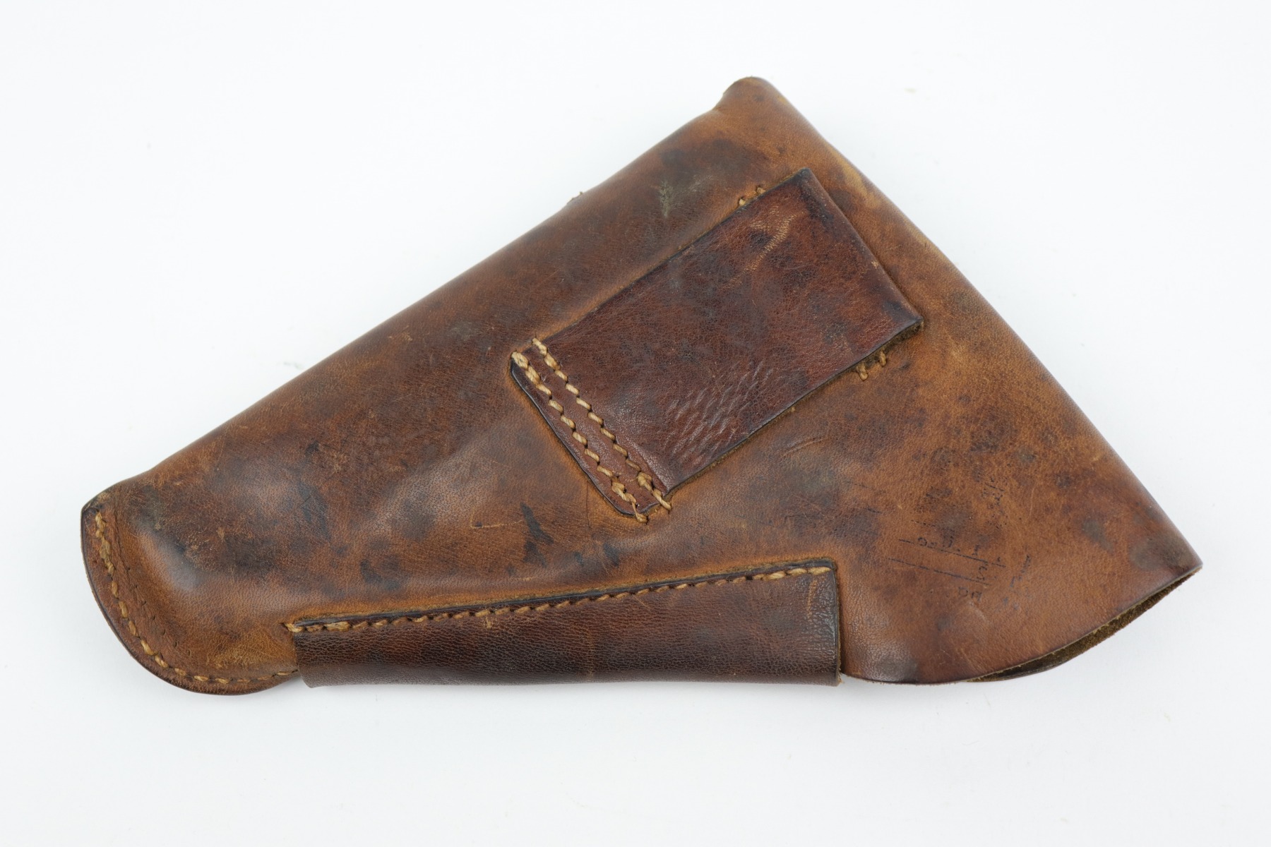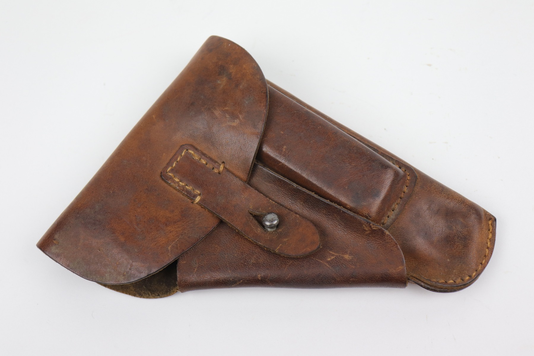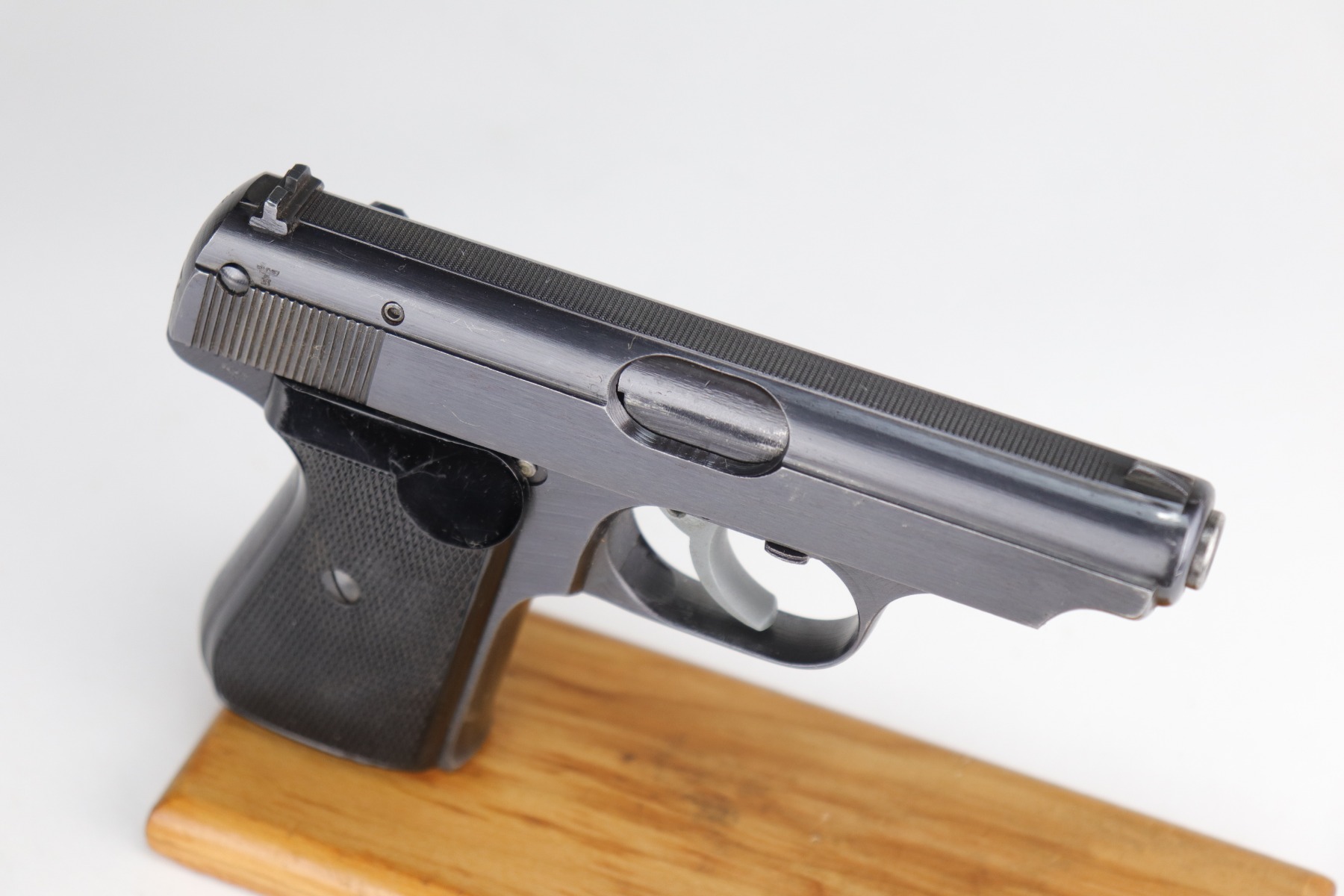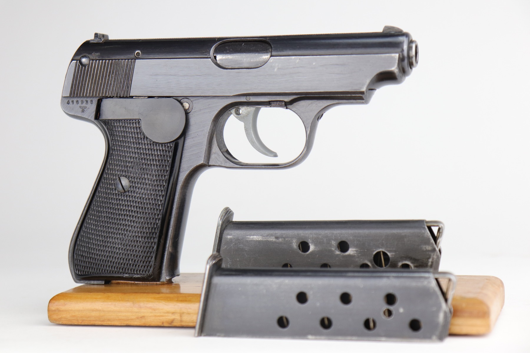 12/21/20 – This is a minty example of a Sauer 38h rig issued to the Nazi military during WW2. It is all correct and has the proper “Eagle 37” Nazi military acceptance proof on the trigger guard. The rig comes with two period-correct magazines and a nice un-marked brown leather holster. The gun has retained about 98% of its original bluing. There is a hint of wear around the muzzle, a few very small spots on the right side of the slide, and one small spot on the front strap. Excellent period-correct grips. The bore is near-mint.