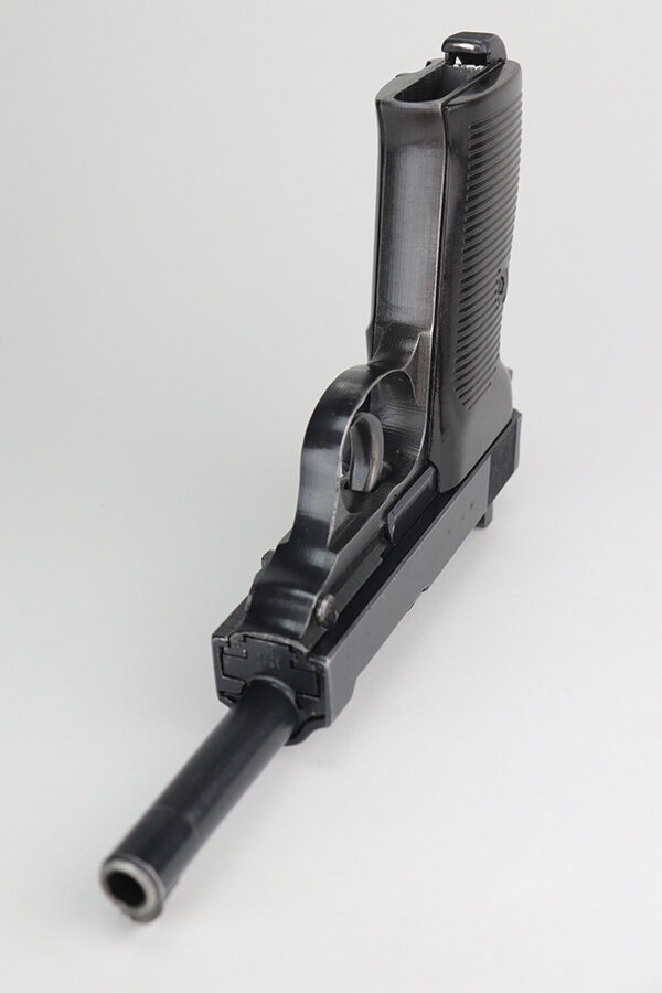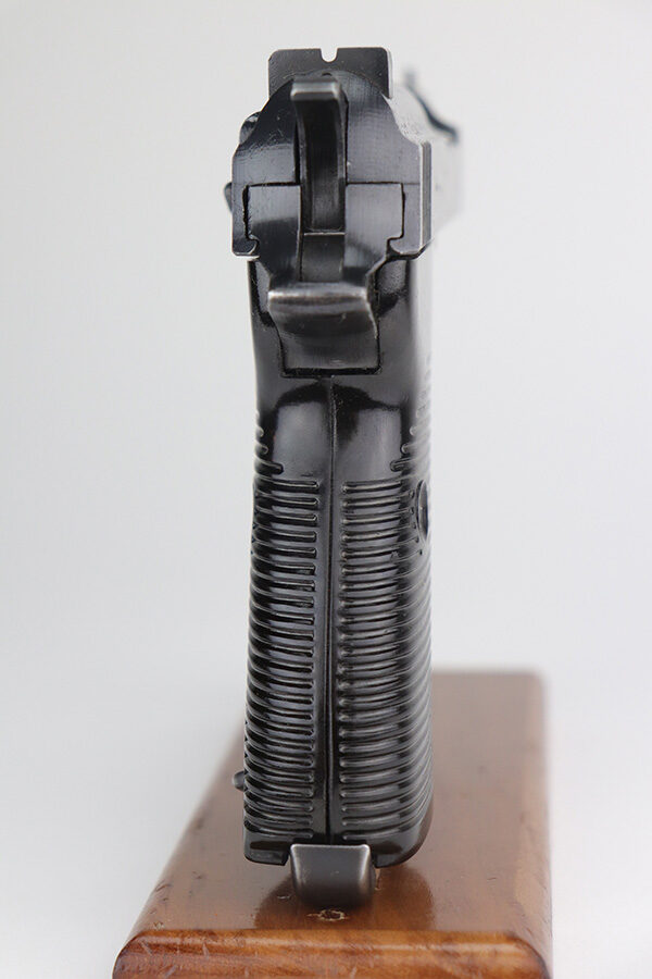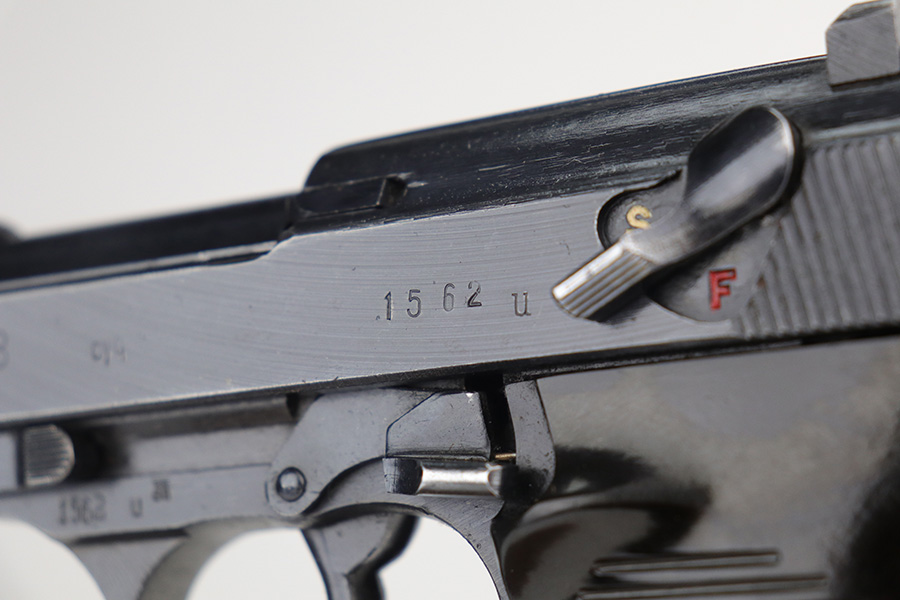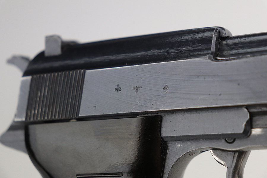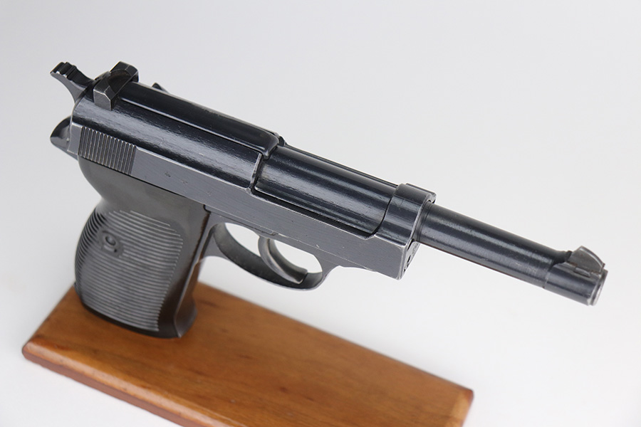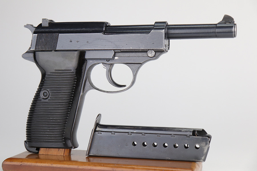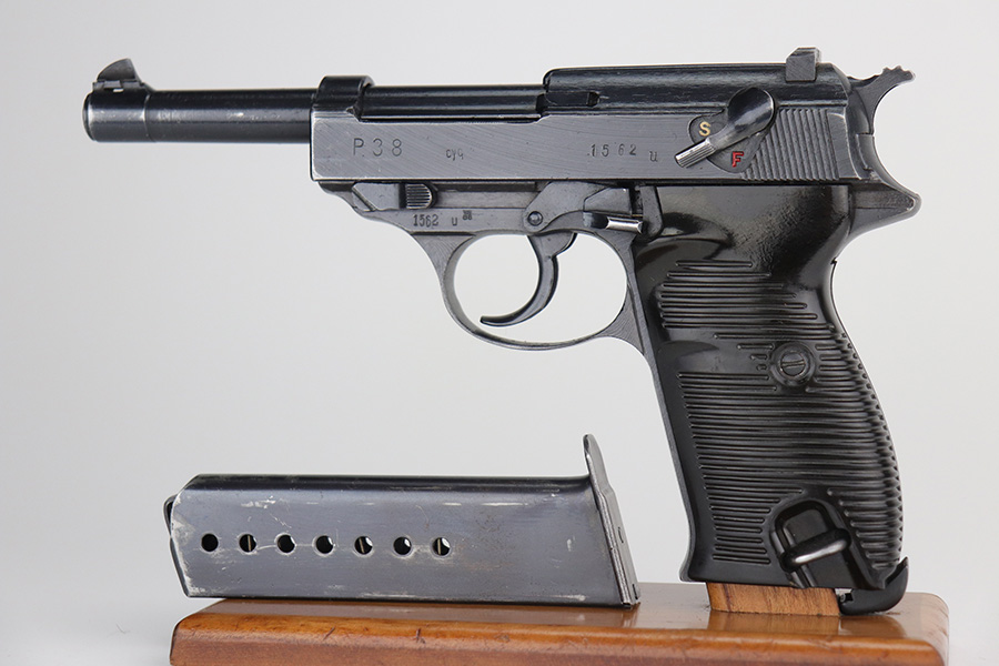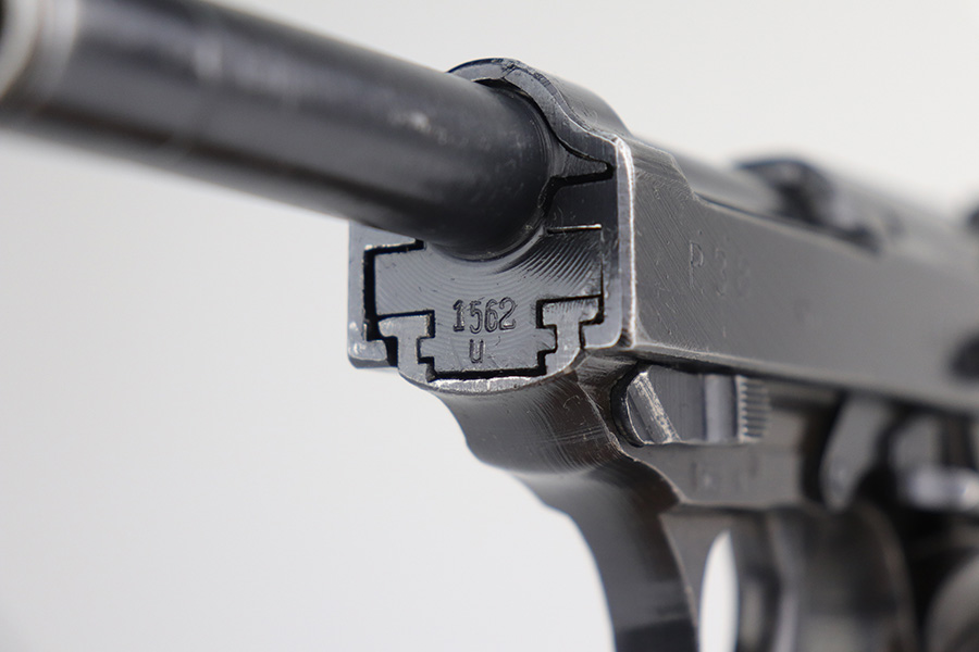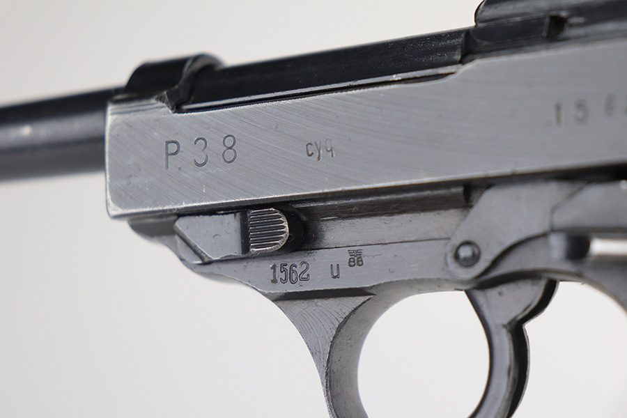 11/23/21 – This is a minty example of a Spreewerk P.38 issued to the Nazi military in September of 1944. The gun is all matching and has the proper “Eagle 88” Nazi military acceptance proofs. There is an “asterisk” marking on the right side of the barrel, indicating it failed initial inspection and was sent back to the factory for repair. It has retained about 97% of its finish with hints of wear on the front edges of the slide, around the muzzle, and a couple of small spots on the left side of the barrel. There is just a hint of thinning and and very minor freckling on the front strap. Very minor wear on the top plate. Comes with excellent bakelite grips and one period-correct “jvd” magazine. The bore is mint. De-cocker is functional.