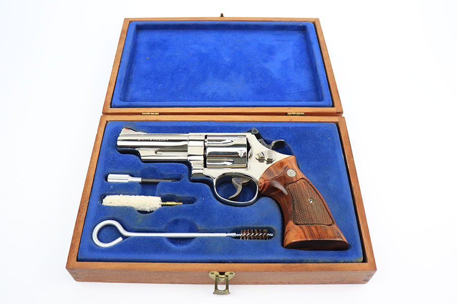 10/6/22 – This is a minty S&W 29-2 in the original case. Dirty Harry gun with four inch barrel. Factory nickel finish with just the minor turn line on the cylinder. Mint bore and grips. Smooth action and great timing/lockup. Pinned barrel and recessed cylinder. Comes with the original case and the S&W brush set. FFL required.