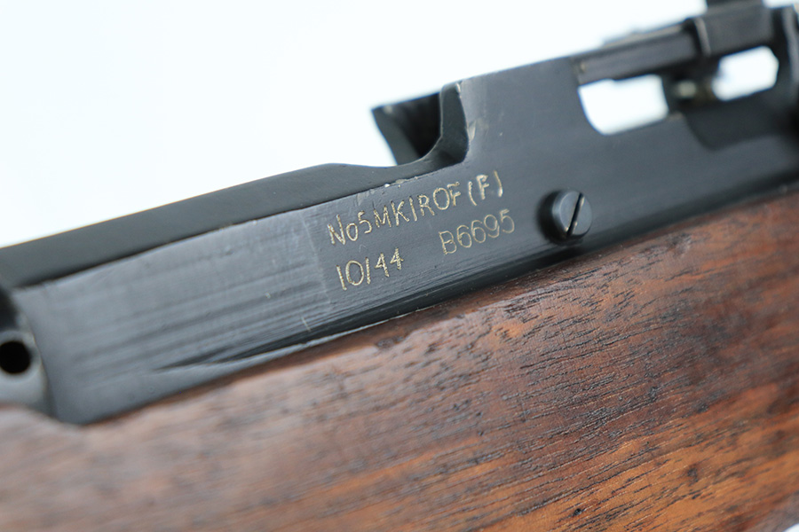 5/11/22 – This is a minty ROF (Fazakerley) No 5 Mk 1 Jungle Carbine issued to the British military in October of 1944. The Lee-Enfield No.5 Mk 1 gained its nickname, “Jungle Carbine,” from British troops who used the weapon in the Pacific Theater, but the name was never officially used by the military. The Jungle Carbine is a lighter, shorter variation of the No. 4 Mk I and was designed for use by British airborne forces. It is easily identifiable by the prominent flash hider that was designed to compensate for the increased flash that came with the shorter barrel. The rifle was only produced from 1944-1947 as it was ultimately seen as a flawed gun because it had a large recoil due to the short barrel and soldiers complained it had a “wandering zero.” Only about 250,000 of these rifles were produced. This one is all matching and in minty condition. There are some light handling marks along the barrel, some tiny dings on the bolt handle, and light scratchy wear on the left side of the receiver. Minty bore.