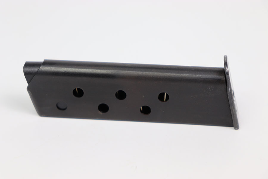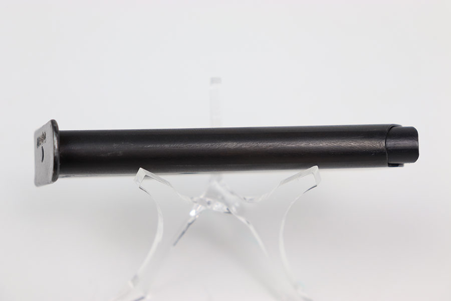 2/14/24 – This is an original WW2 production 9mm Walther PP magazine with a serial numbered base. This would likely go to a Luftwaffe issued pistol. The magazine is in minty condition with very little wear. The left side of the magazine is stamped with the Walther banner and underneath is “Cal. 9 m/m.” The bases original bluing is in excellent condition, the serial number is partially punched out. Please see images. The spring is strong, smooth, and fully functional.