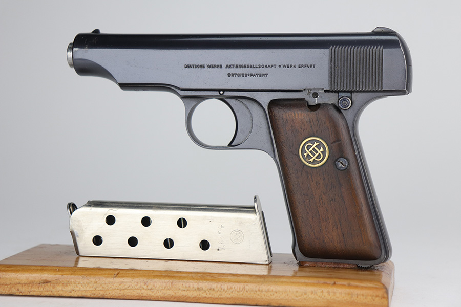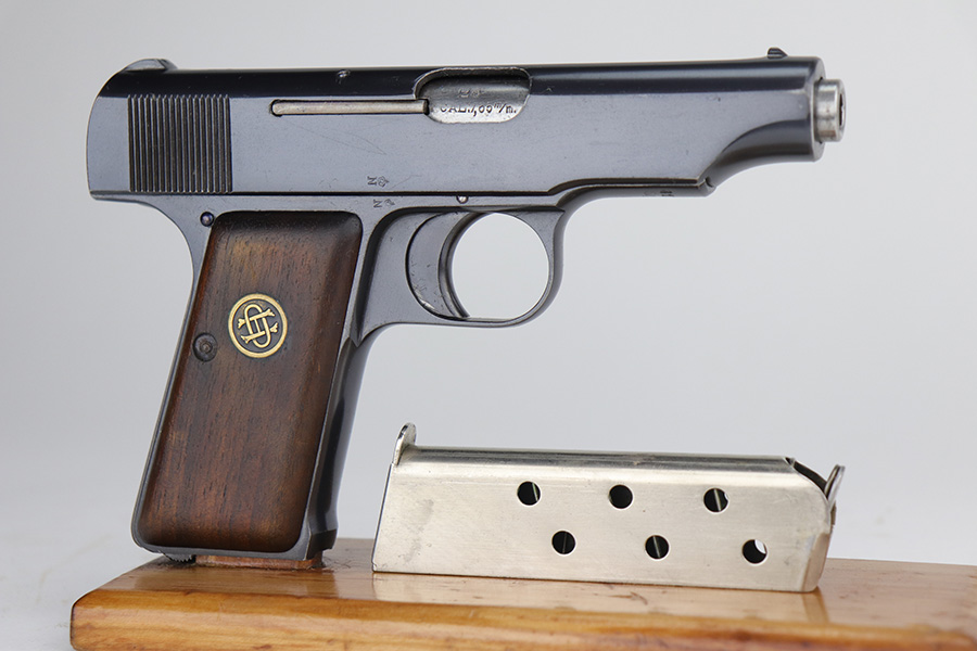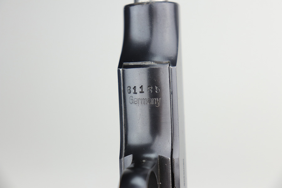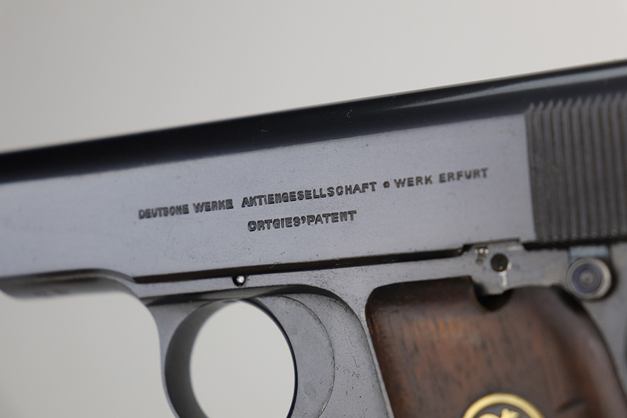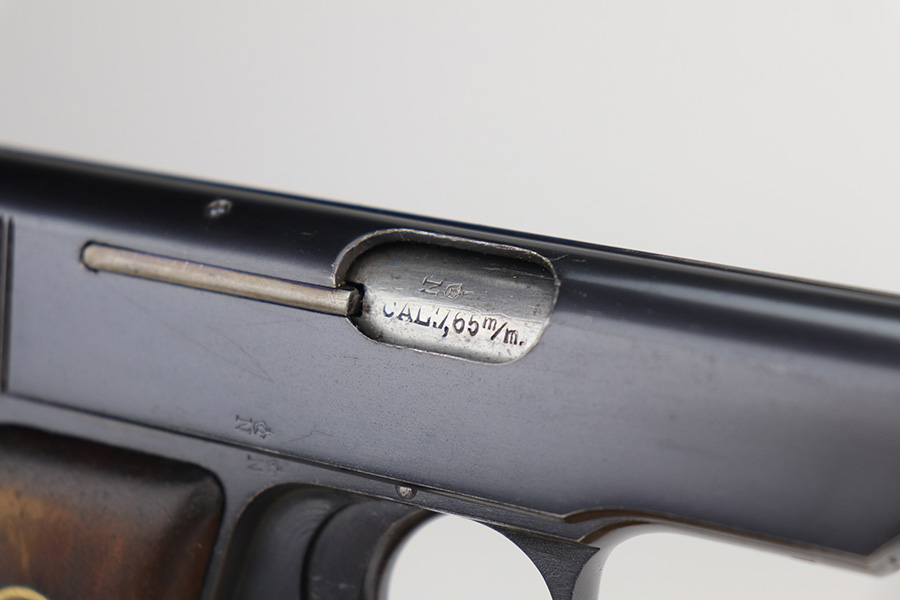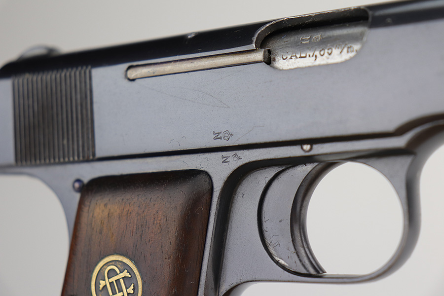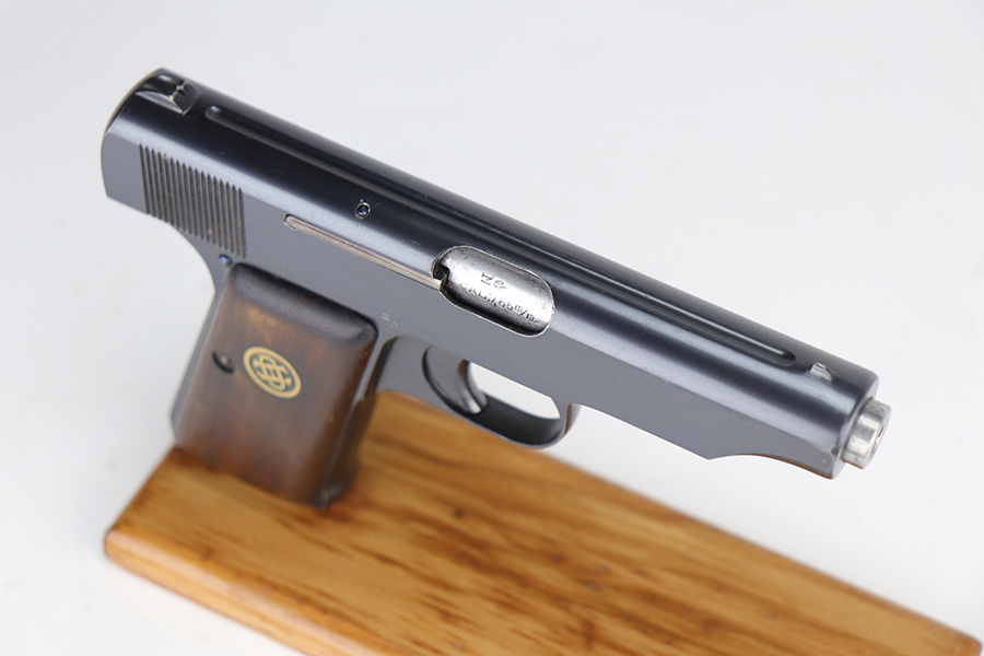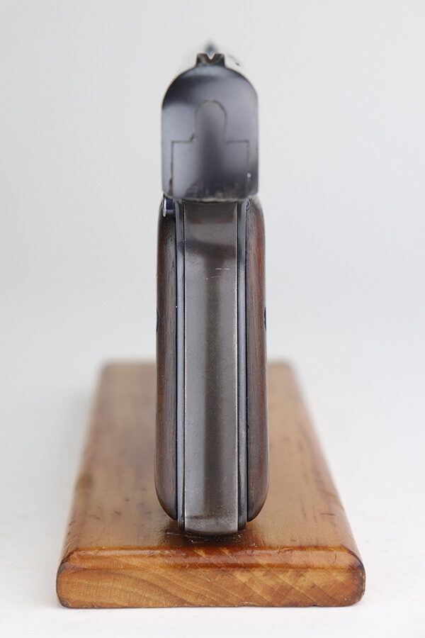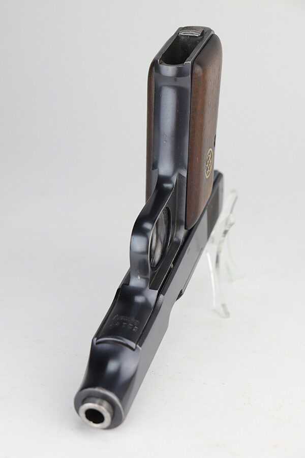 11/5/21 – This is a minty example of an Ortgies semi auto pistol manufactured in the 1930’s. The gun is all matching and has the proper “Crown N” commercial proofs. This one is a “button safety model”. This variation was produced upon special request and featured an added safety button just above the left grip panel. It was often ordered by the military or police. This one is configured for the additional safety but is unfortunately missing the actual safety button. It has retained about 97% of its original bluing. Just a hint of thinning on the back strap and a hint of wear around the muzzle. There is a small handling mark on the front strap and a series of tiny dings on the tang. A couple of very light scratches on the right side of the slide. Comes with excellent wood grips and a period-correct factory-nickeled magazine. The bore is excellent – shiny with strong rifling.