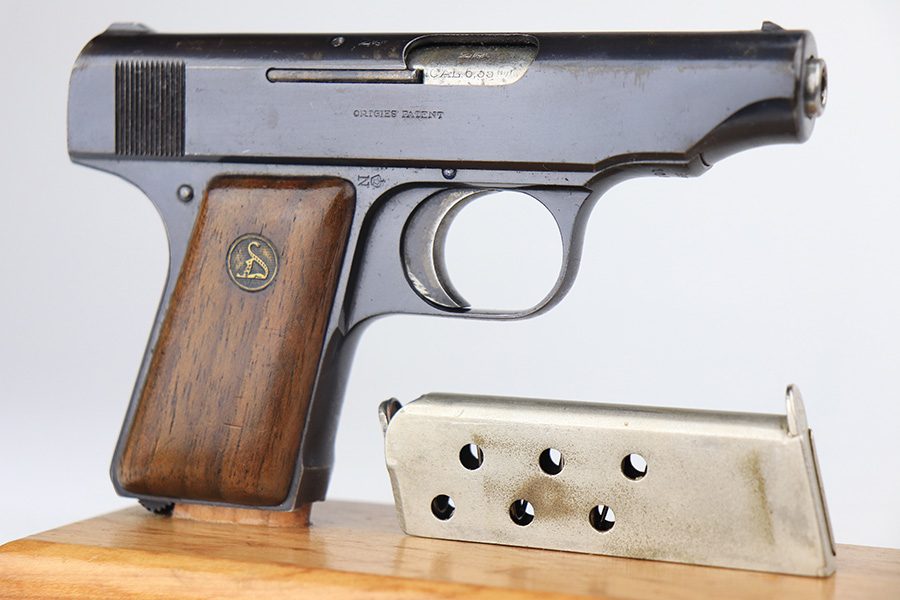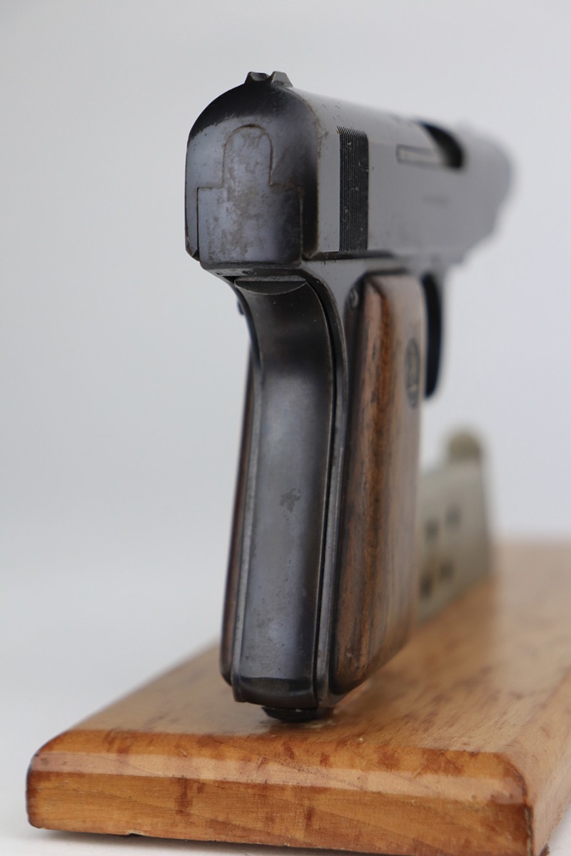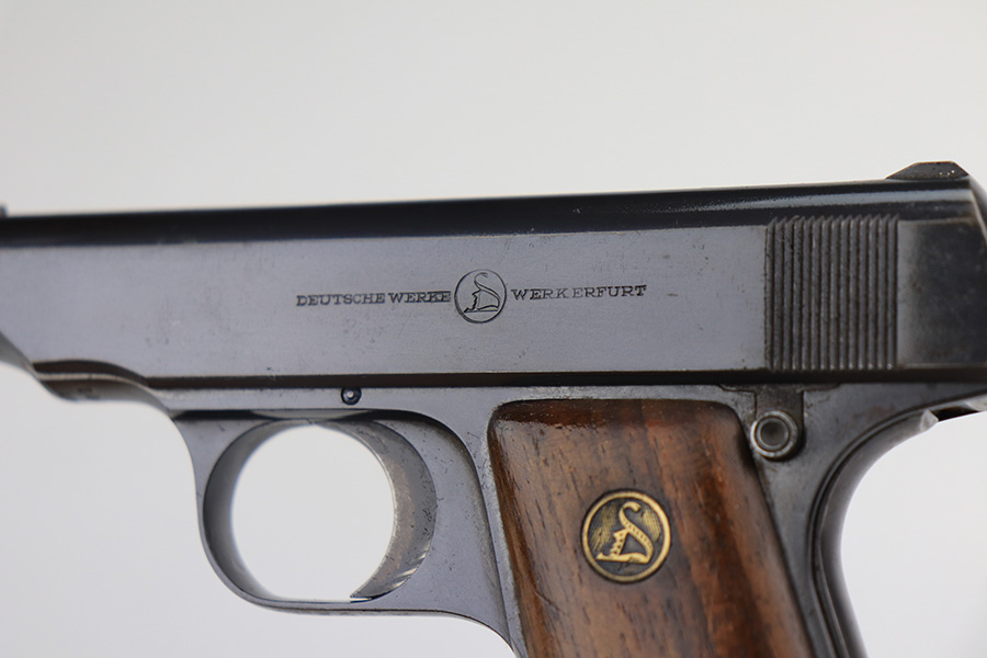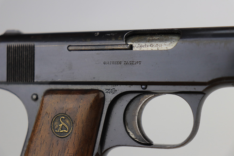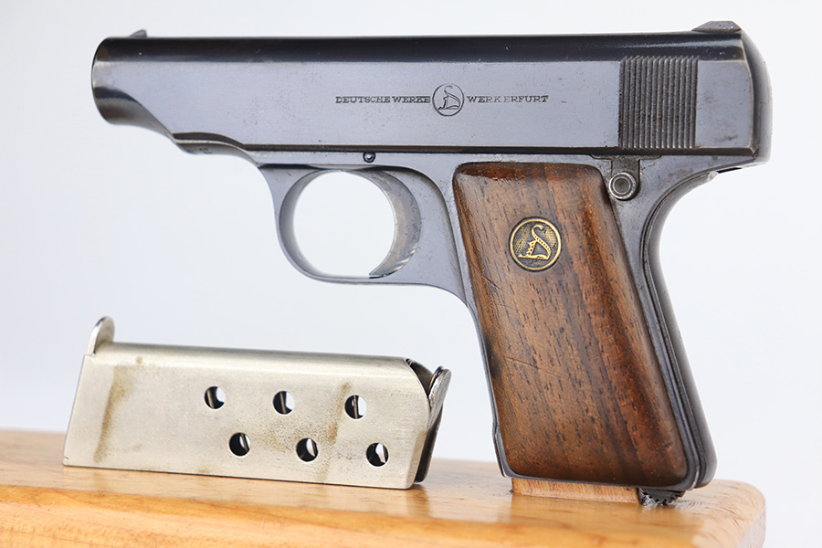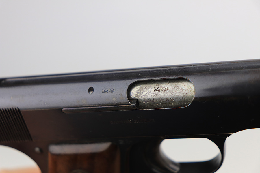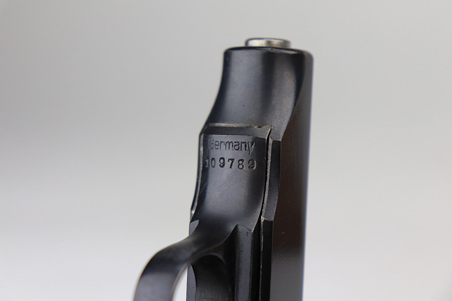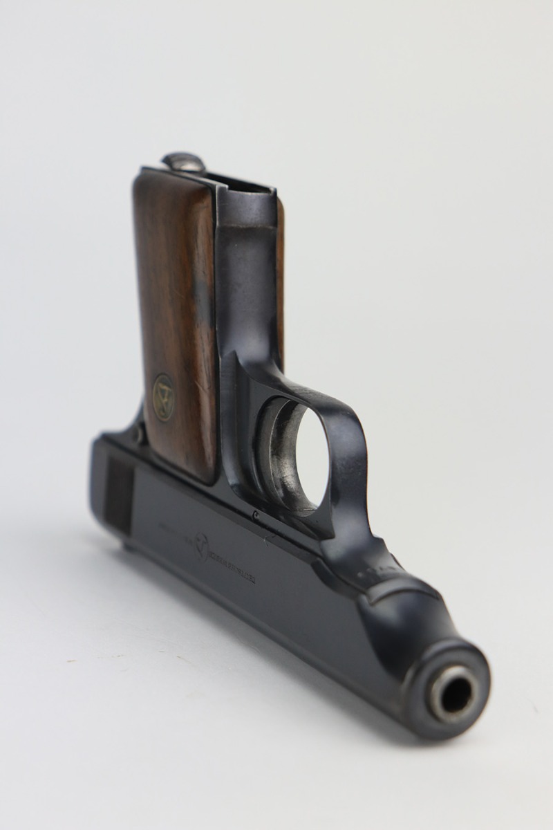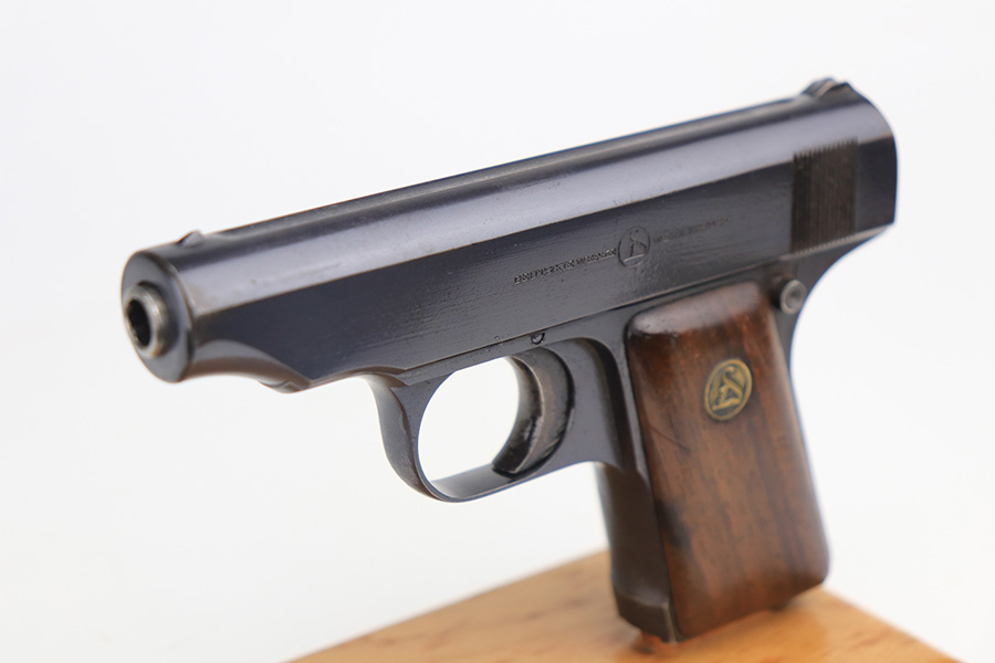 1/27/22 – This is a minty example of an Ortgies Pocket pistol, chambered in .25 ACP. The gun is all matching and has the proper “Crown N” commercial proofs. There is a “Germany” export marking on the underside of the frame, indicating this pistol was intended for sale in the international commercial market. It has retained about 98% of its original finish. There is very minor wear concentrated around the high edges of the slide, some very minor freckling on the front strap, and some brown patina on the back strap. Comes with excellent period-correct wood grips (some minor bruises here and there) and a factory-nickeled magazine. The bore is shiny with strong rifling with just one area of minor oxidation.
