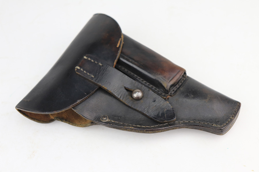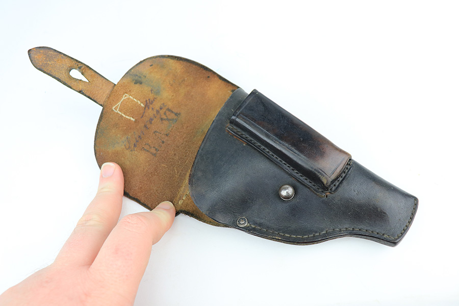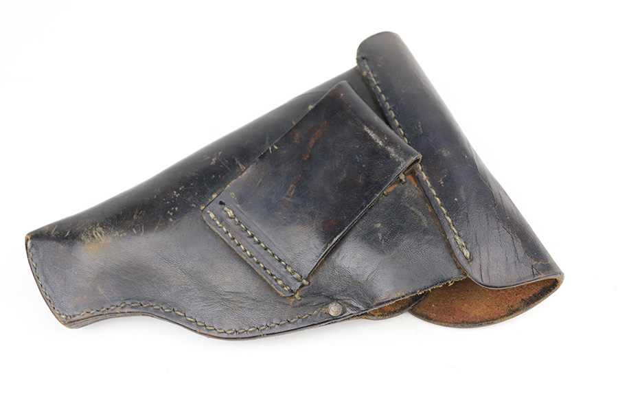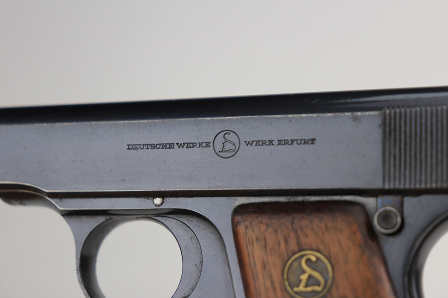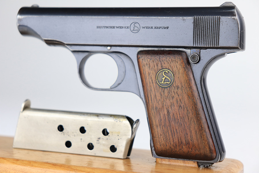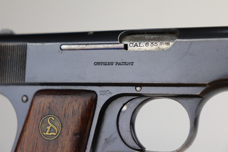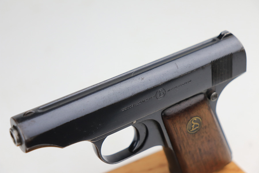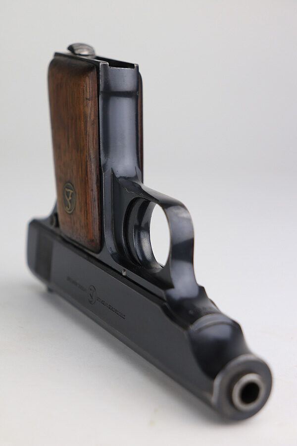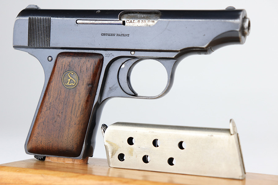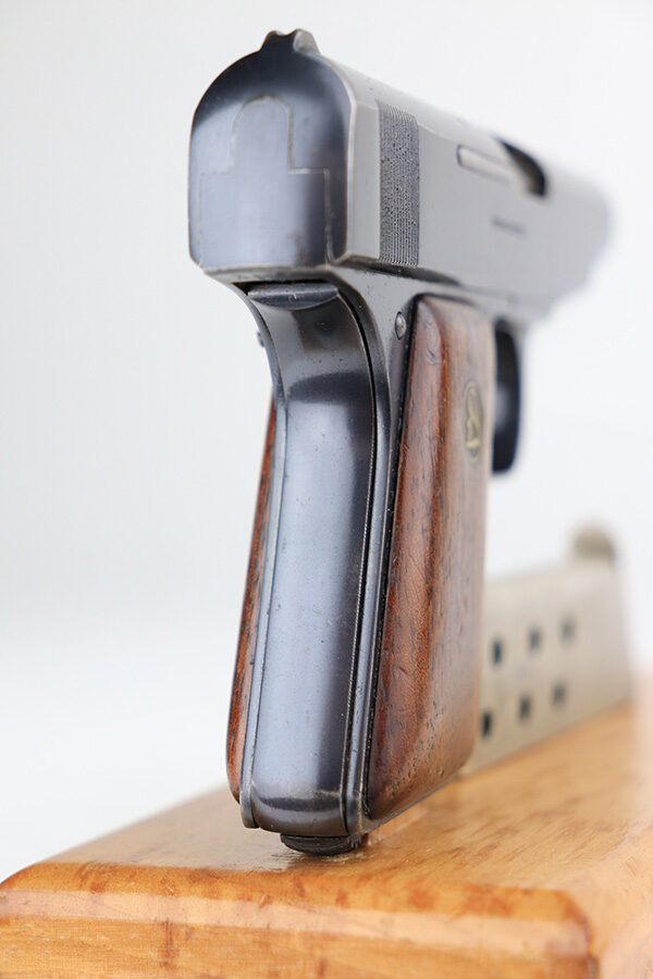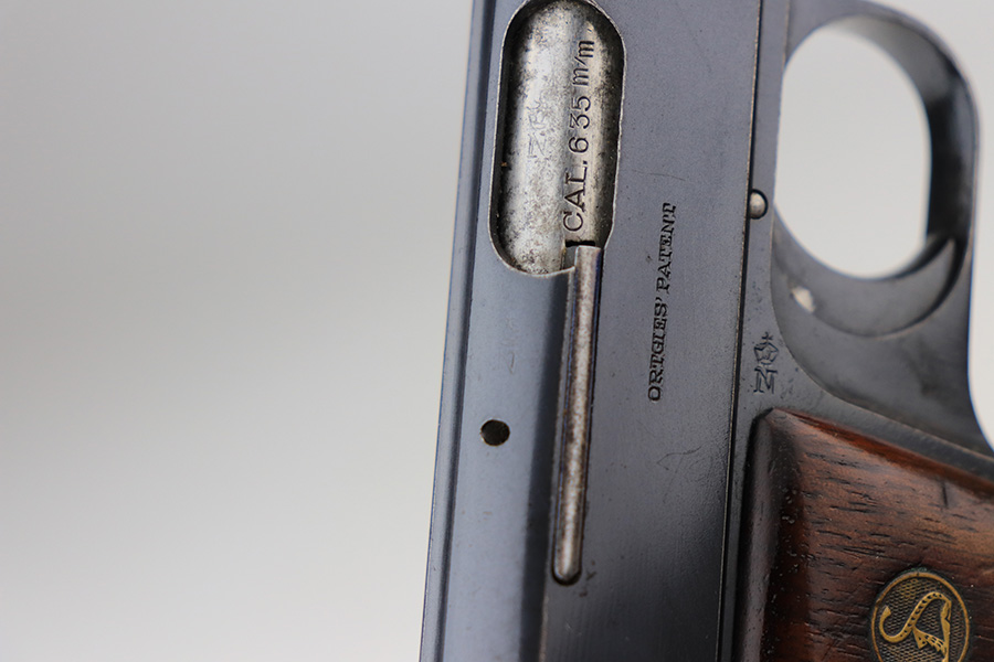 1/11/22 – This is a minty example of an Ortgies Pocket pistol chambered in .25 ACP. The gun is all matching, has the proper “Crown N” commercial proofs, and has a “Germany” export marking on the underside of the frame. The gun comes as a rig with a very nice dark brown leather holster and two period-correct nickel-plated magazines. The gun is in near-mint condition, retaining about 98% of its original finish. There are just hints of wear on the high edges and around the muzzle. A few tiny freckles on the slide and one very light surface scratch on the right side of the slide. Comes with excellent period-correct wood grips – just a few tiny bruises. The bore is very nice with good rifling.