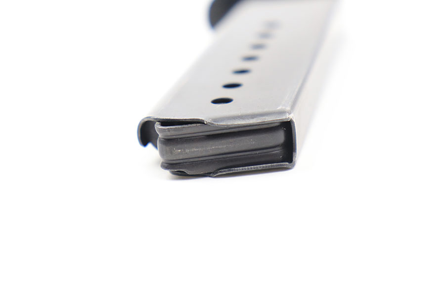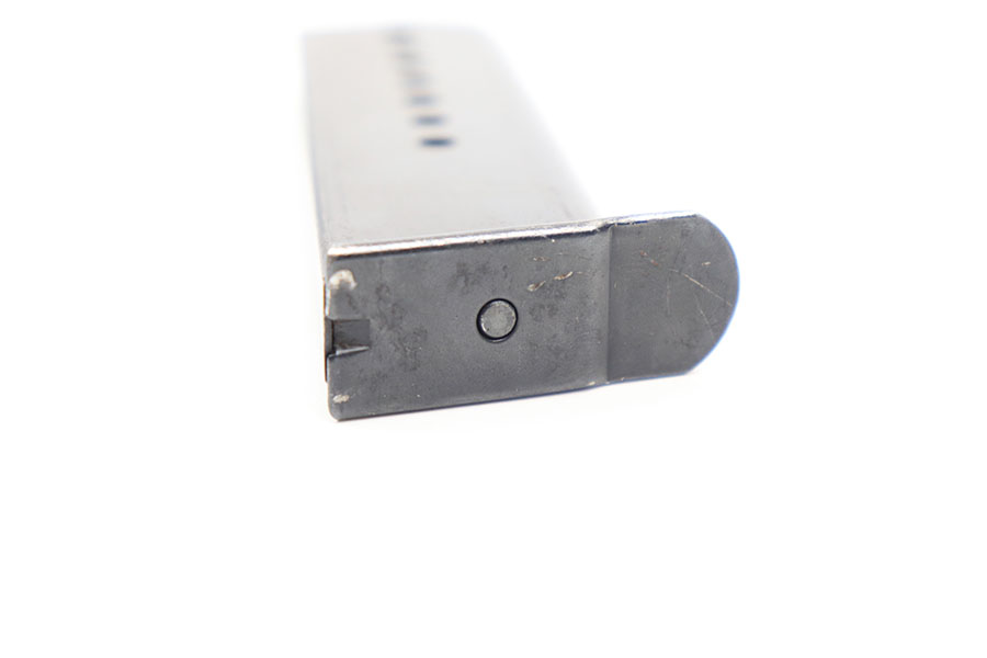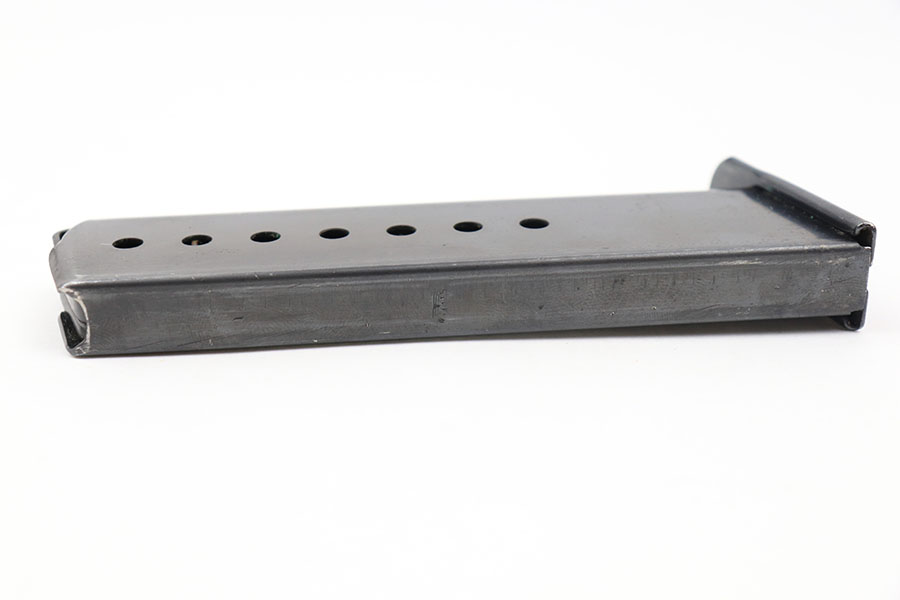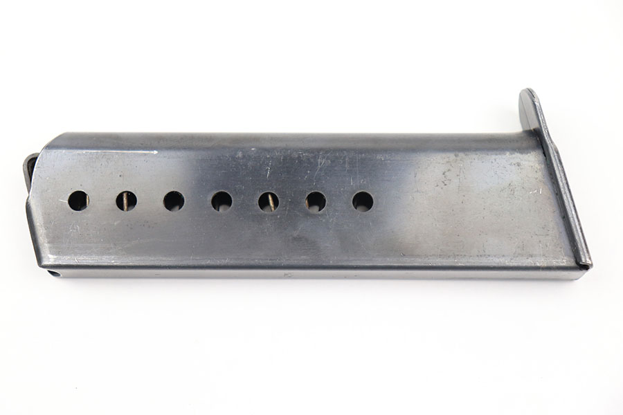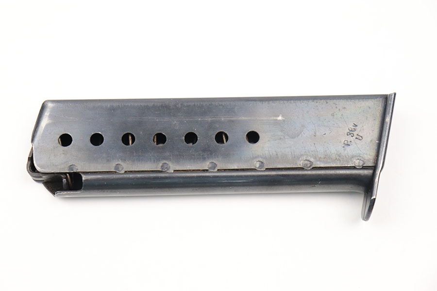 12/20/21 – This is an excellent late WW2 example of a Mauser P.38 magazine. The magazine is stamped P.38v U on one side of the tube. The spine is WaA135 proof stamped. The magazine also features a late-war ribbed follower. The blued finish is excellent throughout with no rust or pitting. Fully functional.