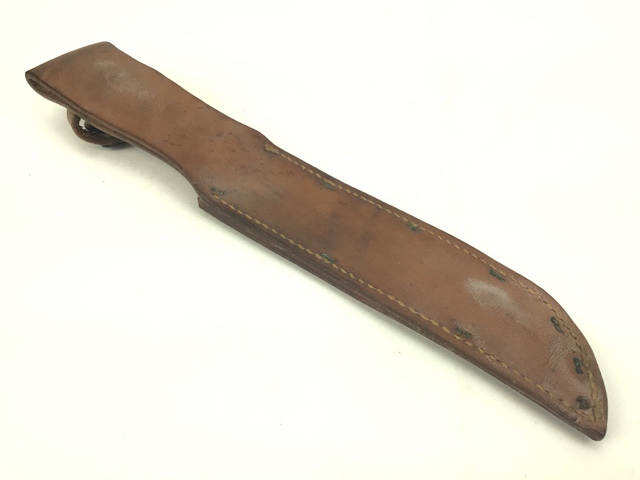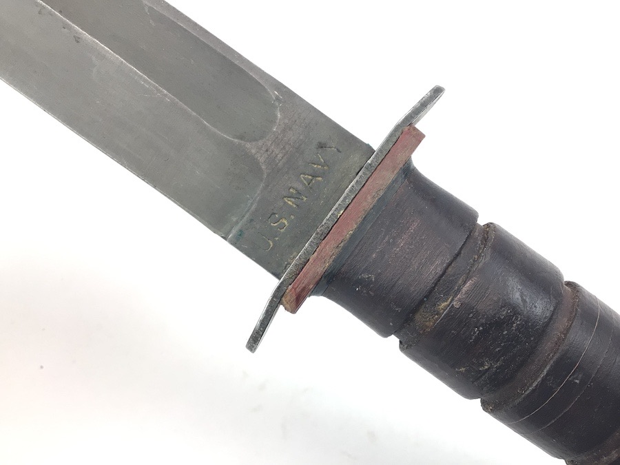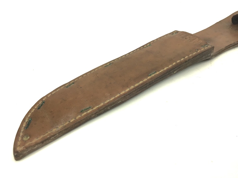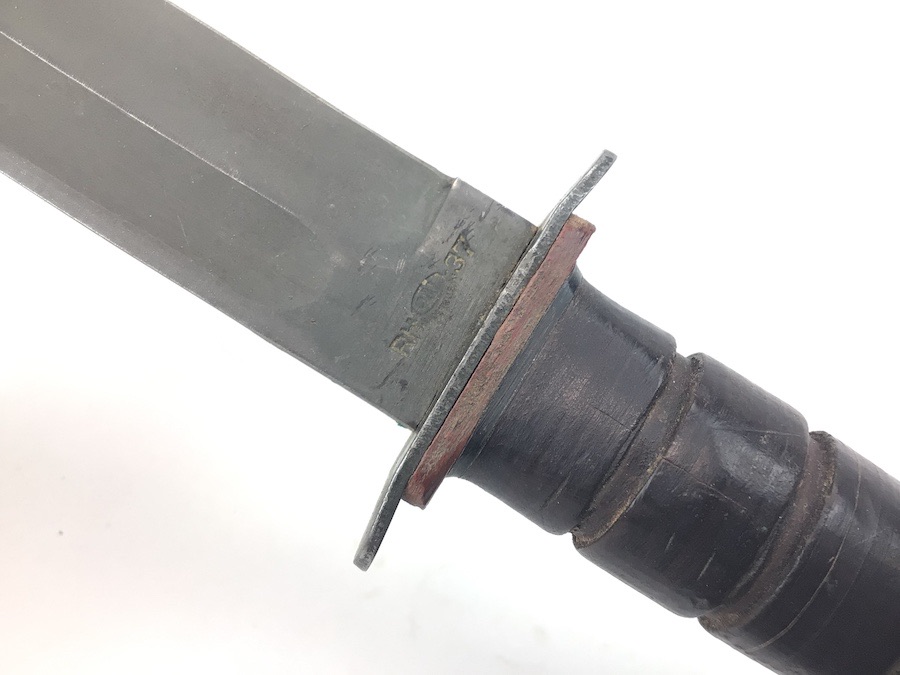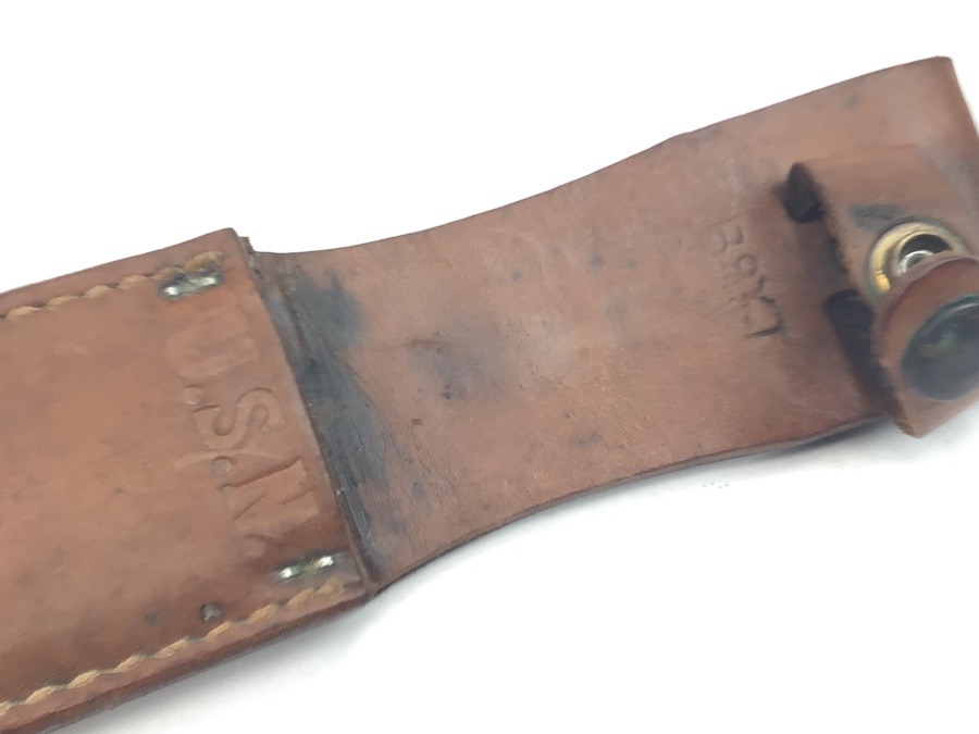 5/31/22 – This is a minty and original PAL model 37 US Navy fighting knife, complete with leather scabbard. The blade is in excellent condition with minimal signs of use and no sharpening. The right side is maker stamped and marked “RH 37”. The reverse side is “U.S. NAVY” stamped. The blade handle has iconic early red spacers. The scabbard is similarly U.S.N. stamped with “BOYT 43” maker mark.