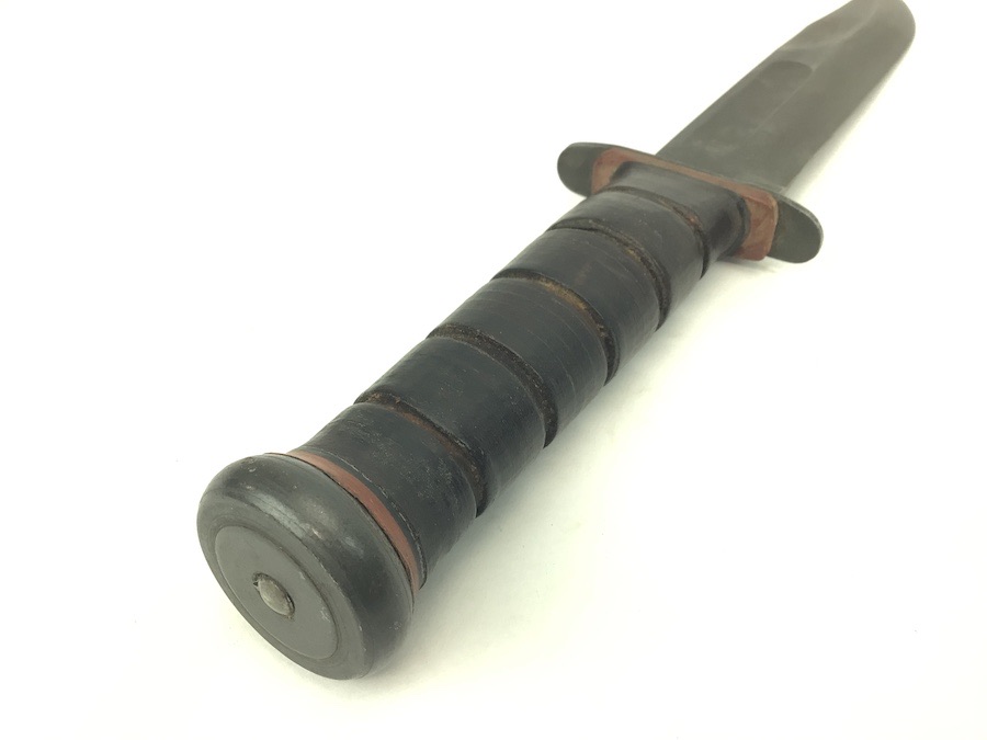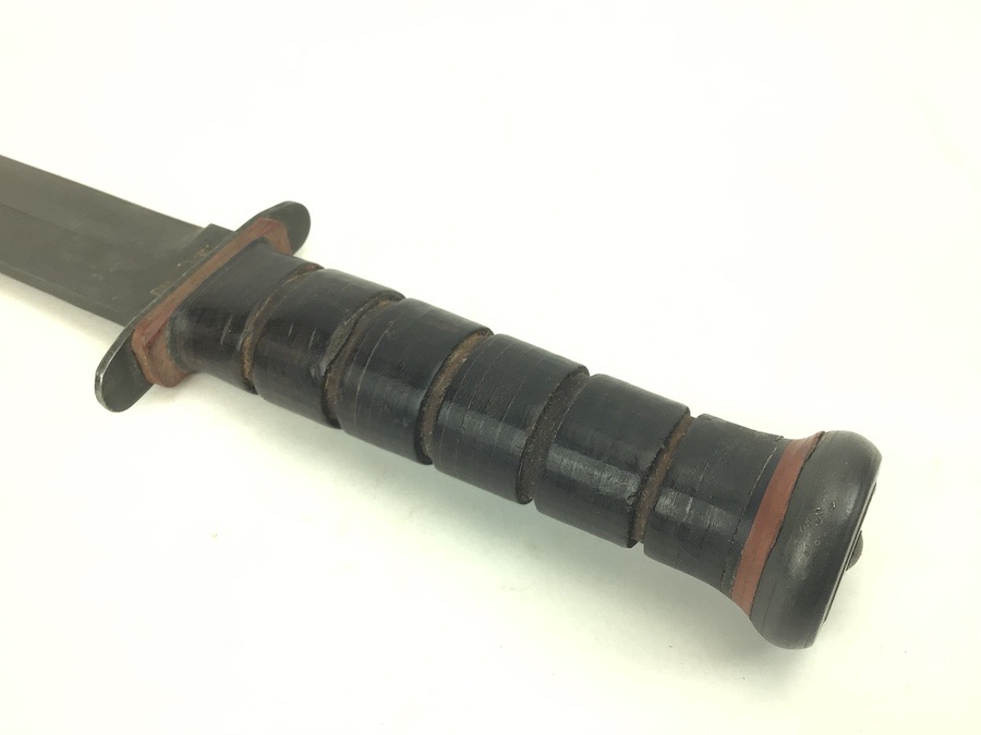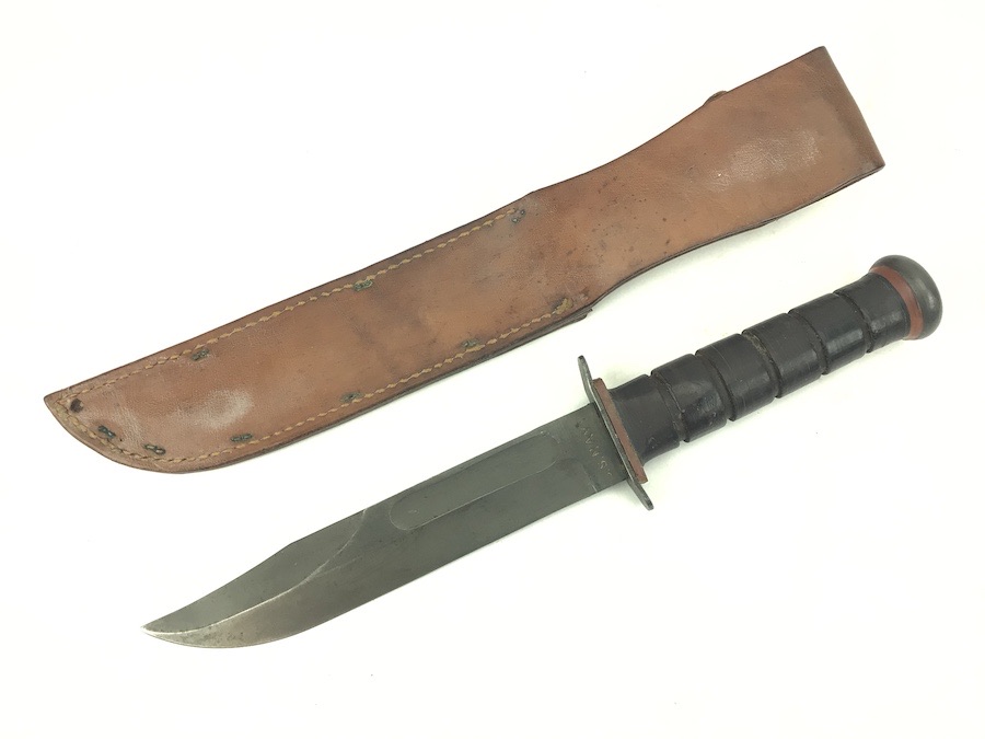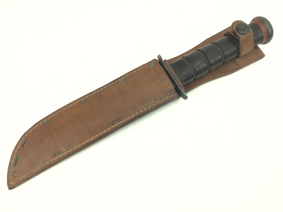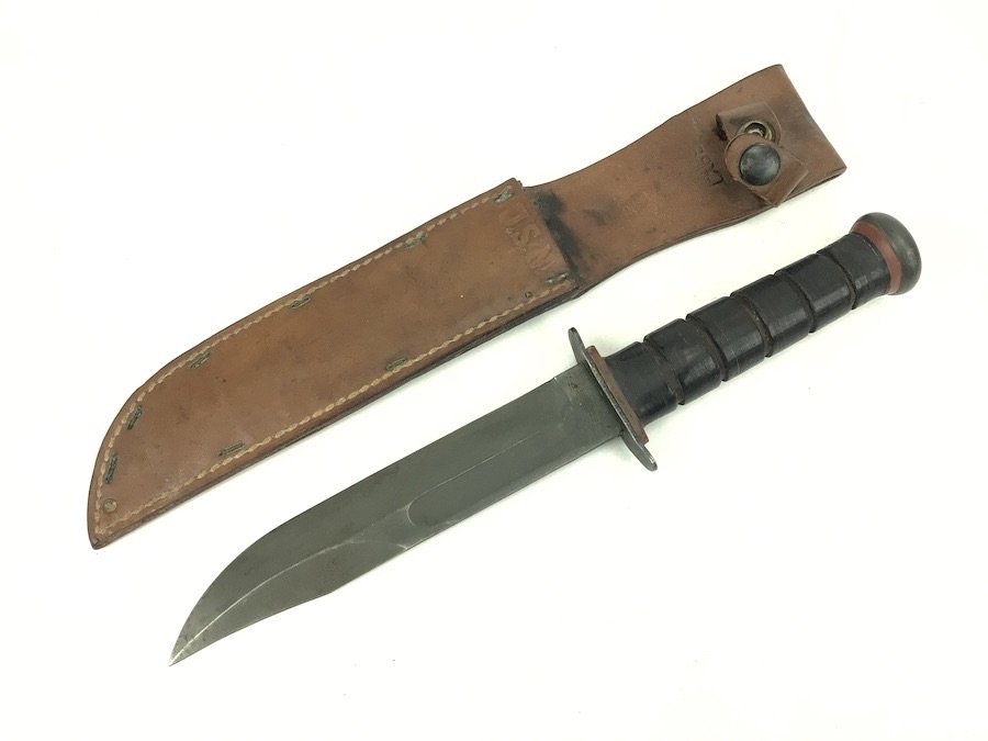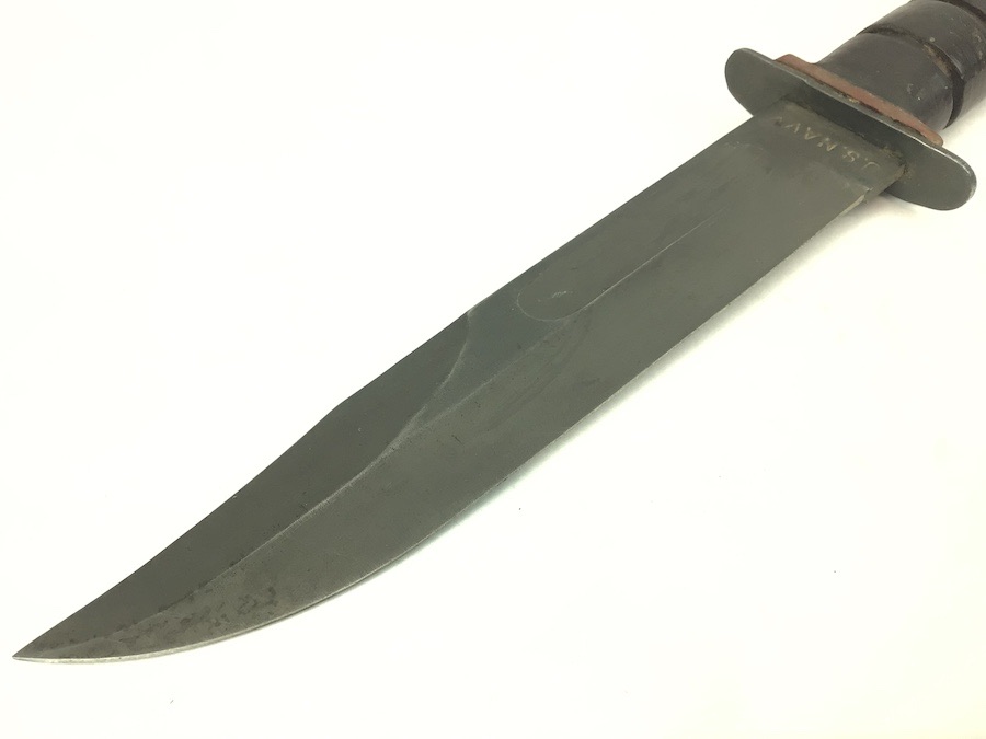 5/31/22 – This is a minty and original PAL model 37 US Navy fighting knife, complete with leather scabbard. The blade is in excellent condition with minimal signs of use and no sharpening. The right side is maker stamped and marked “RH 37”. The reverse side is “U.S. NAVY” stamped. The blade handle has iconic early red spacers. The scabbard is similarly U.S.N. stamped with “BOYT 43” maker mark.