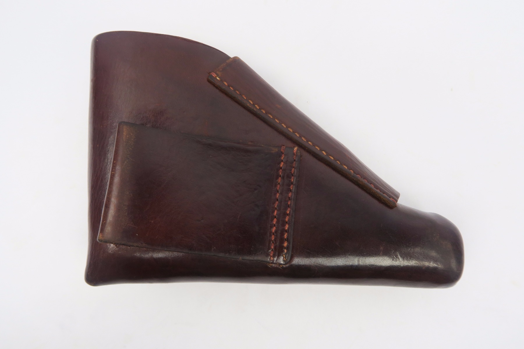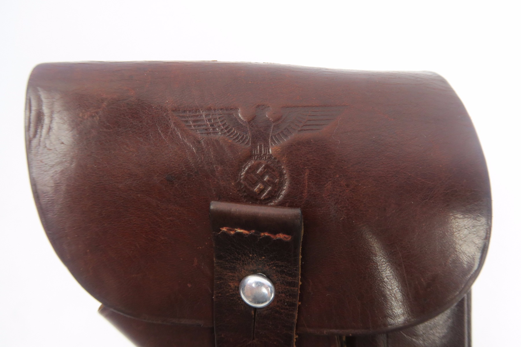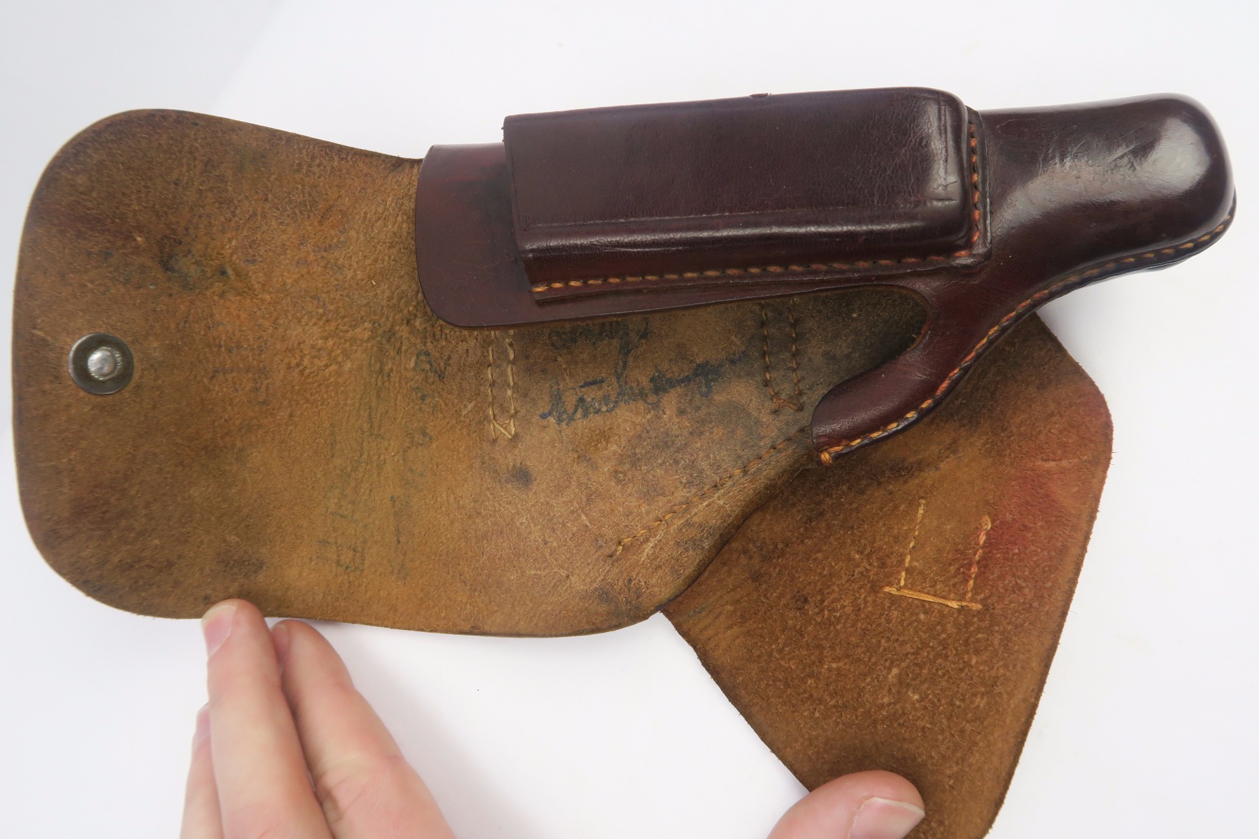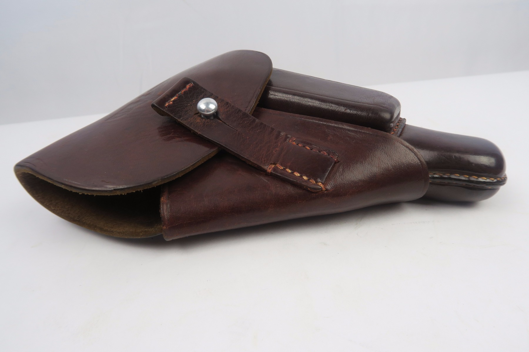 11/30/17 – This is an excellent, near mint reddish leather Party Leader PPK holster. Party leader holsters in this condition have become increasingly hard to come by. This one is coming straight from our private collection, as we haven’t offered one this nice in years. The front of the holster has the party eagle stamped into the leather. This stamp is strong and fully visible. There is also an AKAH DRGM stamp under the closure strap. The reddish brown leather is excellent with some normal wear and aging signs. The worst of the wear is on the top pivot point of the holster. This is where we see surface wrinkling and very minor beginning surface cracks. The rest of the leather is excellent. Stitching all original and excellent as well. Guaranteed original.