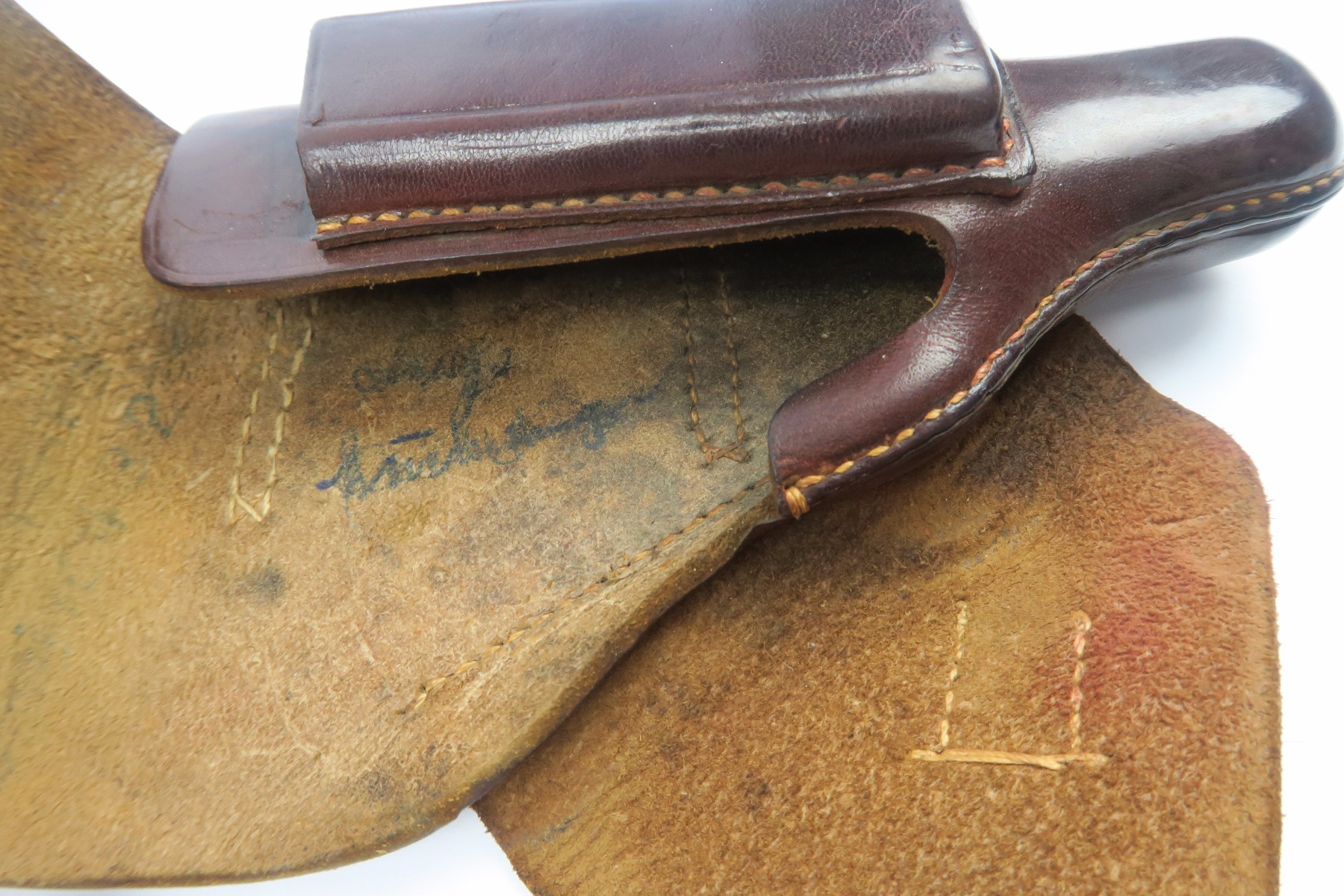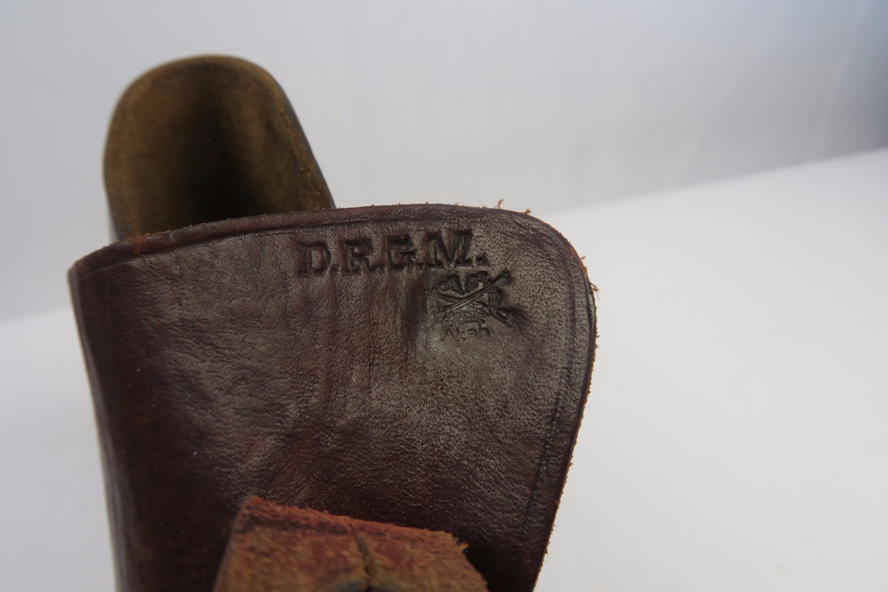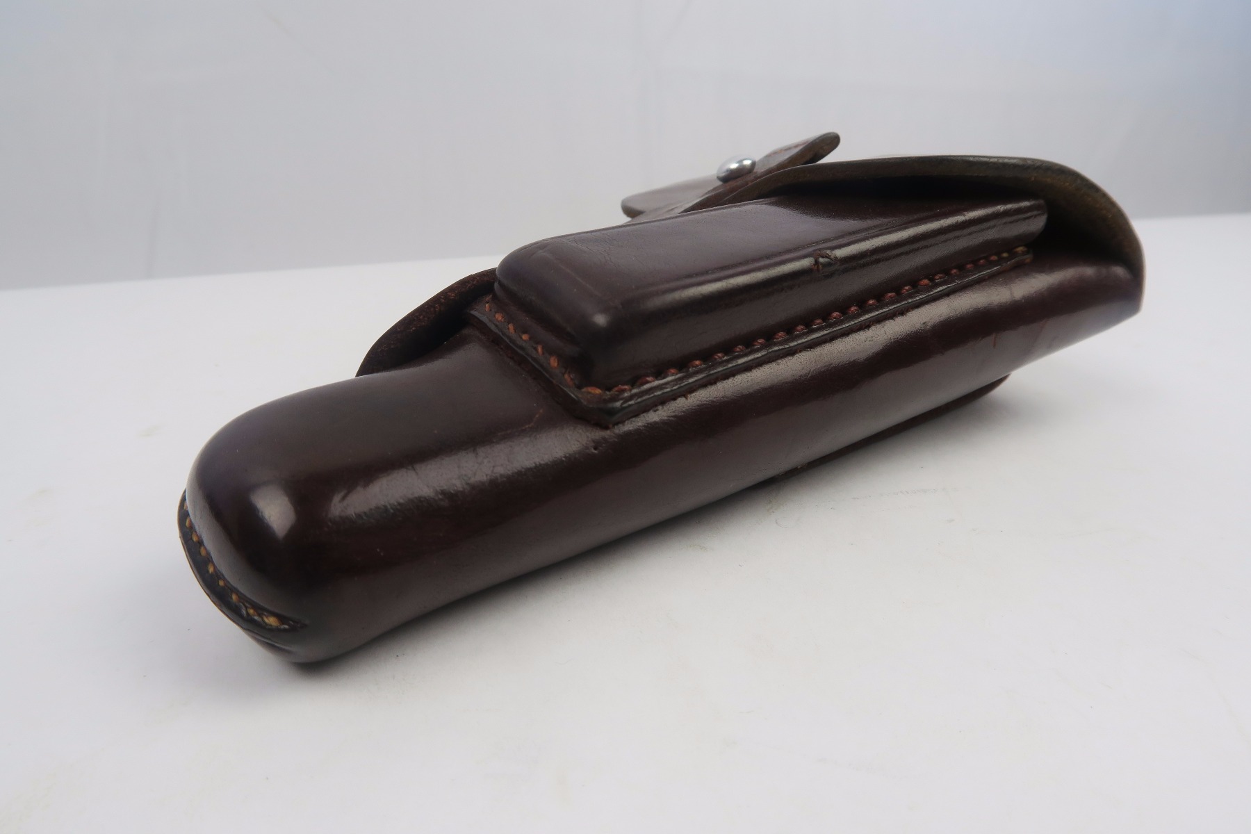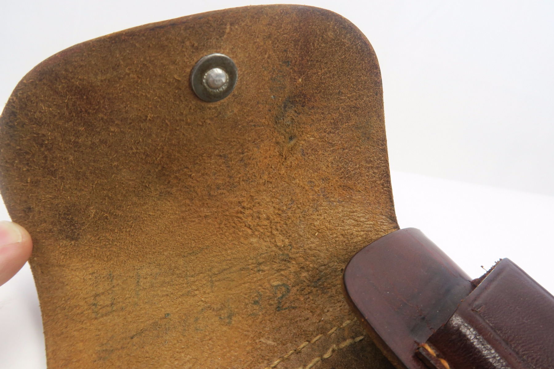 11/30/17 – This is an excellent, near mint reddish leather Party Leader PPK holster. Party leader holsters in this condition have become increasingly hard to come by. This one is coming straight from our private collection, as we haven’t offered one this nice in years. The front of the holster has the party eagle stamped into the leather. This stamp is strong and fully visible. There is also an AKAH DRGM stamp under the closure strap. The reddish brown leather is excellent with some normal wear and aging signs. The worst of the wear is on the top pivot point of the holster. This is where we see surface wrinkling and very minor beginning surface cracks. The rest of the leather is excellent. Stitching all original and excellent as well. Guaranteed original.