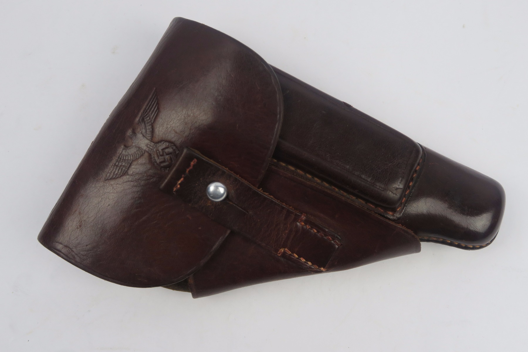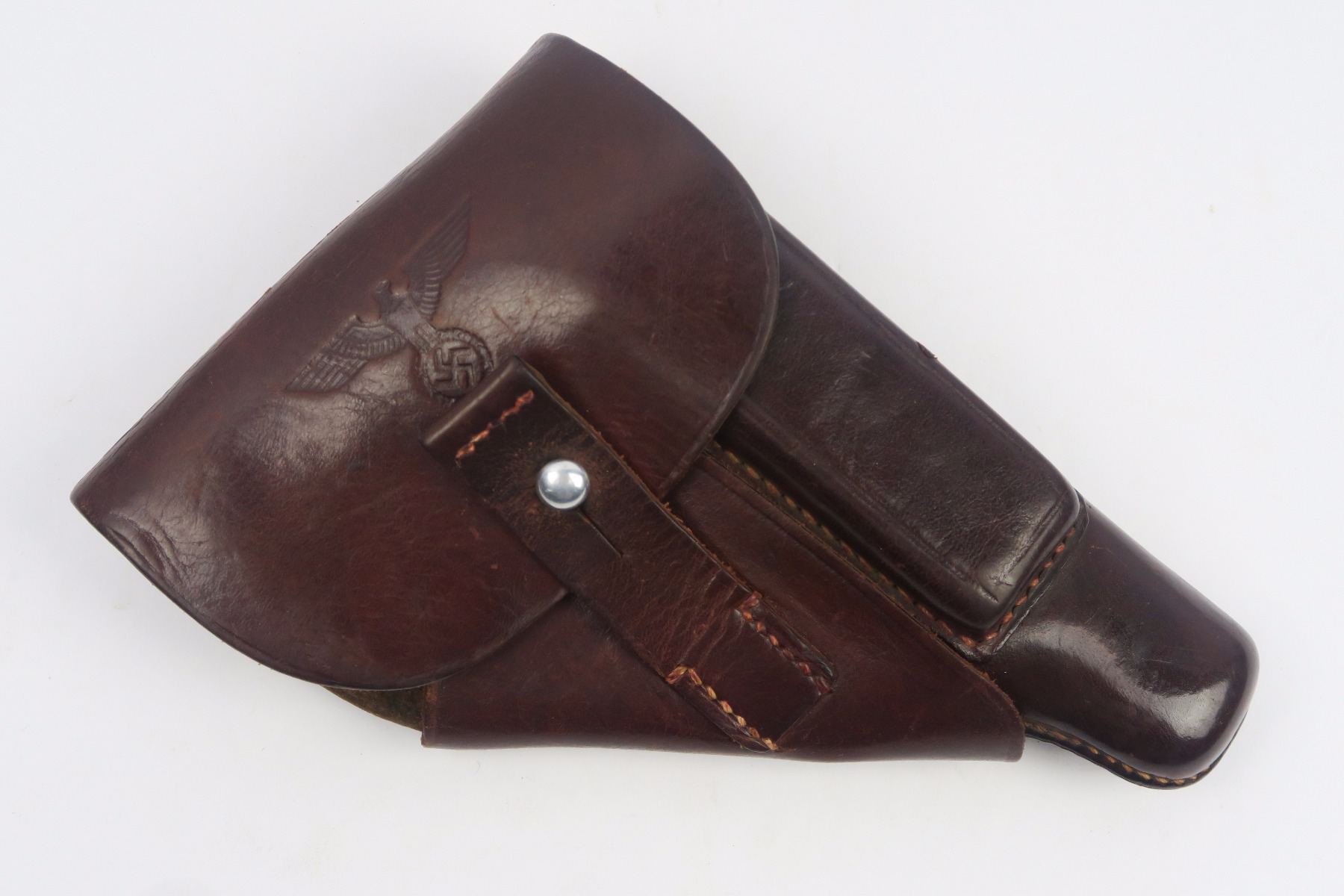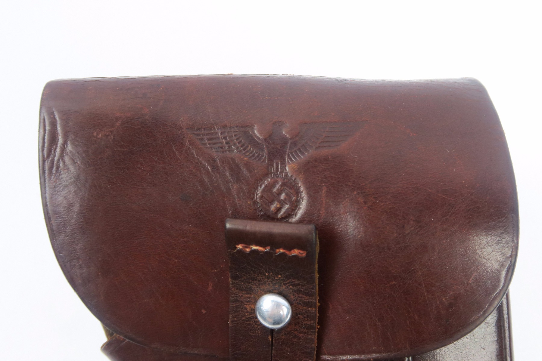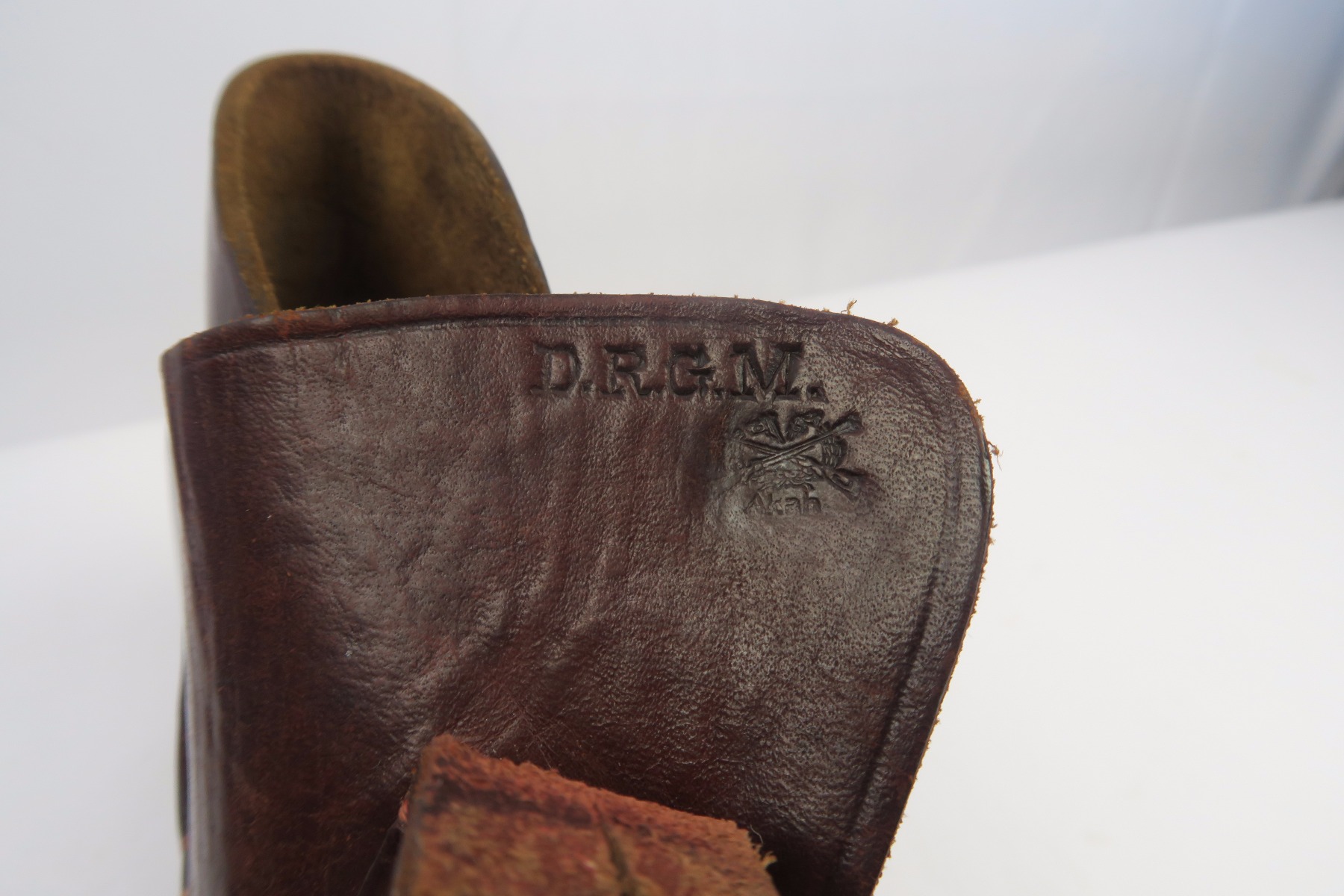 11/30/17 – This is an excellent, near mint reddish leather Party Leader PPK holster. Party leader holsters in this condition have become increasingly hard to come by. This one is coming straight from our private collection, as we haven’t offered one this nice in years. The front of the holster has the party eagle stamped into the leather. This stamp is strong and fully visible. There is also an AKAH DRGM stamp under the closure strap. The reddish brown leather is excellent with some normal wear and aging signs. The worst of the wear is on the top pivot point of the holster. This is where we see surface wrinkling and very minor beginning surface cracks. The rest of the leather is excellent. Stitching all original and excellent as well. Guaranteed original.