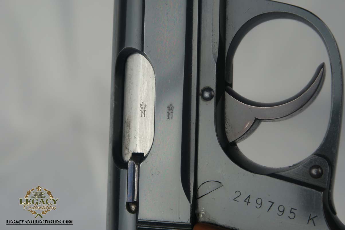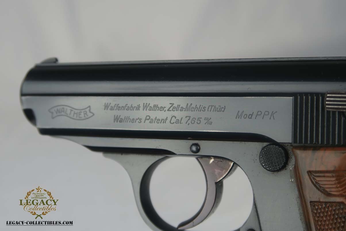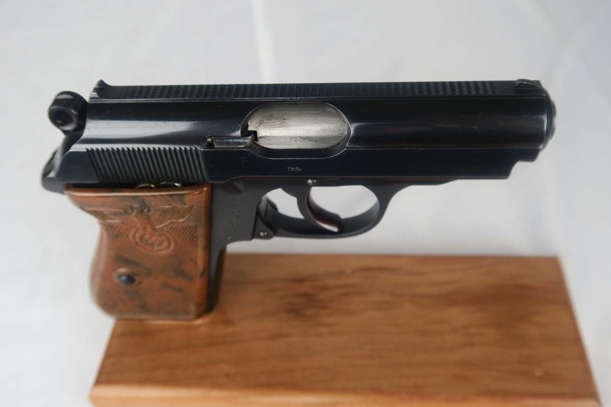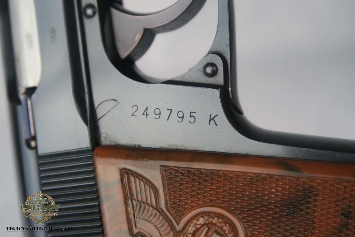 8/31/17 – This is a near-mint and rare Walther PPK with Party Leader grip.  It is guaranteed original and correct with 99% high-polish blue remaining.  The grip is in similarly excellent condition with no flaws to note.  The serial dates this pistol to late 1939 or early 1940.  This pistol was sold to us with the included Party Leader ID card in the photos.  The safety and trigger still show a decent amount of fire blue.  Crown/N proofs on slide and frame.  Excellent finger extension magazine.  Mint bore.