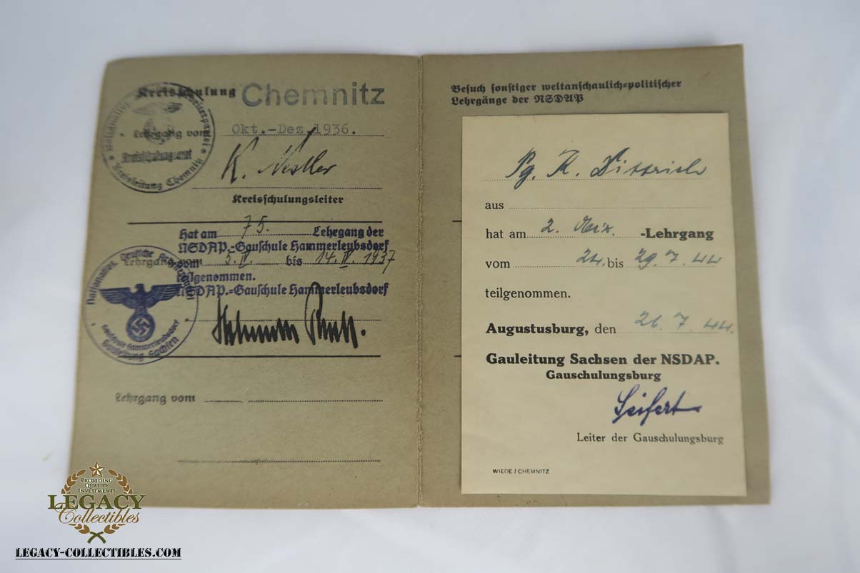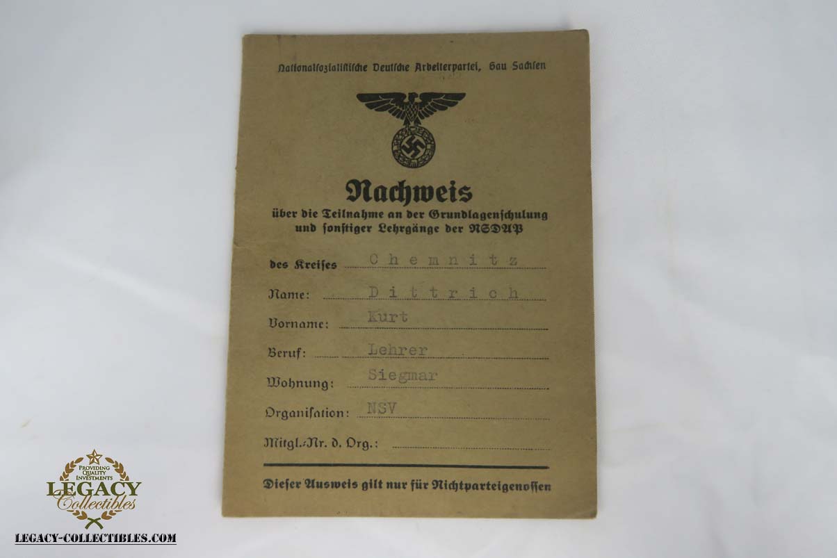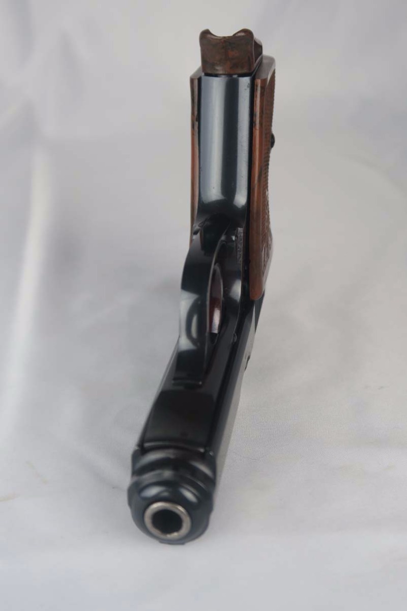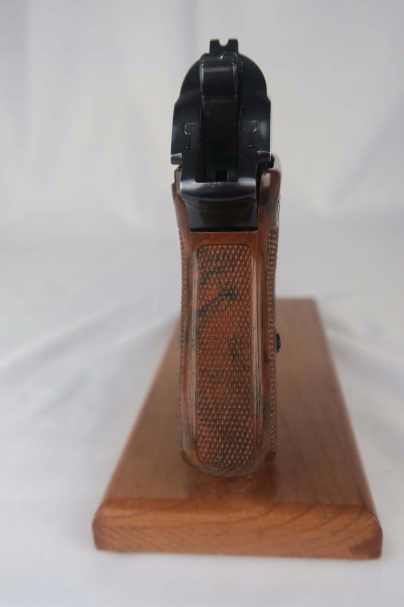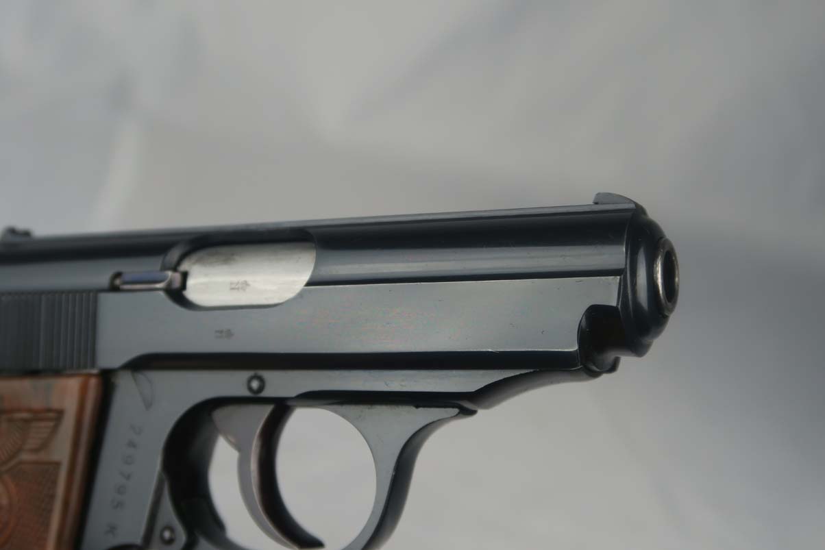 8/31/17 – This is a near-mint and rare Walther PPK with Party Leader grip.  It is guaranteed original and correct with 99% high-polish blue remaining.  The grip is in similarly excellent condition with no flaws to note.  The serial dates this pistol to late 1939 or early 1940.  This pistol was sold to us with the included Party Leader ID card in the photos.  The safety and trigger still show a decent amount of fire blue.  Crown/N proofs on slide and frame.  Excellent finger extension magazine.  Mint bore.
