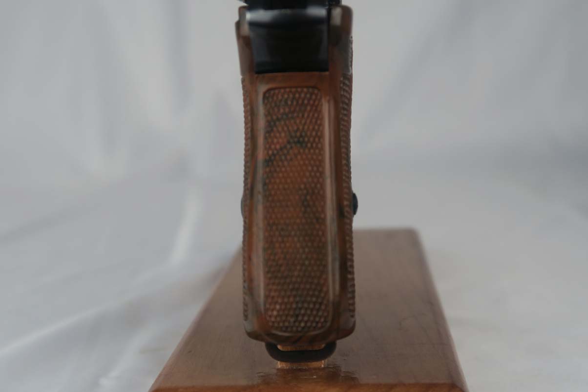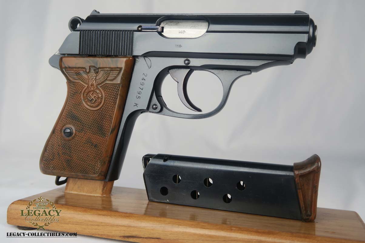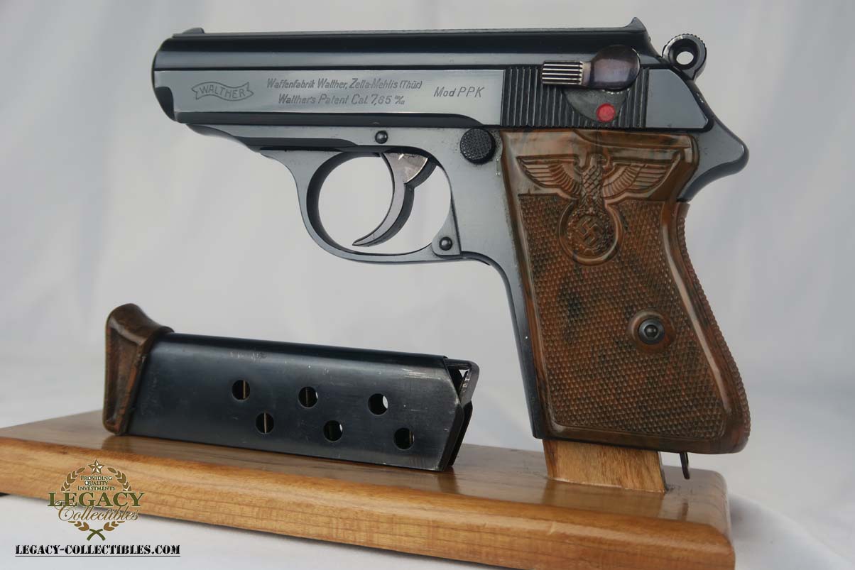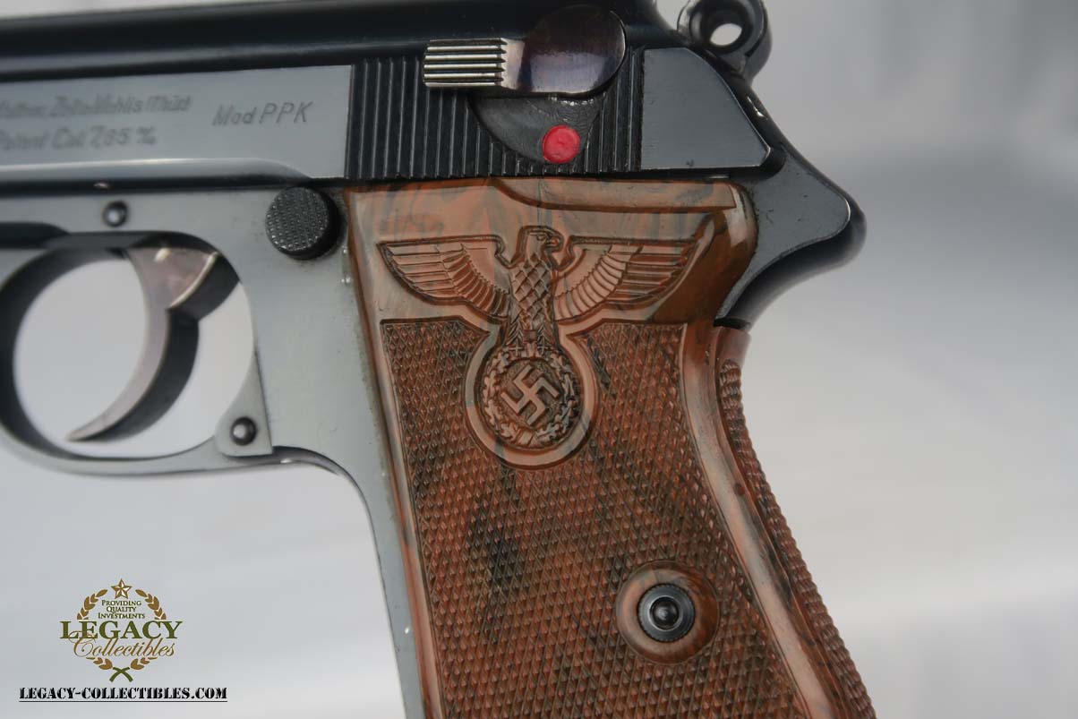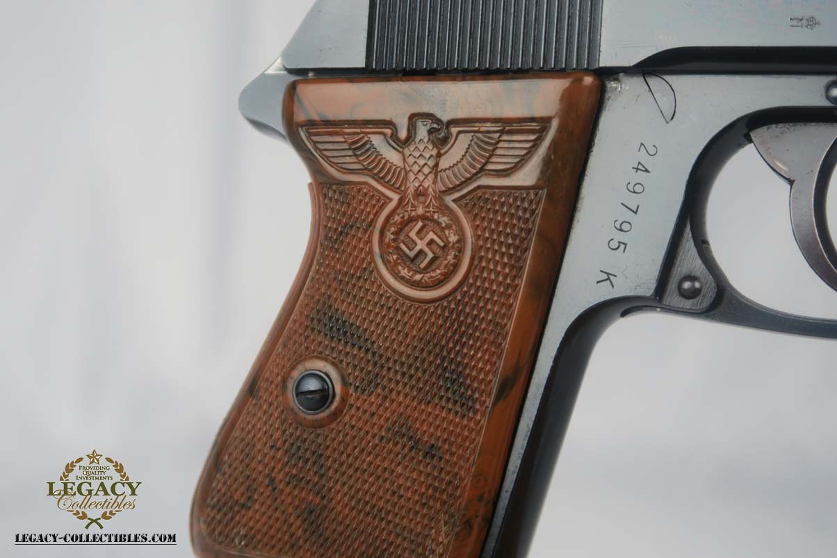 The Walther PPK with Party Leader Grips was the “Honor Weapon of the Political Leaders”. The Hoheitsabzeichen or High Insignia is the Eagle over Swastika found on either side of the grips where the Walther banner is normally located. The person entitled to wear the honor weapons that were awarded them by the Fuhrer were the Political Leaders of the national, regional and district territories, as well as leaders of local and support units. The persons who wore the honor weapon had their authorizations listed in the district personnel offices, and had to have in their possession a weapons permit issued by the police, which was obtained through official channels. These rare pistols were estimated to number around 3,500, and are widely faked, but this one is guaranteed original.