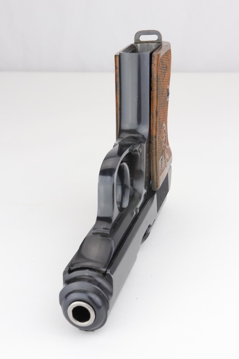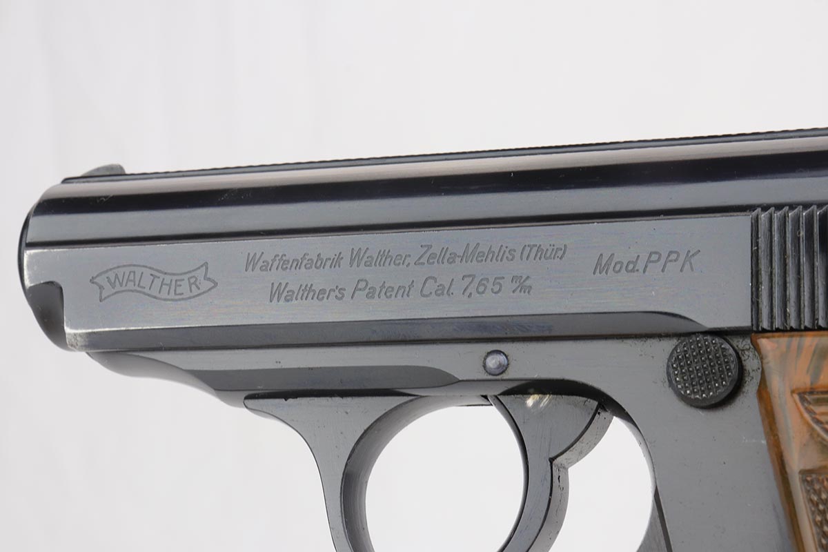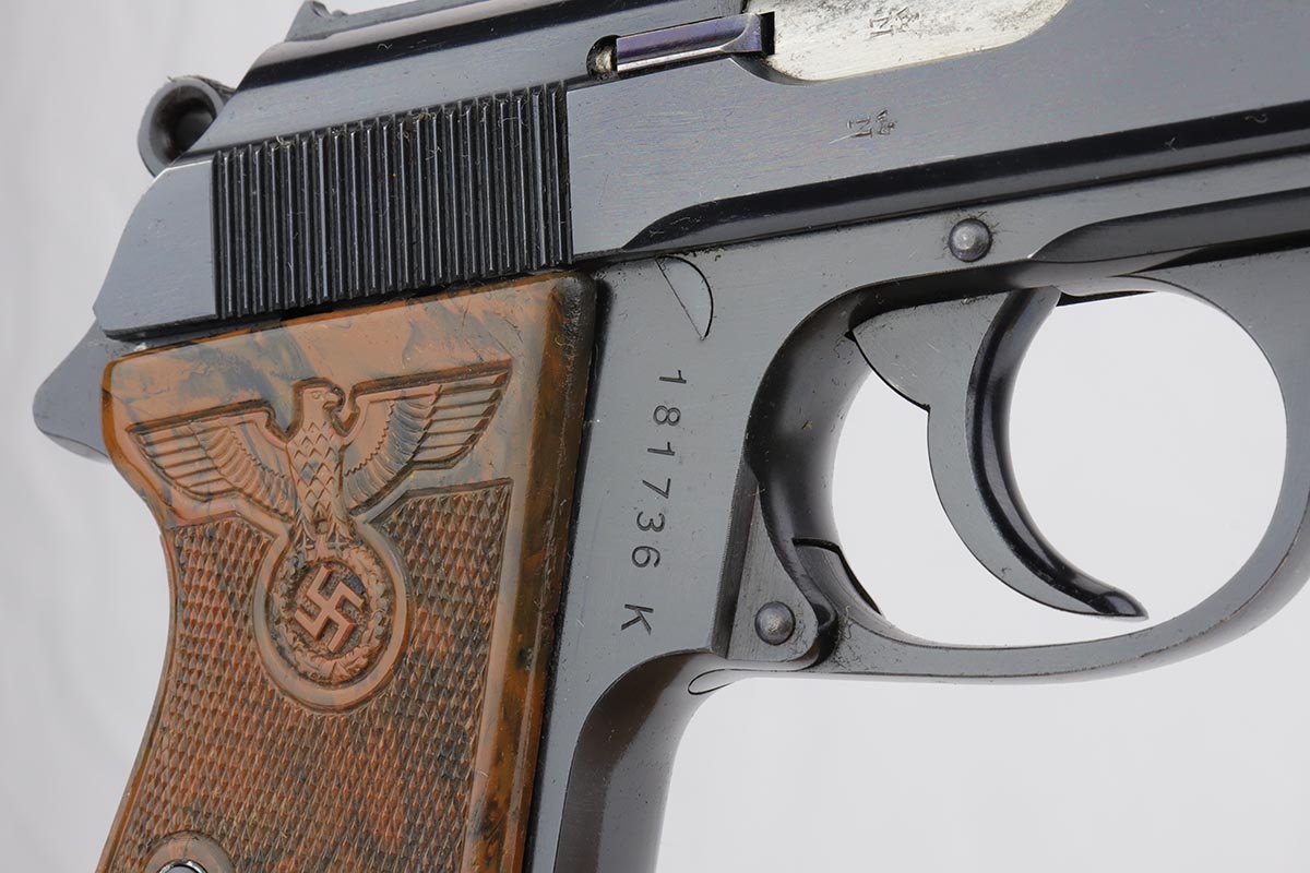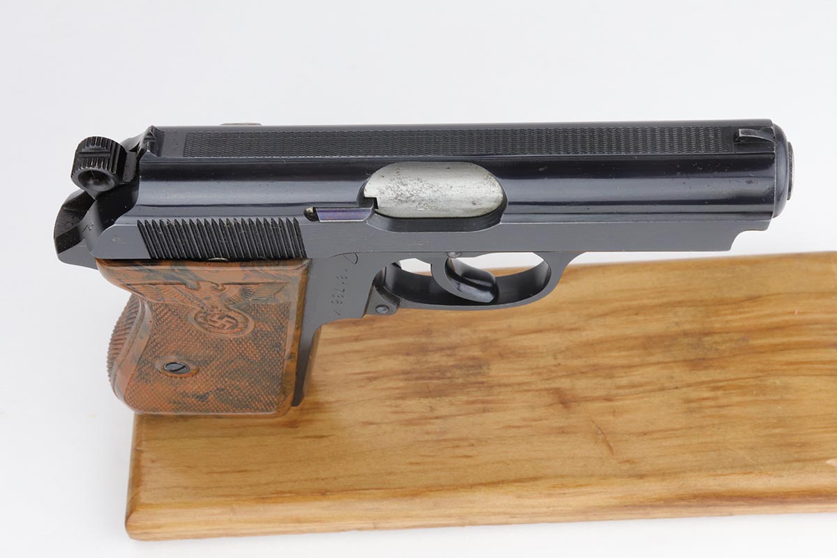9/17/19 – This is an exquisite and rare Party Leader Walther PPK. The gun is all original finish and near-mint, with just a minor hint of holster wear on front edges of the slide. The serial dates it to 1939 and is in the correct range for the issuance of the Party Leader “Honor” Grip. The grip is excellent as well with no visible cracks. Nearly all PPK grips from that era will have tiny stress fractures and are to be expected if the grip is real, but this one has avoided those cracks and is guaranteed to be real.