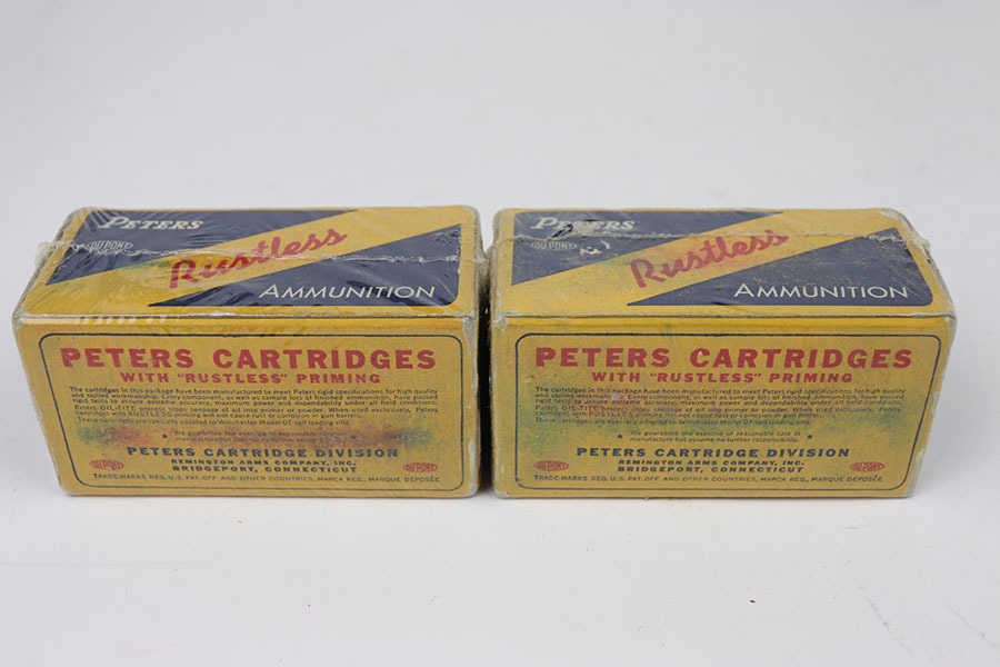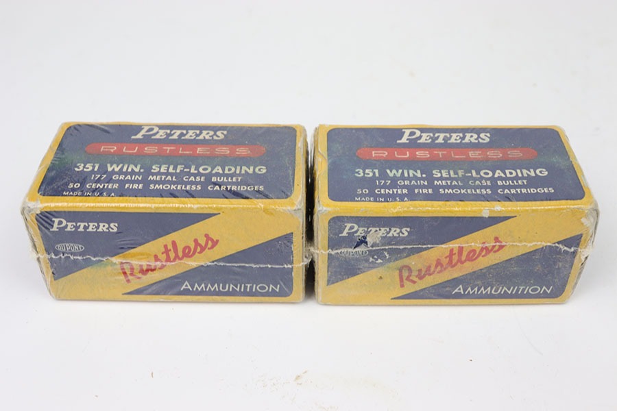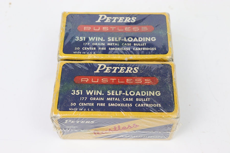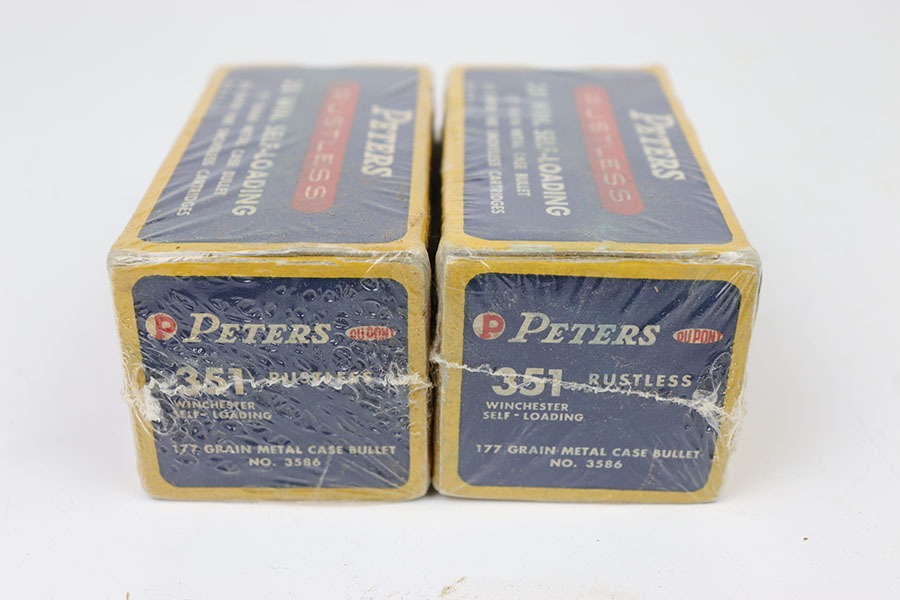 11/15/24 – These are two scarce boxes of Peters 351 Winchester. Two boxes of 50 center fire smokeless cartridges. The boxes are in minty condition as they have been stored in shrink wrap. Likely produced somewhere between 1934 and 1944 due to Peters being bought out by Remington in 1934, which is marked on the box.