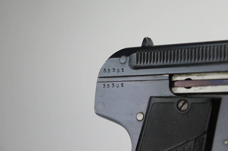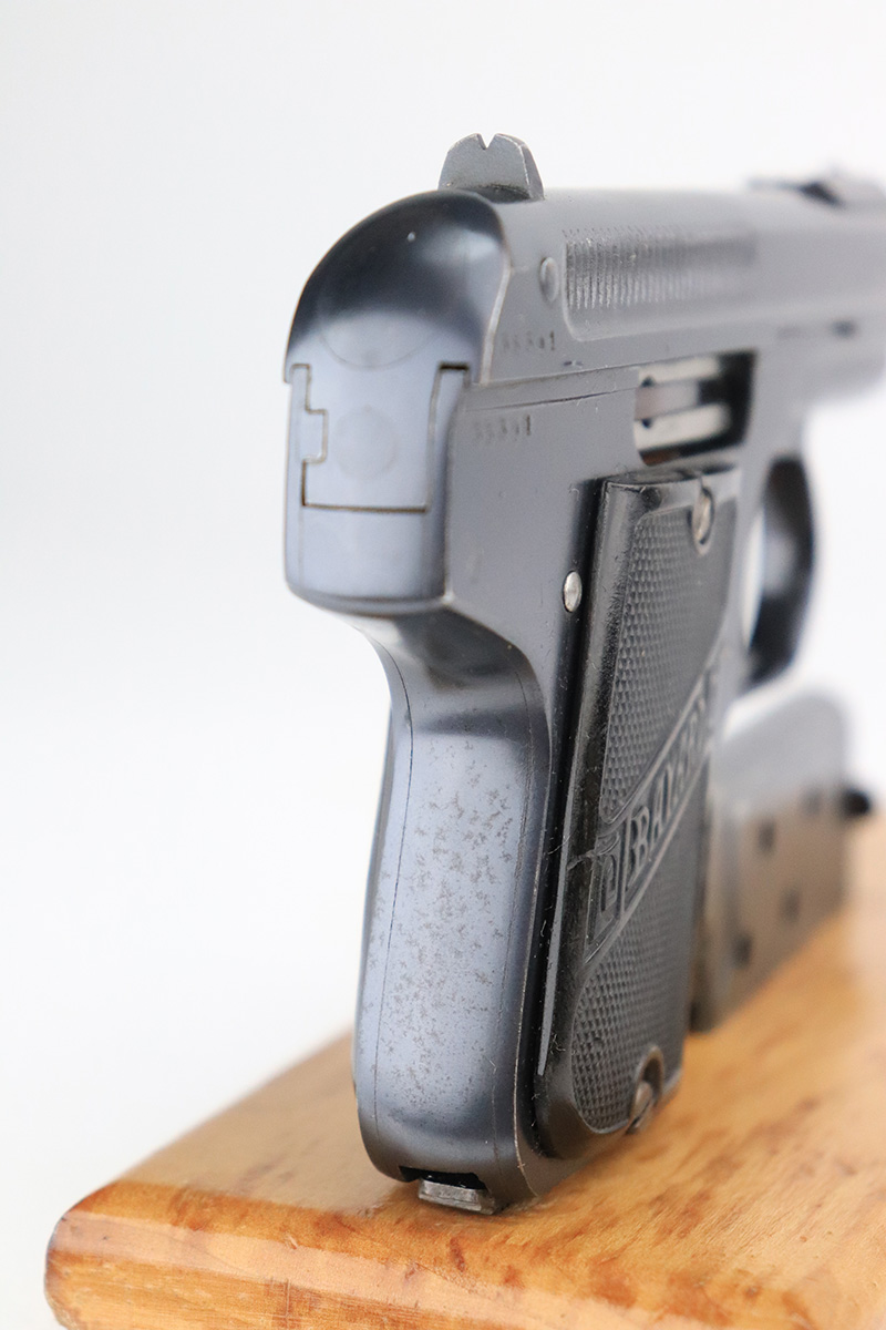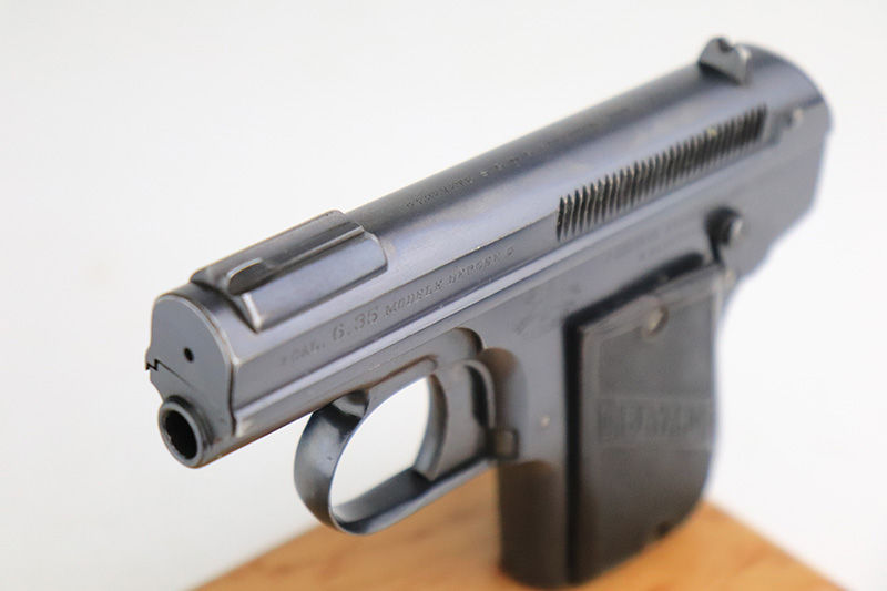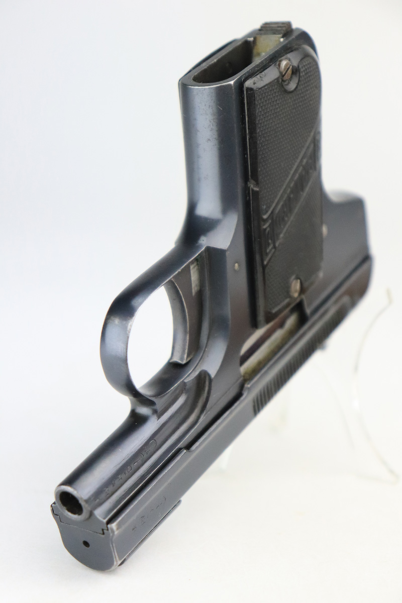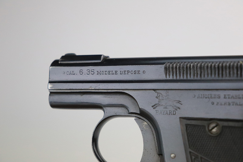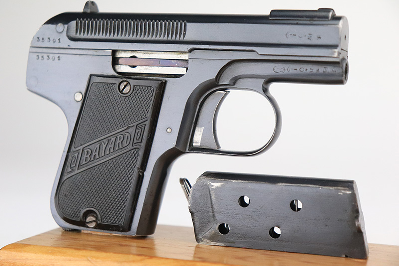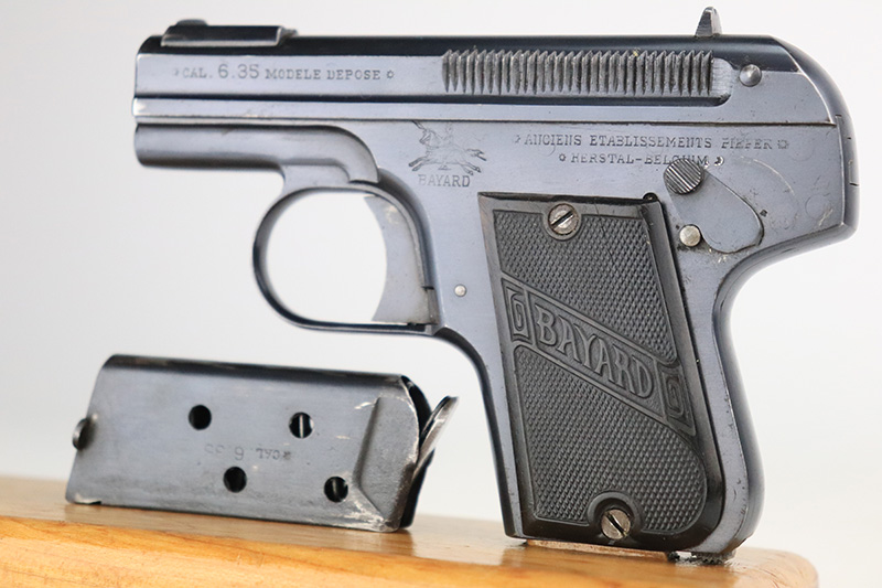 9/21/22 – This is a very nice example of a Belgian Pieper “Bayard” Model 1908 Pocket Pistol. “Model 1908” has become a standard designation for this gun, after the date the U.S. patent was issued, but it was not used by the Pieper company, which always referred to the gun as the Bayard Self-Loading Pistol, or simply as the Bayard Pistol. After 1923, when it was superceded by a newer model, it was referred to as the “Old Model Bayard.” The Bayard pocket models were made by Anciens Etablissements Pieper (A.E.P.) and were produced in three calibers: 6 .35, 7.65, and 9 mm. The first to be produced was the so called Model of 1908 which appeared in late 1909 or early 1910. The first advertisement of this pistol appeared in the April 1, 1910, issue of Schuss and Waffe. The design was based on patents taken out by B. Clarus from 1905 to 1907 and purchased by A.E.P. in 1907 or early in 1908. This particular gun is chambered in 6.35mm. This one is all matching and has retained about 98% of its original finish. There is just very minor muzzle wear and some freckling on both grip straps. Comes with nice period-correct grips (one hairline crack on the left side) and one proper magazine. Excellent bore with great rifling.