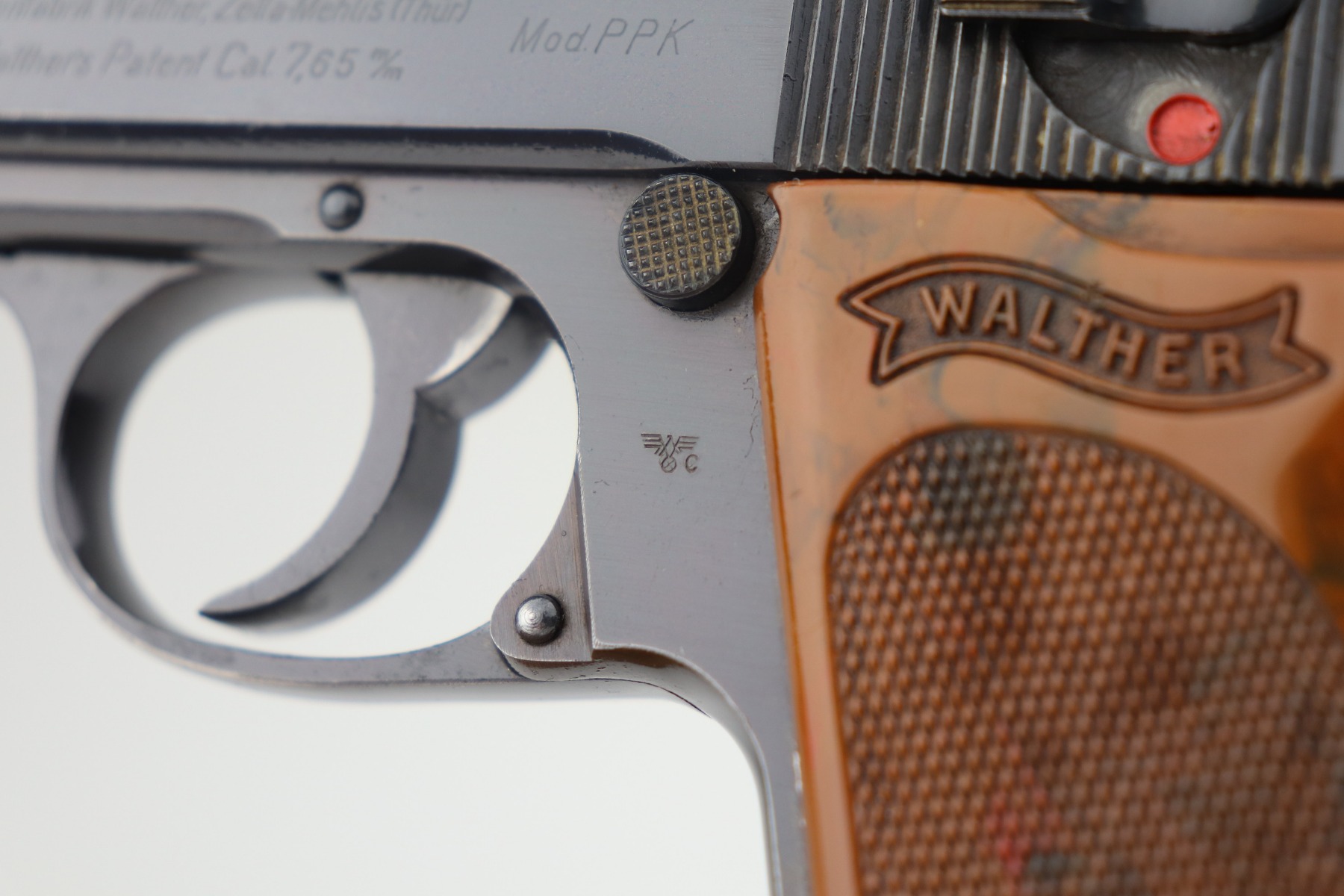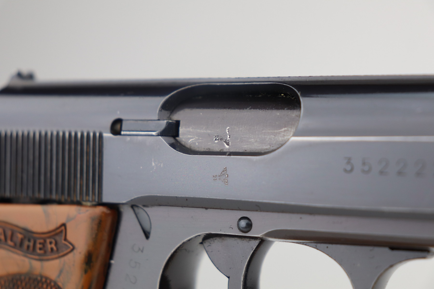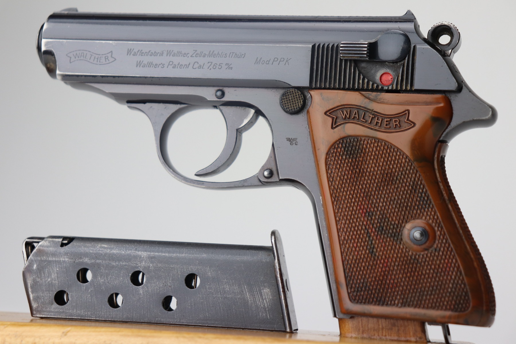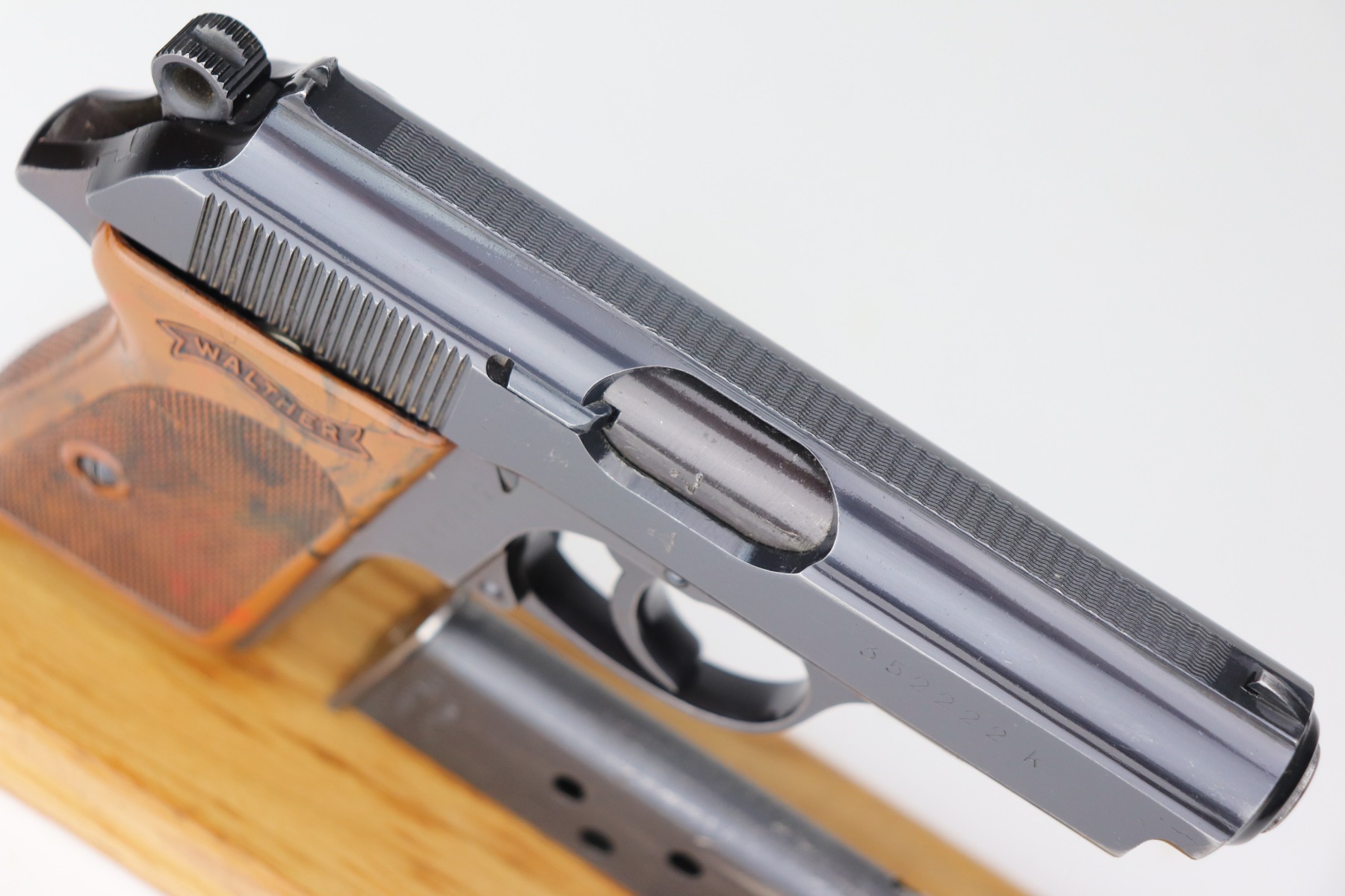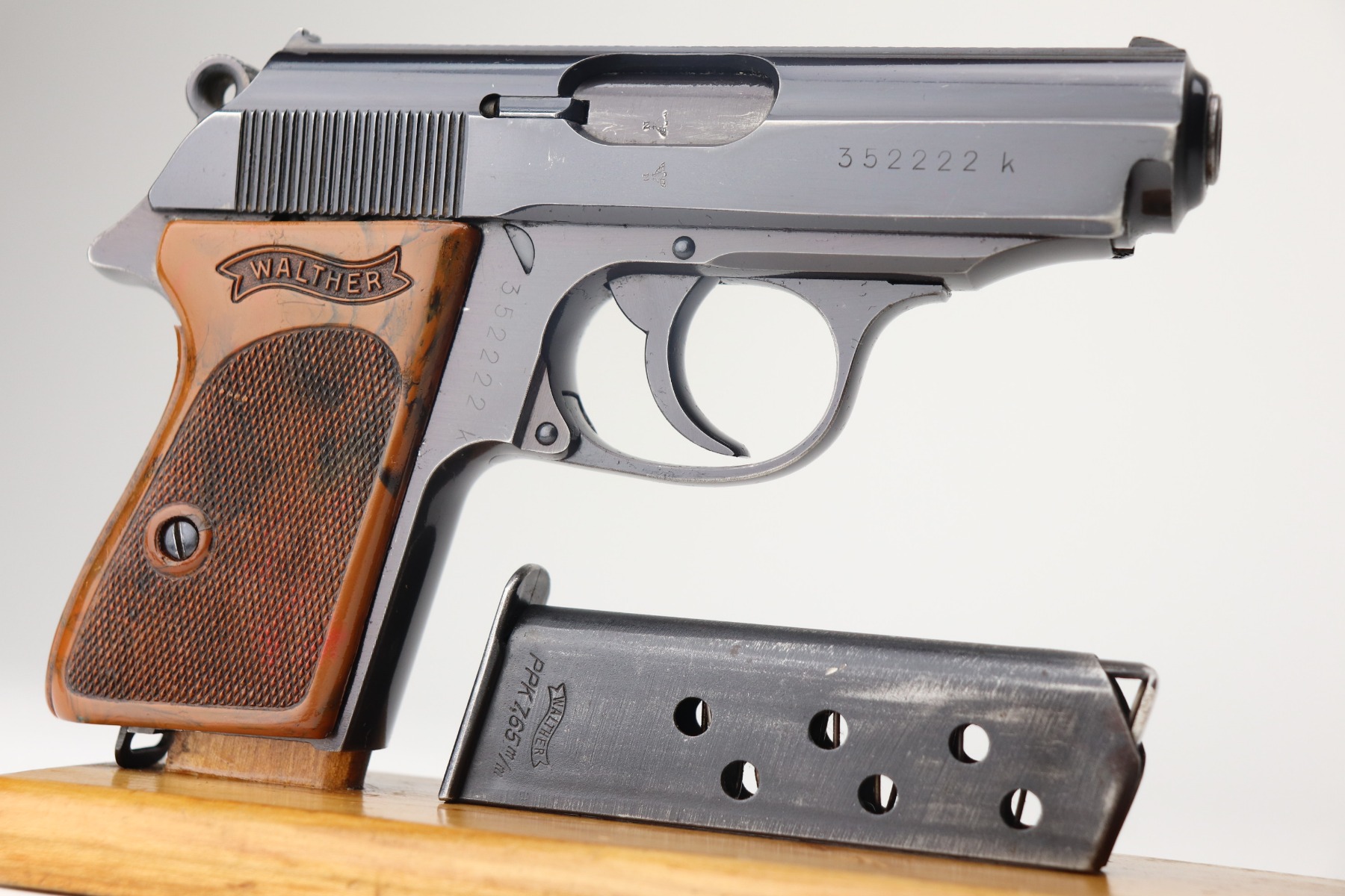 2/15/21 – This is a minty example of a Walther PPK issued to the Nazi police force in 1941. It is all matching and has the proper police “Eagle C” proof. It has retained about 98% of its original bluing with just a hint of wear around the muzzle. It comes with an excellent brown grip and a wartime magazine. The bore is minty.
