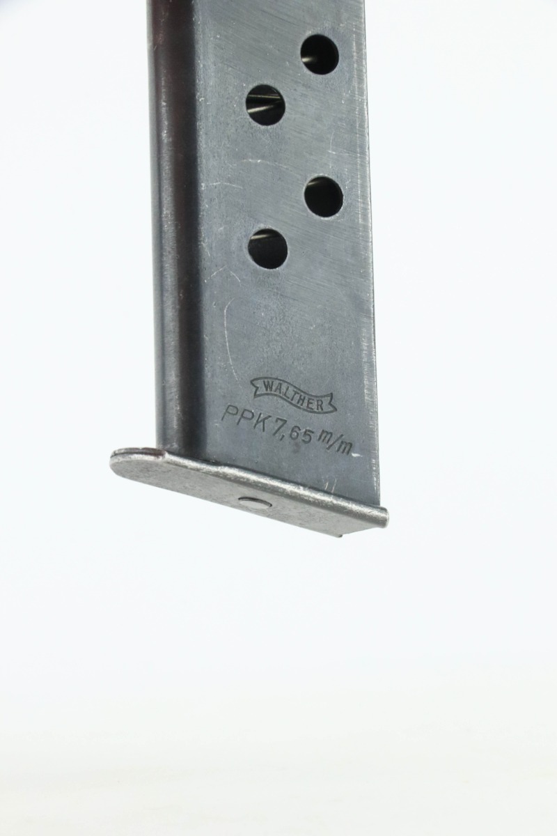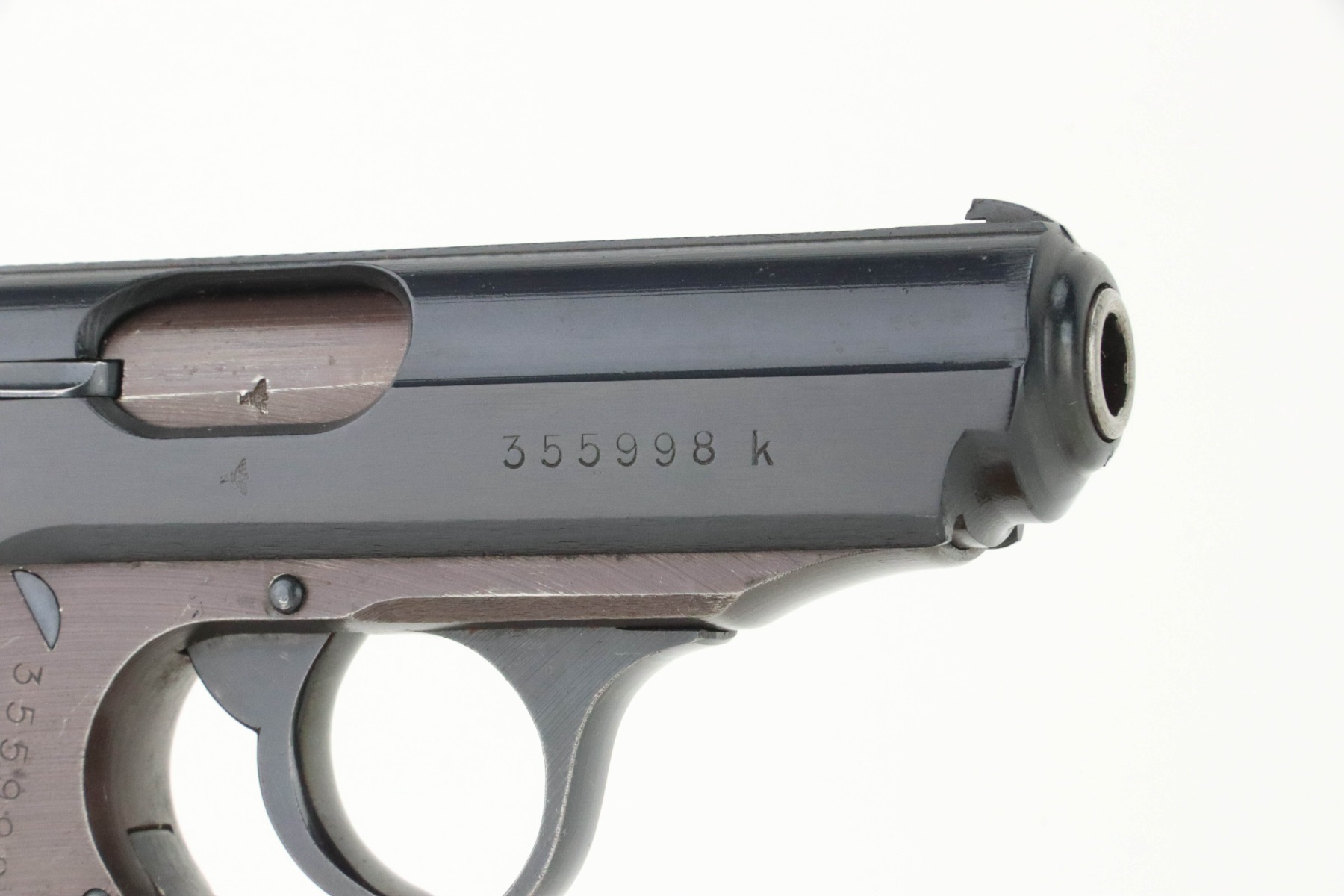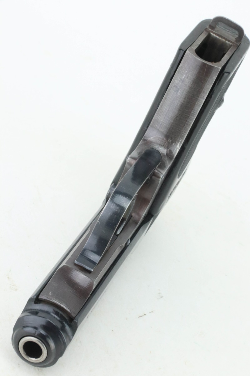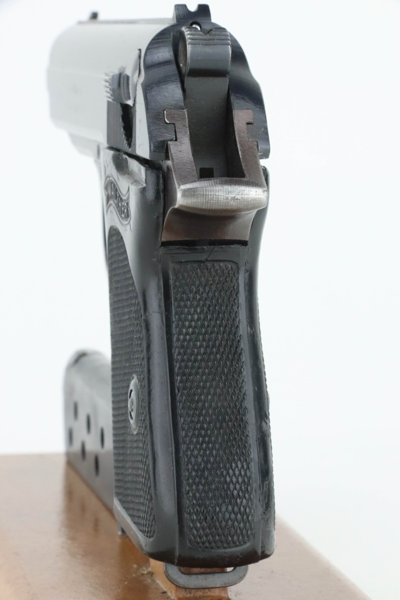 8/26/24 – This is a near-mint example of a Walther PPK issued to the Nazi police force in 1942. It is all matching with the proper police “Eagle C” marking on the left side of the frame. This one comes fitted with a nice black bakelite grip. The bluing on the frame has a really nice plum-colored tint to it. The gun has retained nearly all of its original finish with just some very minor thinning on the front strap. Comes with a proper wartime magazine. Near-mint bore.