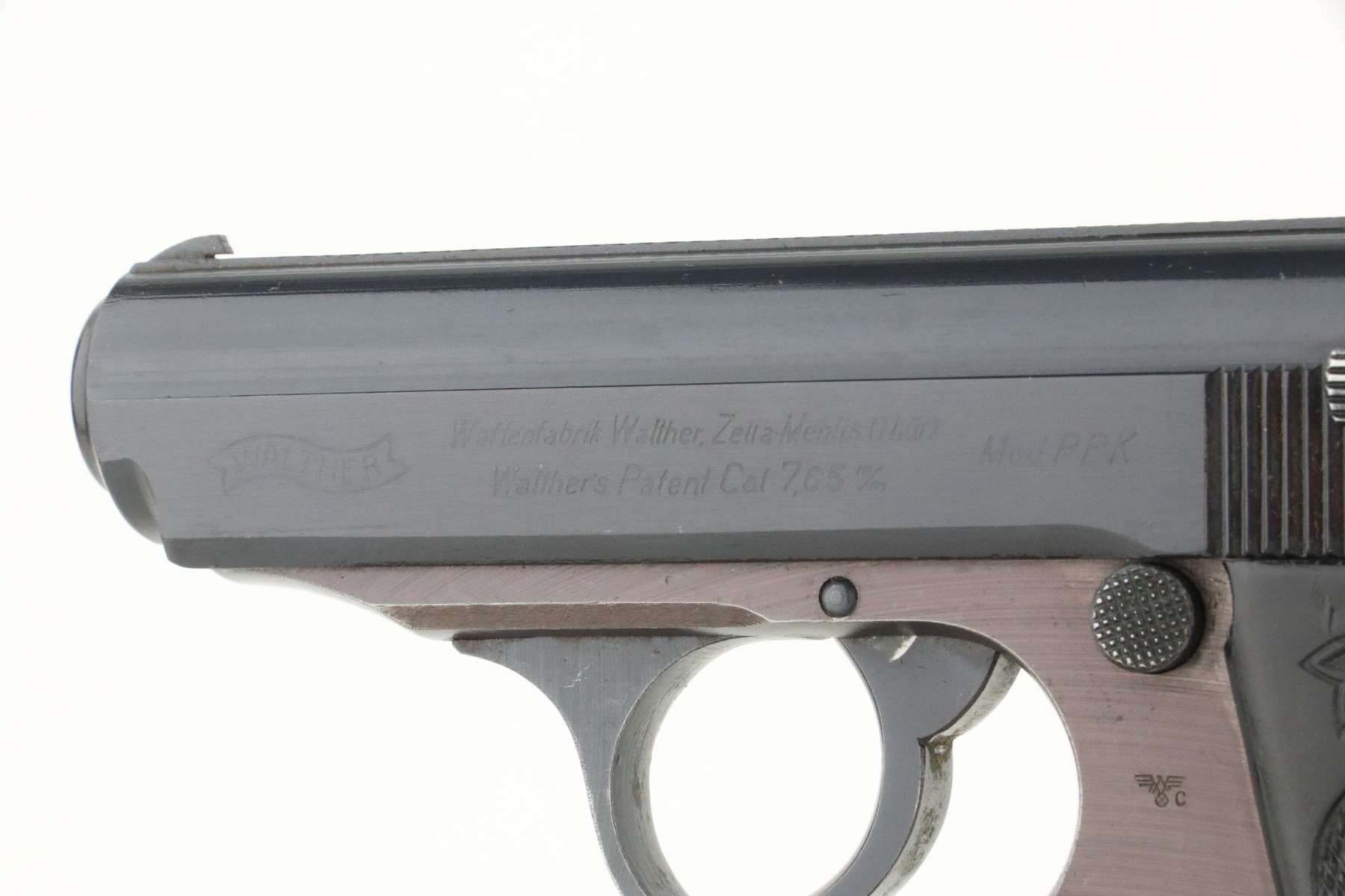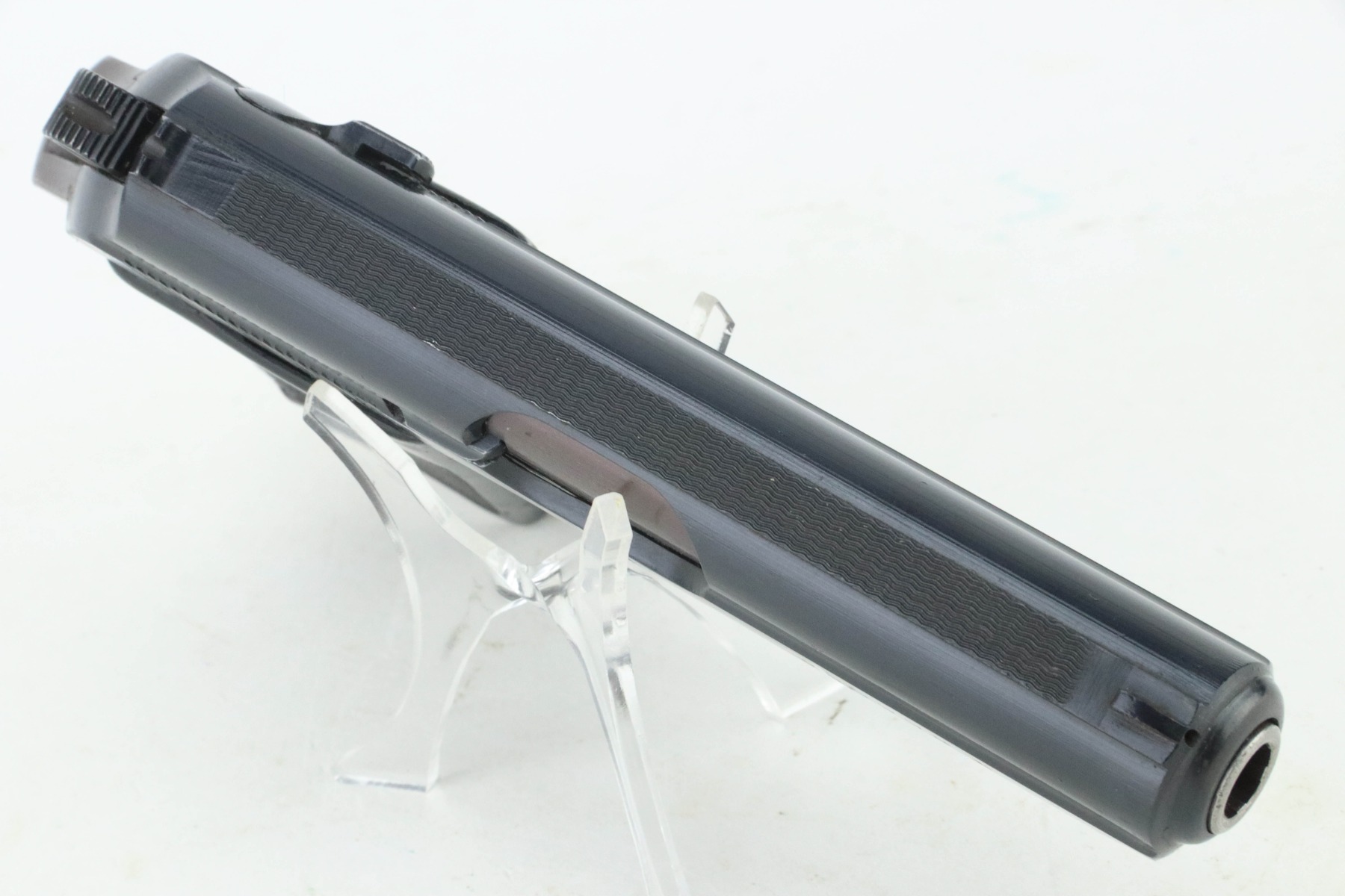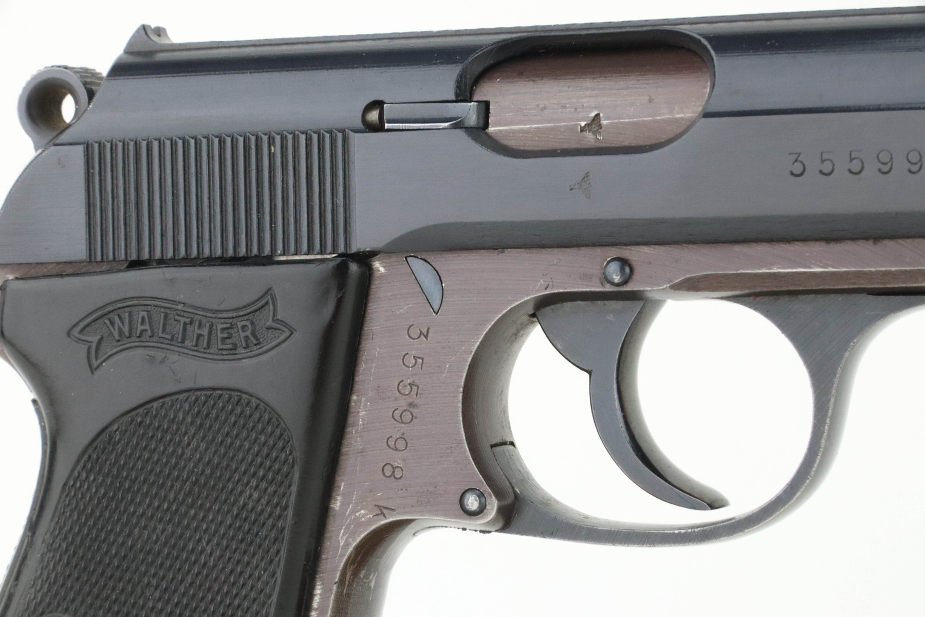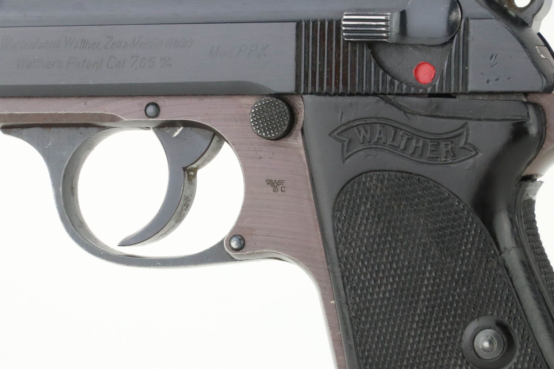 8/26/24 – This is a near-mint example of a Walther PPK issued to the Nazi police force in 1942. It is all matching with the proper police “Eagle C” marking on the left side of the frame. This one comes fitted with a nice black bakelite grip. The bluing on the frame has a really nice plum-colored tint to it. The gun has retained nearly all of its original finish with just some very minor thinning on the front strap. Comes with a proper wartime magazine. Near-mint bore.