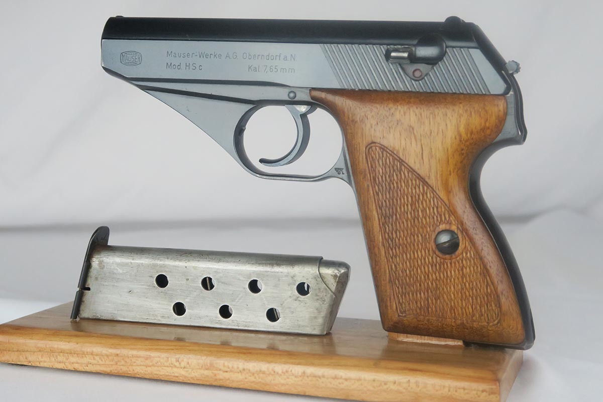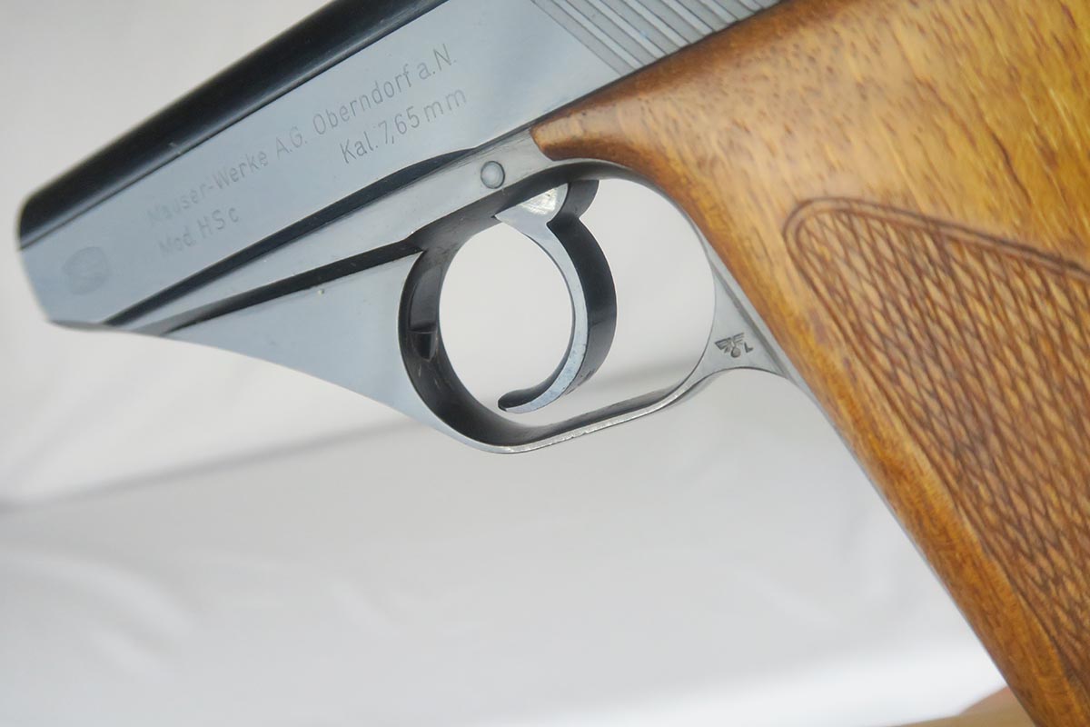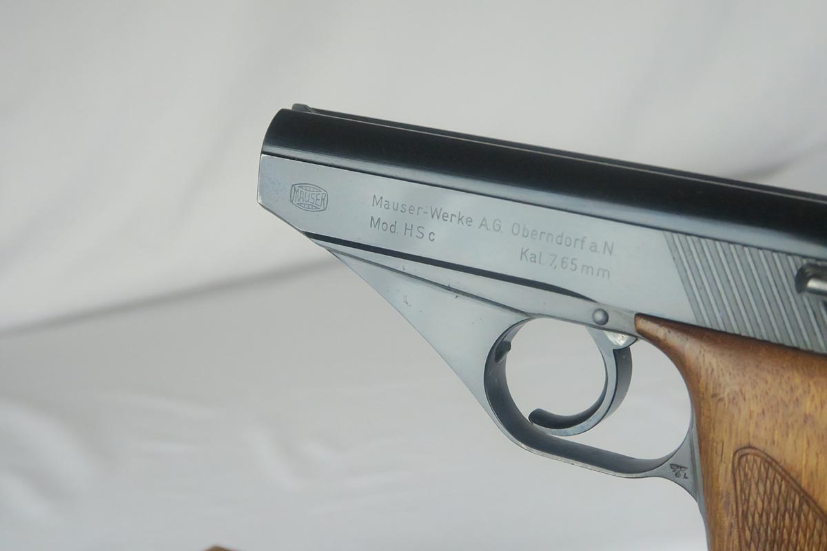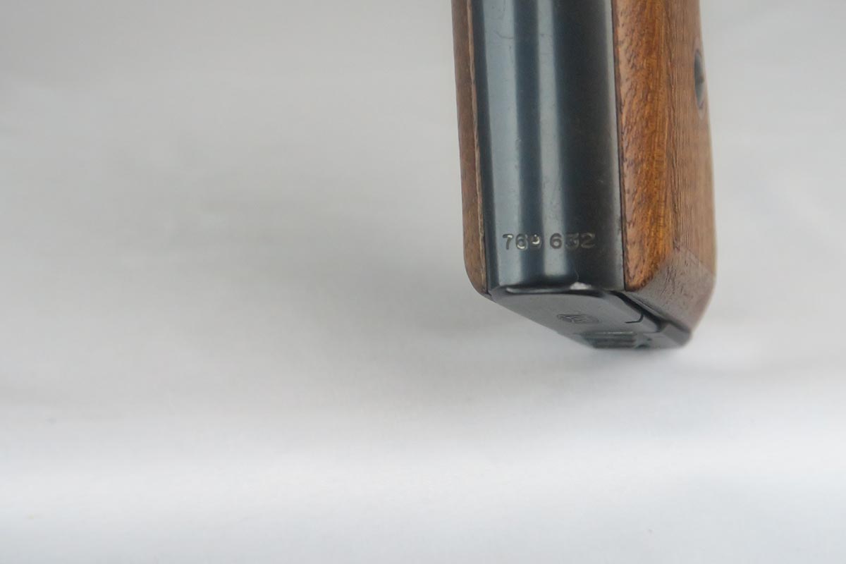 1/24/18 – This is a scarce and minty Police Mauser HSc – variation 1.  There were only ~10,000 of this variation produced, with Eagle/L proof on trigger guard and high-polish finish.  The bluing rates at 98+% with minor thinning on the straps.  The wood grips are minty and so is the Mauser banner magazine.  Excellent bore.
